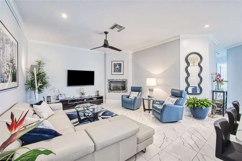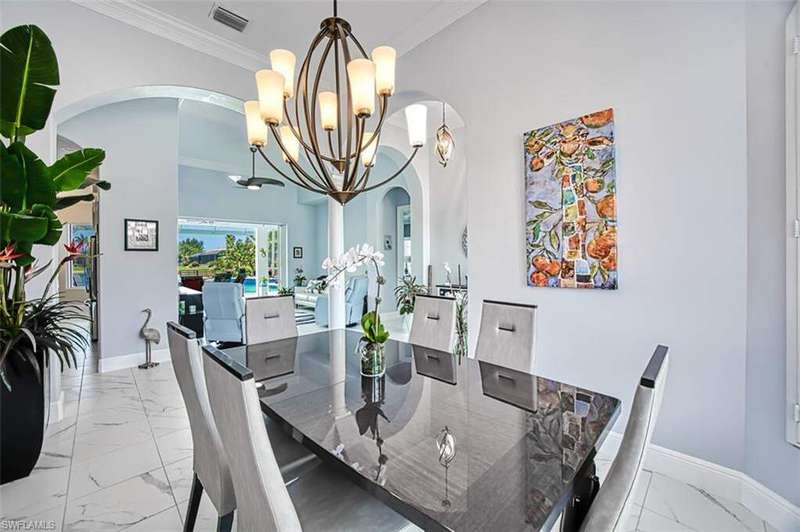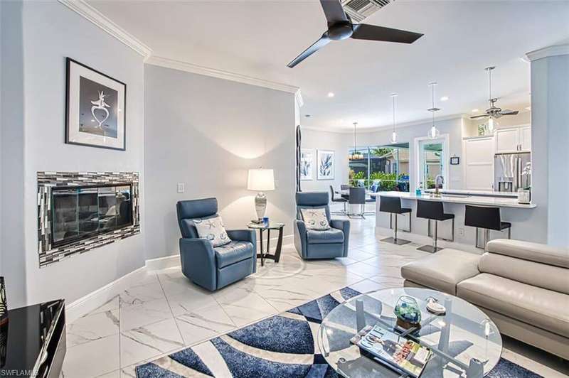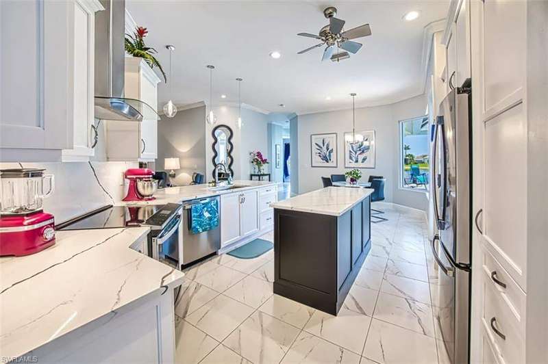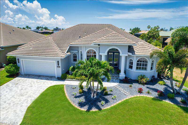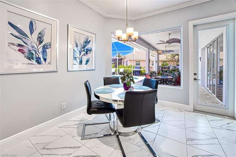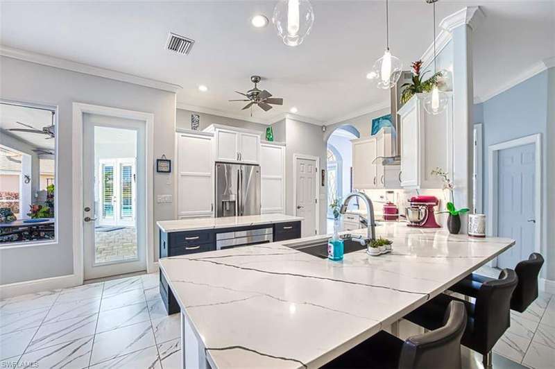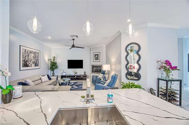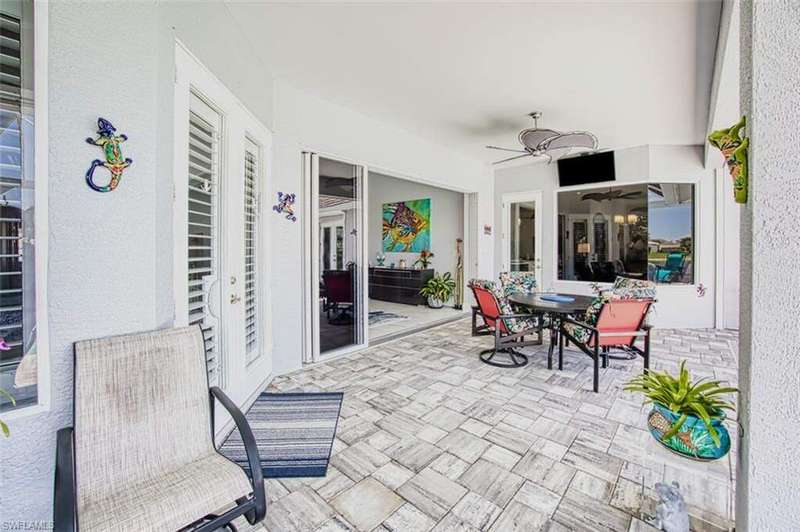 Welcome to your dream waterfront home with southern exposure in Southwind Preserve! This stunning single family home boasts 4 bedrooms, 3 bathrooms, and a 2 car garage, providing ample space for you and your family. The salt water pool is perfect for relaxing on hot summer days, while the waterfront location offers beautiful views and a sense of tranquility. Southwind is located close to Sanibel, Captiva Islands and Ft Myers Beach. The recently remodeled interior features quartz countertops, wood cabinets with undercounter lighting, stainless steel appliances, tile flooring, modern lighting, plantation shutters along with a cozy fireplace in the adjoining family room, wholehouse intercom/stereo system all creating a modern and inviting atmosphere. The recently replaced pool/lanai enclosure features a picture window overlooking the lake and fountain provides peace of mind and added luxury. Lanai has elec, ventilation and water to add summer kitchen. With fabric hurricane protection and hurricane doors, you can rest easy knowing your home is safe and secure during storm season. The salt water pool was recently renovated with a diamond brite finish and has a heater for perfect year-round enjoyment, while the upgraded master closets and crown molding throughout add a touch of elegance. Tile roof was replaced in 2019. The garage features over the garage door shelving for extra storage and the floor has been upgraded with Tidal Wave full chip polyurea concrete floor coating system. All this, plus, the home comes with a transferrable FEMA flood insurance, so you can feel confident in your investment. Don't miss out on this incredible opportunity to own a truly exceptional home in Southwind Preserve! Home is located close to the Down Town District, fine dining and shopping, our international airport, I75 and so much more. Be sure to view the attached virtual tour to feel how open and spacious the home truly is.