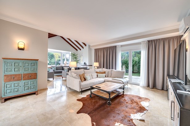 Discover this magnificent 5-bedroom villa in the prestigious Santa Maria Golf area of Elviria, just minutes from the golf course clubhouse and a short walk to Elviria town centre and the beach. Offering panoramic sea views from the first floor, plus an abundance of privacy, this home combines modern luxury with Mediterranean charm, boasting a stunning architectural design and pristine outdoor spaces. Its prime location provides both tranquillity and convenience, making it a rare gem in one of Marbella’s most desirable areas.Step inside to be greeted by a grand entrance featuring a gallery staircase and a sun-filled orangery courtyard. The expansive open-plan kitchen is equipped with a Tepenyaki grill, double ovens, and a large centre island—perfect for both casual meals and gourmet entertaining.The villa’s living spaces include a vaulted-ceiling double lounge, complete with a formal area featuring a fireplace, as well as a relaxed TV area that opens onto the terrace, pool, and gard