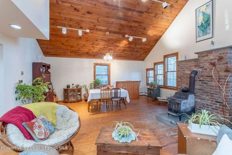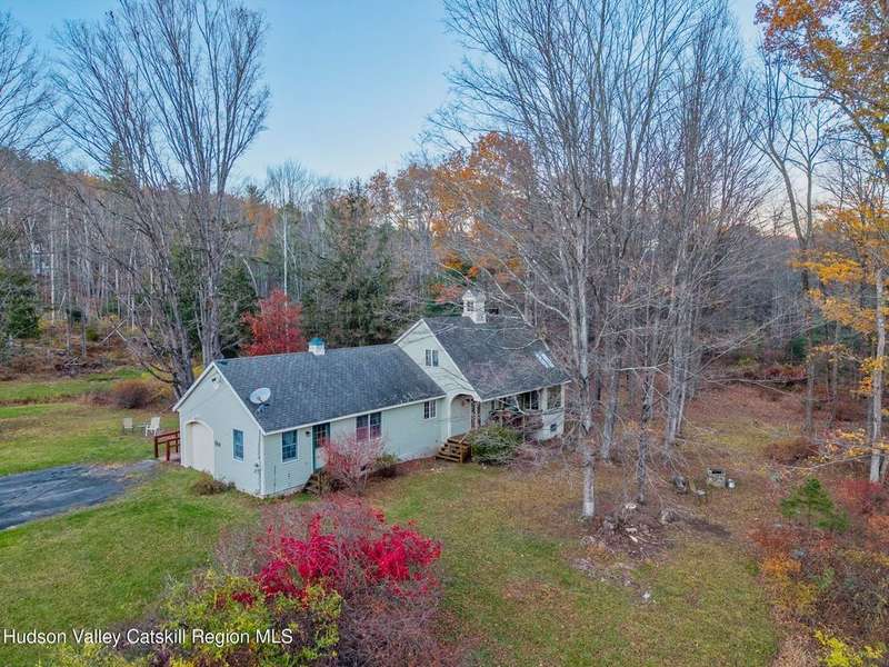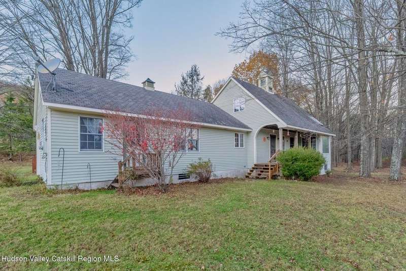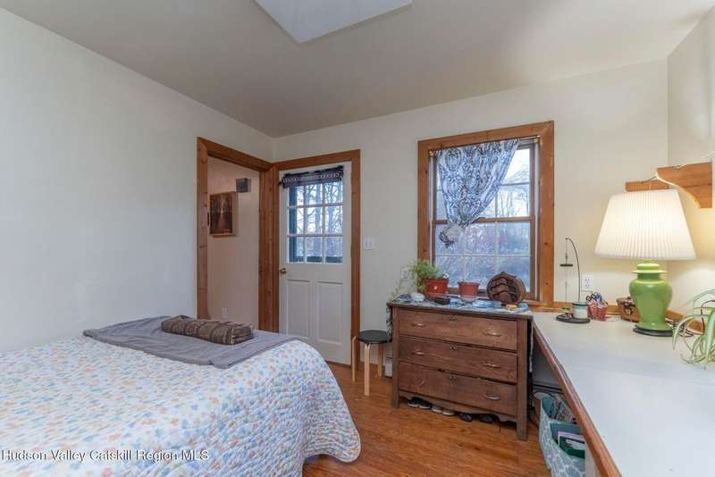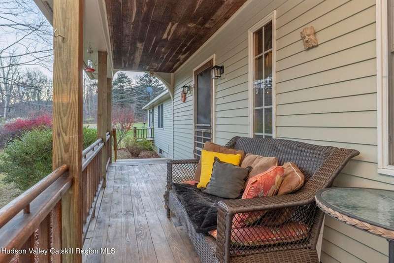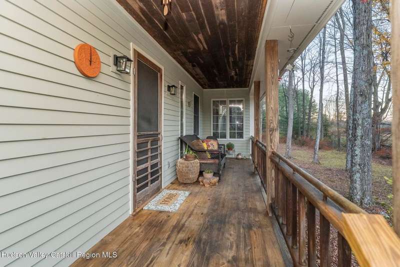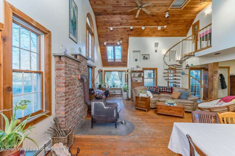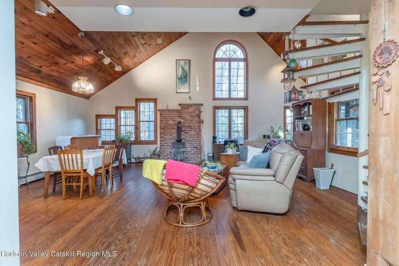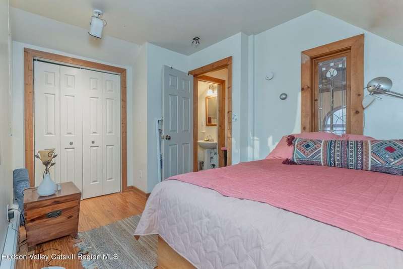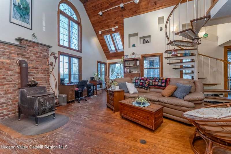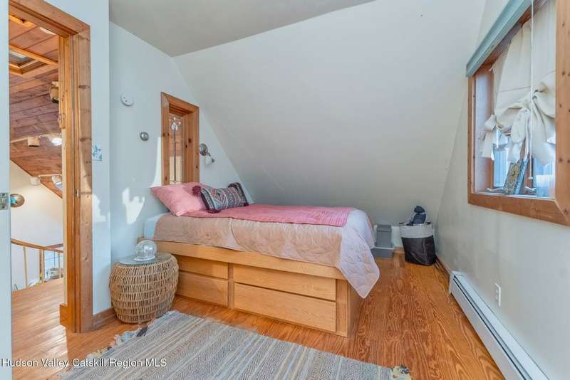 Nestled in the Catskill Mountains, the small Hamlet of West Shokan sits in Watson Hollow at the base of South Mountain and Samuels Point where the Bushkill and Drybrook converge and enter into the picturesque Ashokan Reservoir. This beautiful little town is bordered by the vast acreage that surrounds the reservoir and has retained its rural character and charm for generations. On the approach to this home, you'll cross over the creeks and notice the mountains at every turn. This special home was custom built and architecturally designed with attention given to create not only whimsy and charm but bring in the natural light and volume to the gathering spaces. The Cathedral Ceilings are adorned with wood planks and flooring is a random-width solid heart-pine giving the room a warm, homey feeling. Plus, there's a woodstove with hearth and real brick firewall. You'll love the architectural design details such as the wall niches for displaying a favorite art piece and the corner window nook area which is perfect for cozying up with a book on a comfy chair, growing some indoor plants or just gazing out the window any time of year. The spiral staircase is a stylish and unique feature allowing the natural light to flow through the spaces; it contains oak stair treads and is wide enough to easily navigate with a comfortable cadence. The downstairs bedroom has an attached room with a separate entrance door to the outside which creates a perfect situation for a small office. Don't forget to check out the lovely covered front porch which overlooks the charming, partially shaded and serene lot as well as the neighboring large meadow. This property is surrounded on three sides by approximately 100 aces of Conserved Land. A view of South Mountain is enjoyed from some areas of the property as well. Other features include an adorable little shed perfect for firewood and your tools, an attached garage to keep your car dry and clear of snow during the winter, a wheelchair ramp to the backdoor and a spacious laundry area on the first level. You'll fall in love with this charming home, so full of character and warmth....it's the perfect country retreat or full -time residence. Some little gems nearby include: Davis Park within walking distance with ballfield, basketball court, the town Pool and pavilion; the Olive Free Library and the High Point Trailhead for local hiking, just a short drive up the road. You can also enjoy the Ashokan Rail Trail in Boiceville which is great for a leisurely walk or bike ride alongside the shady banks of the Ashokan Reservoir and the Esopus Creek; the views are gorgeous! Not to be outdone, is the Ashokan Promenade where you can take in the vast wide--open views of the stunning Ashokan Reservoir with the Catskill Mountain range as it's backdrop....it never gets old!! What a way to live, enjoying nature every day with a small-town relaxing vibe! Come take a look, you will love this exceptional offering, it's truly a rare find!