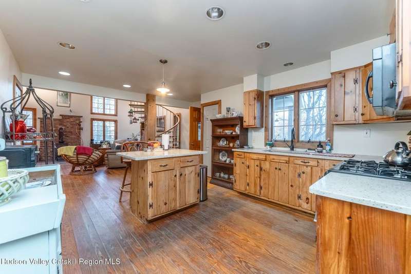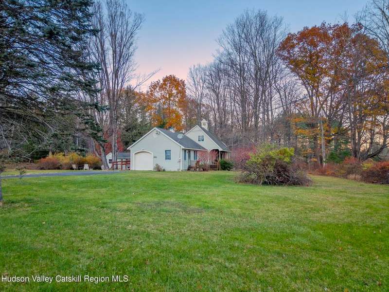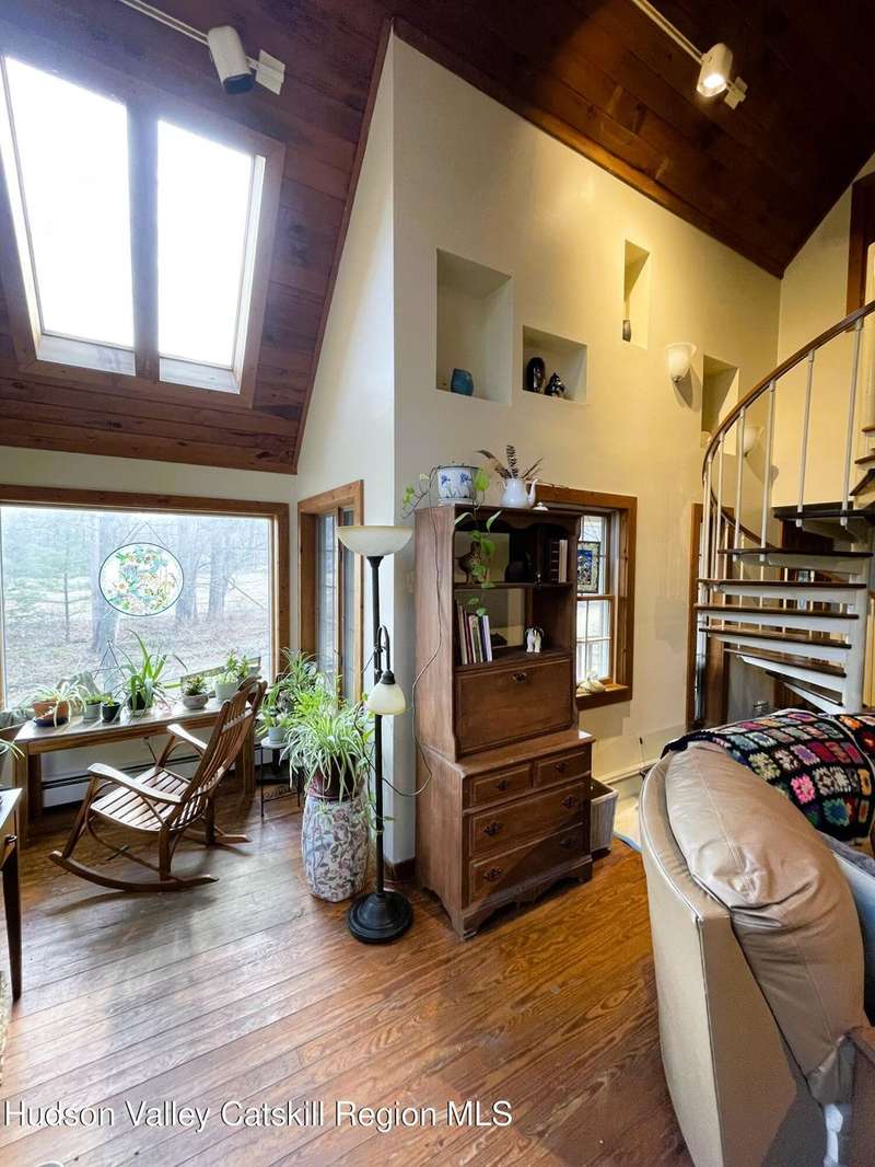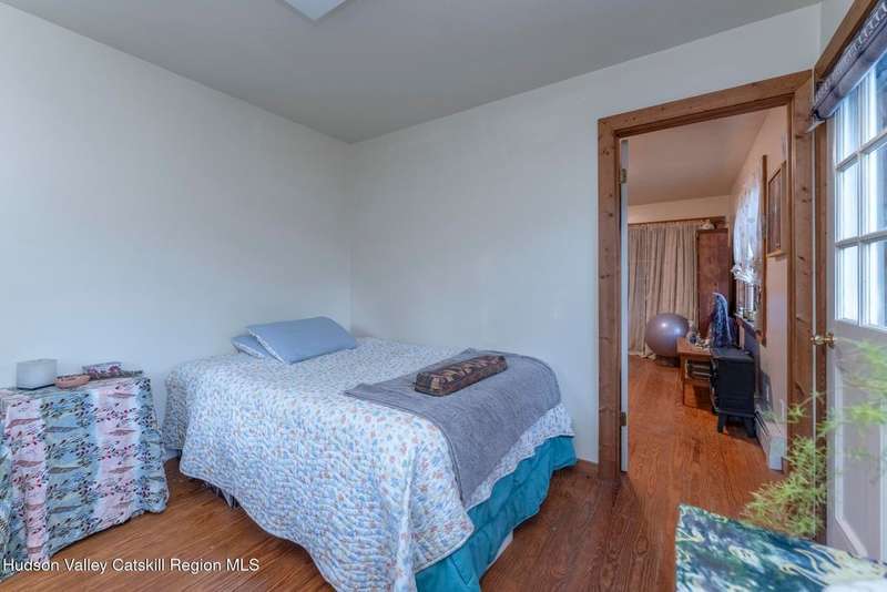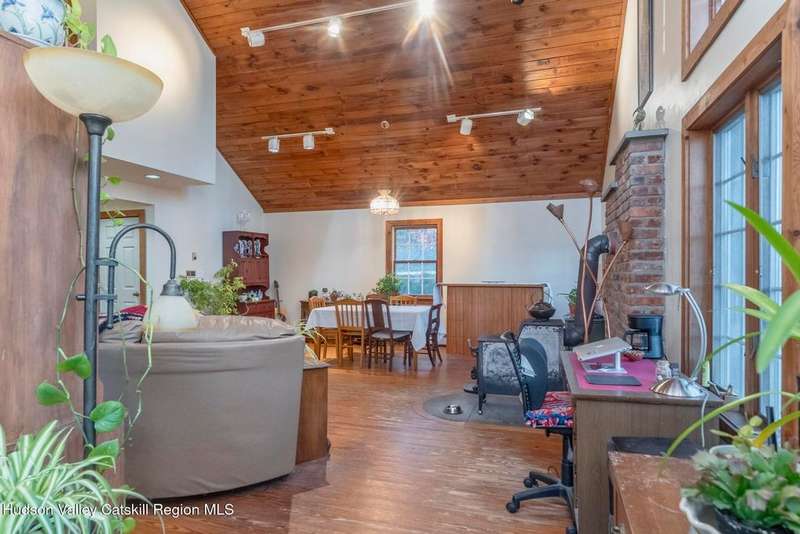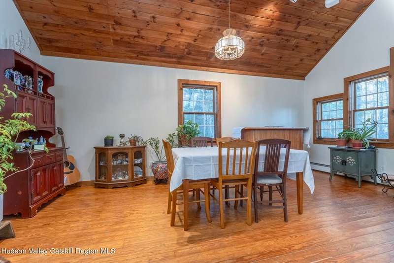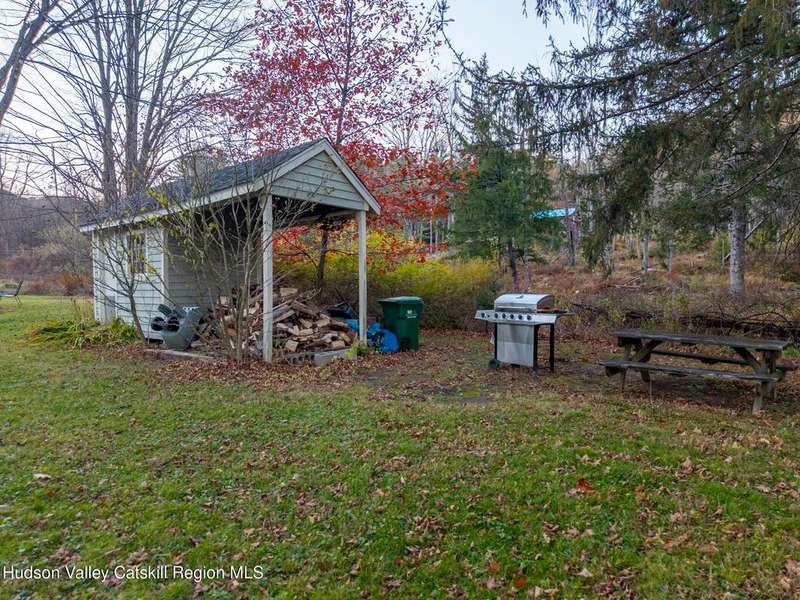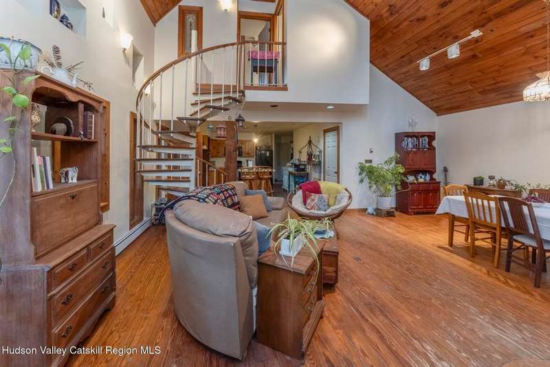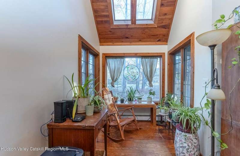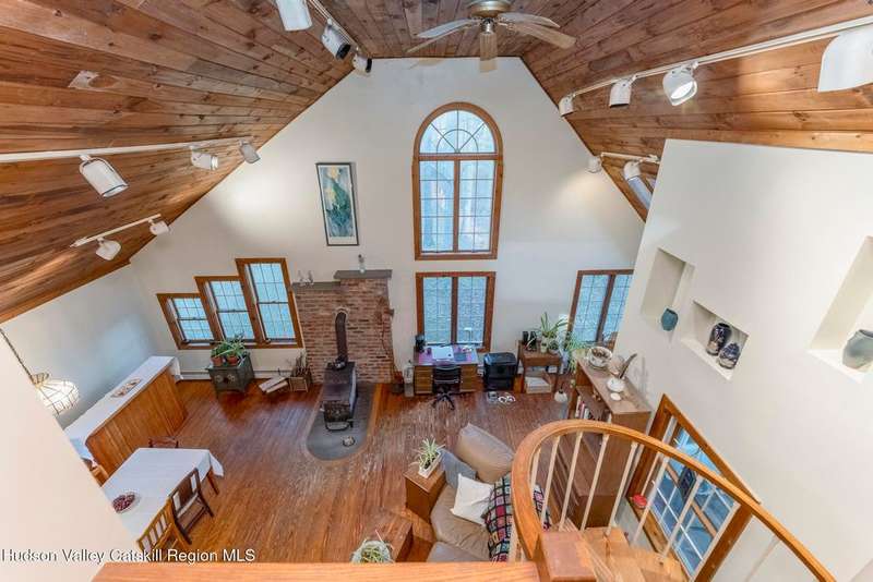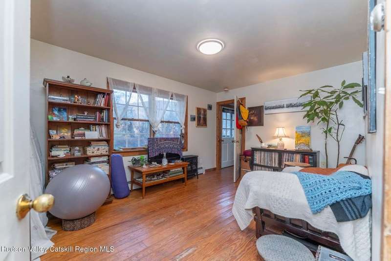 Nestled in the Catskill Mountains, the small Hamlet of West Shokan sits in Watson Hollow at the base of South Mountain and Samuels Point where the Bushkill and Drybrook converge and enter into the picturesque Ashokan Reservoir. This beautiful little town is bordered by the vast acreage that surrounds the reservoir and has retained its rural character and charm for generations. On the approach to this home, you'll cross over the creeks and notice the mountains at every turn. This special home was custom built and architecturally designed with attention given to create not only whimsy and charm but bring in the natural light and volume to the gathering spaces. The Cathedral Ceilings are adorned with wood planks and flooring is a random-width solid heart-pine giving the room a warm, homey feeling. Plus, there's a woodstove with hearth and real brick firewall. You'll love the architectural design details such as the wall niches for displaying a favorite art piece and the corner window nook area which is perfect for cozying up with a book on a comfy chair, growing some indoor plants or just gazing out the window any time of year. The spiral staircase is a stylish and unique feature allowing the natural light to flow through the spaces; it contains oak stair treads and is wide enough to easily navigate with a comfortable cadence. The downstairs bedroom has an attached room with a separate entrance door to the outside which creates a perfect situation for a small office. Don't forget to check out the lovely covered front porch which overlooks the charming, partially shaded and serene lot as well as the neighboring large meadow. This property is surrounded on three sides by approximately 100 aces of Conserved Land. A view of South Mountain is enjoyed from some areas of the property as well. Other features include an adorable little shed perfect for firewood and your tools, an attached garage to keep your car dry and clear of snow during the winter, a wheelchair ramp to the backdoor and a spacious laundry area on the first level. You'll fall in love with this charming home, so full of character and warmth....it's the perfect country retreat or full -time residence. Some little gems nearby include: Davis Park within walking distance with ballfield, basketball court, the town Pool and pavilion; the Olive Free Library and the High Point Trailhead for local hiking, just a short drive up the road. You can also enjoy the Ashokan Rail Trail in Boiceville which is great for a leisurely walk or bike ride alongside the shady banks of the Ashokan Reservoir and the Esopus Creek; the views are gorgeous! Not to be outdone, is the Ashokan Promenade where you can take in the vast wide--open views of the stunning Ashokan Reservoir with the Catskill Mountain range as it's backdrop....it never gets old!! What a way to live, enjoying nature every day with a small-town relaxing vibe! Come take a look, you will love this exceptional offering, it's truly a rare find!
