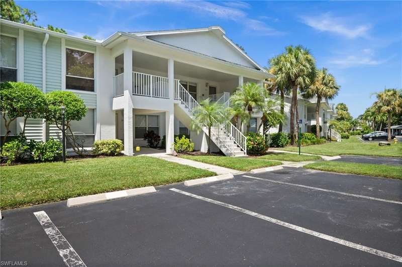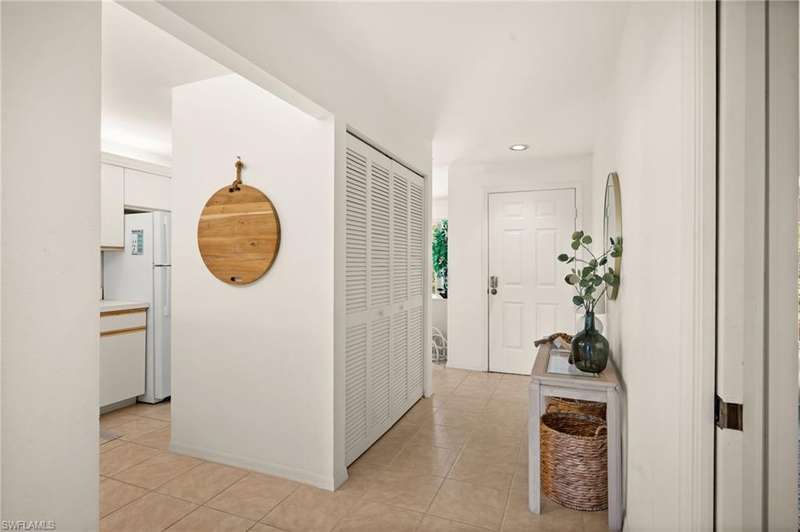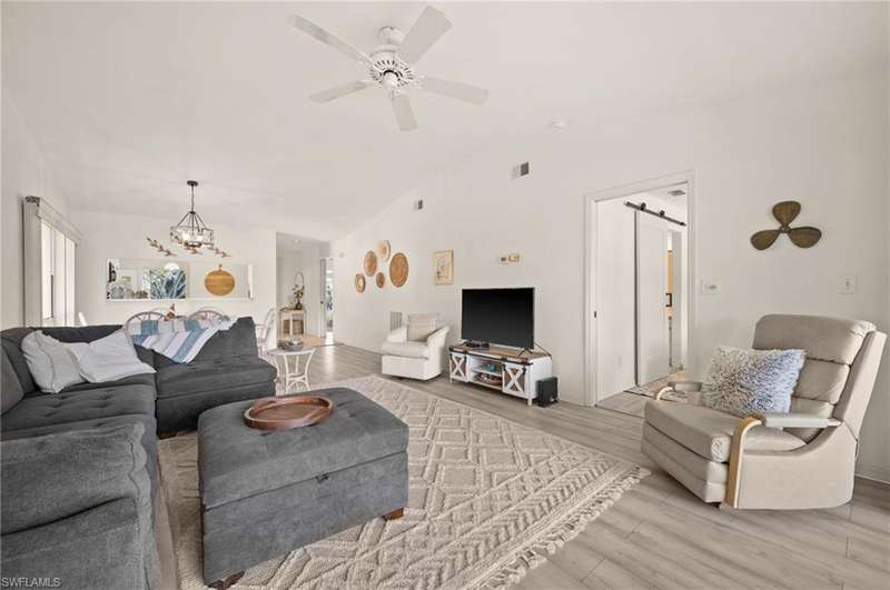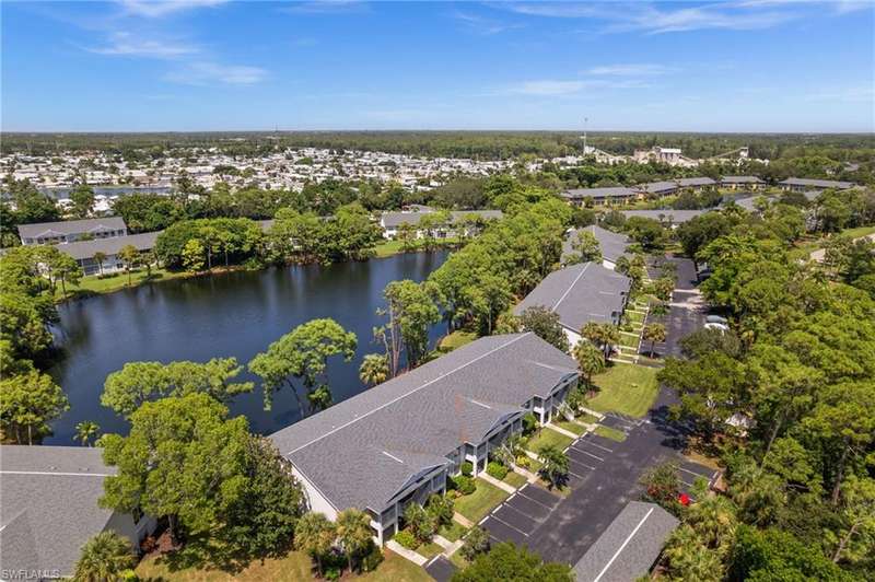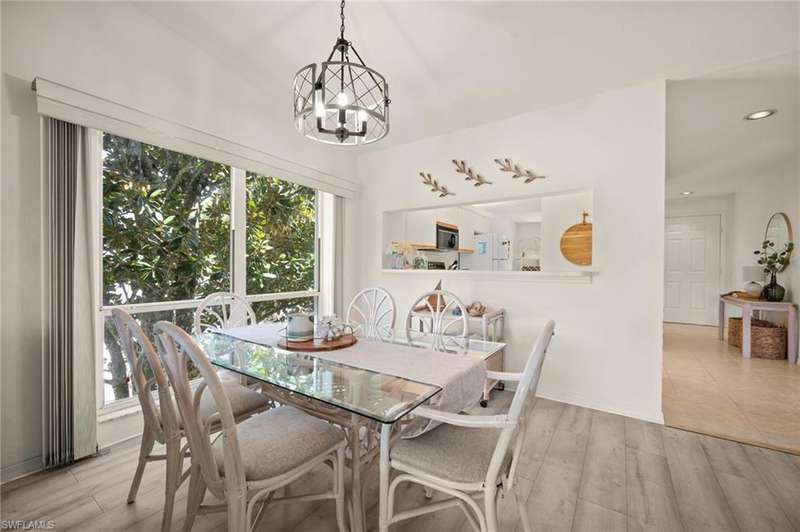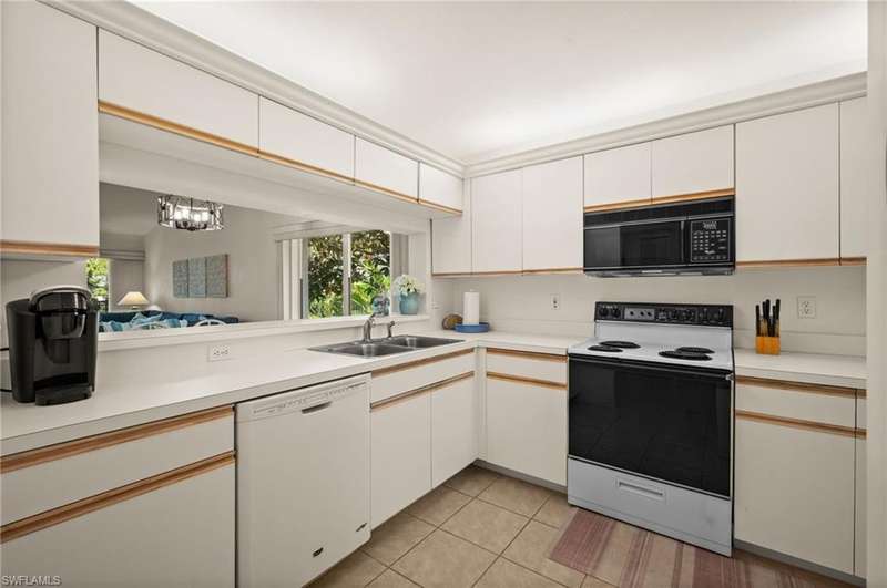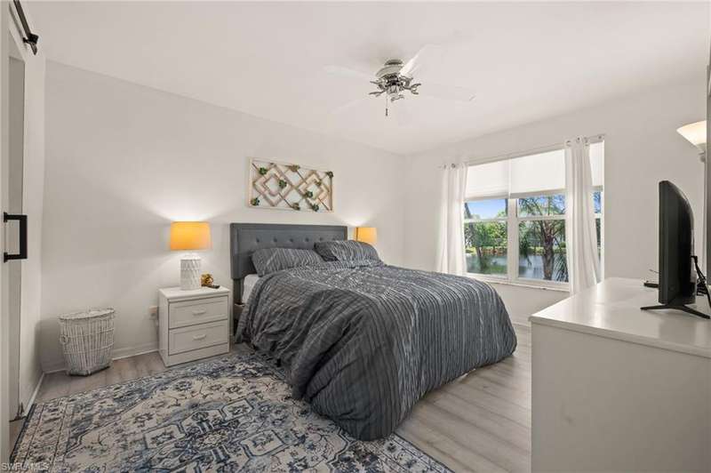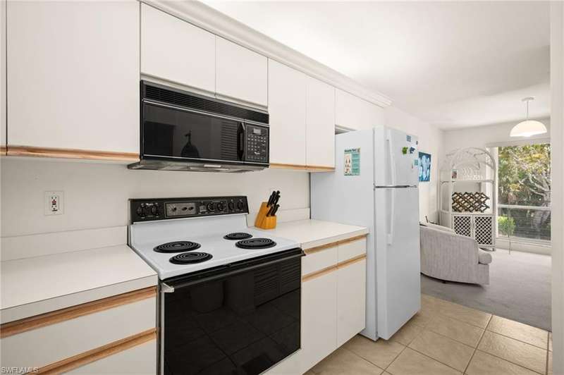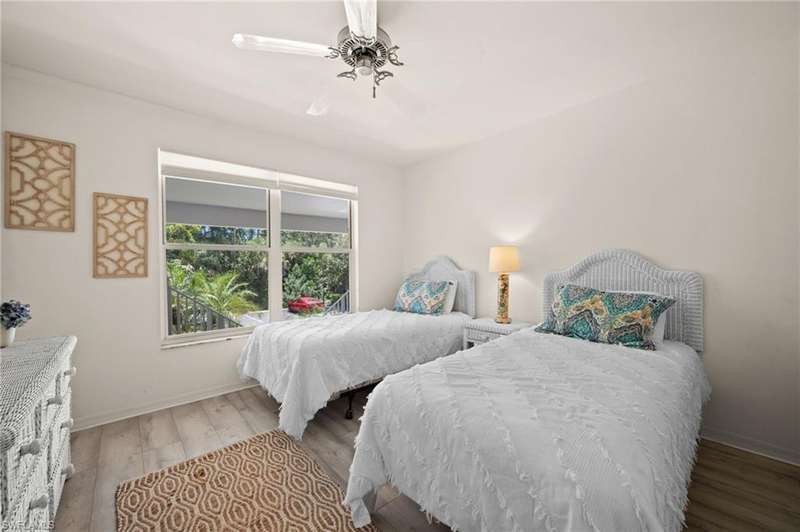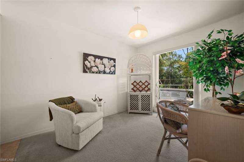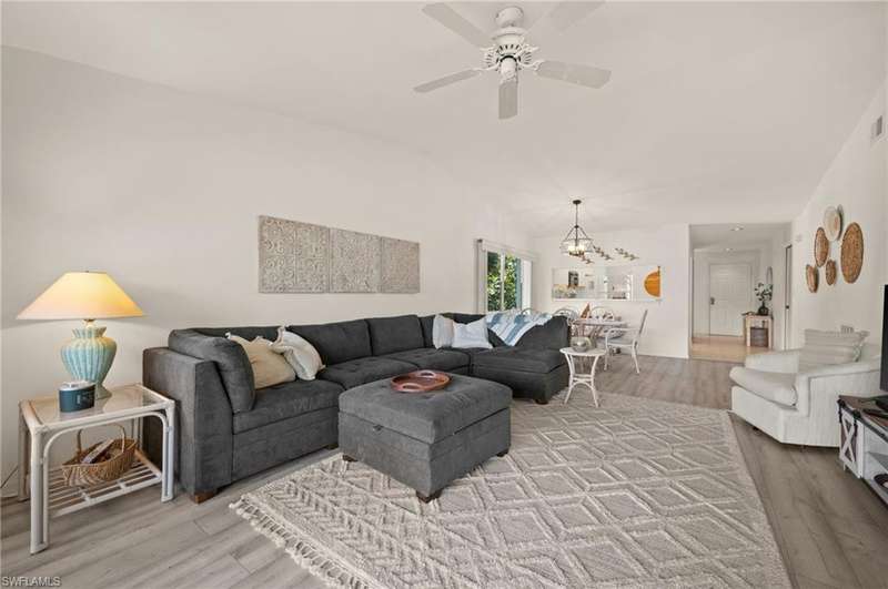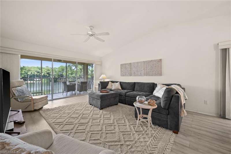 Turnkey 2-bedroom plus den, 2-bath second-floor, end unit condo with 1,370 sq. ft. in Westgate at Imperial Golf Estates. This well-maintained home includes an entryway leading to a den with carpet and furnished with a desk and accent chair, perfect for a home office or flex space. The kitchen offers ample cabinet storage with crown molding, a large pantry, and opens to a dining area highlighted by large windows. The living room features a sectional sofa, accent furnishings, and wide glass sliders that fill the space with natural light and lead to the screened lanai with peaceful lake views. The spacious primary suite includes a bed set with nightstands and dresser, along with an en-suite bath featuring a walk-in shower and linen closet. A guest bedroom with double beds and an additional full bath provide comfort for family or visitors. Luxury vinyl tile flooring extends through the living and dining areas as well as bedrooms, with ceiling fans throughout. Additional conveniences includ