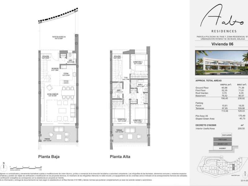Aalto Residences is a brand-new development offering 13 unique townhouses just minutes away from Marbella. The name, Aalto, is Finnish for "wave" and was inspired by the elegant Scandinavian design which blends harmoniously with the surrounding nature and the stylish curved façade of the buildings. This south-facing, energy-efficient home enjoys panoramic sea views and breathtaking sunsets from the rooftop terrace and is situated next to a green area with beautiful trees and a little park where you can walk and enjoy the fresh sea breeze. The house measures 238 m² and boasts an additional 114 m² of outdoor space, between the porches, and terraces. Stepping inside this 3-bedroom home, we are immediately aware that the highest quality materials have been used. The living area is bright and serene, while the minimalist design, straight line "open" kitchen with laminated finishes, Dica cabinetry and Siemens appliances is a delight to cook in. The 3 bedrooms and 2 bathrooms are located on the first floor, along with a terrace. Sleek, contemporary bathrooms feature Duravit sanitaryware, Hansgrohe taps and elegant shower screens and finishes. An aerothermal system is installed in the homes for underfloor water heat system, hot water and air conditioning, along with a general home automation system, and all windows and sliding doors in dark grey/black lacquered aluminium. The delightful communal garden has a shared pool to cool off in during the summer, and the owner of each new townhouse may opt for a private jacuzzi pool on the rooftop terrace if they wish. All the houses have a lower ground floor that can be designed for any use the client wishes (gym, sauna, bar, cinema, etc). The properties come with a parking space included in the price, with the option to purchase further spaces if required (various options: sheltered car park space for €15,000 underground car park space with storage room €25,000; this underground car park has a lift) Please contact us for further information.