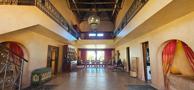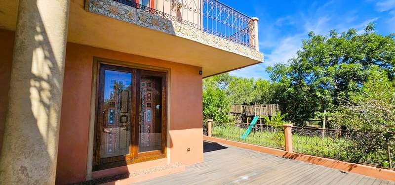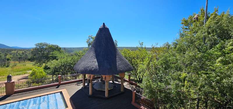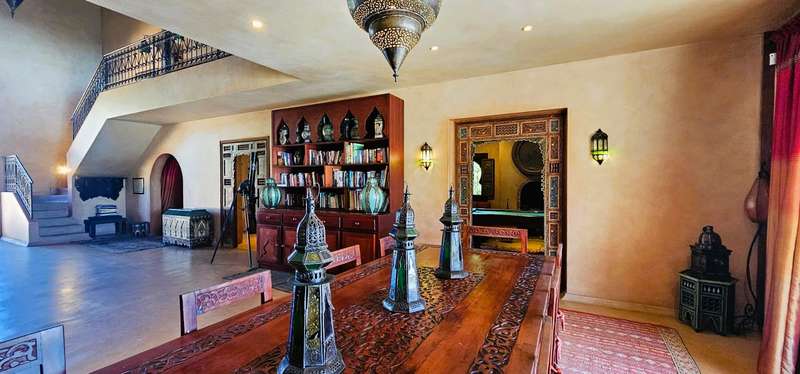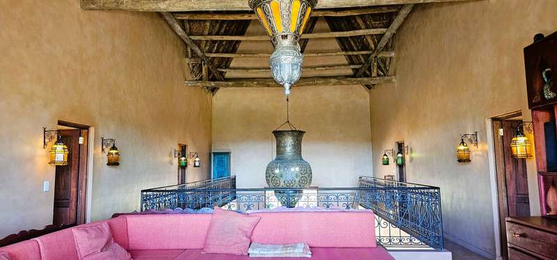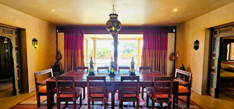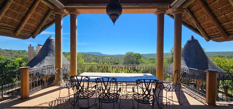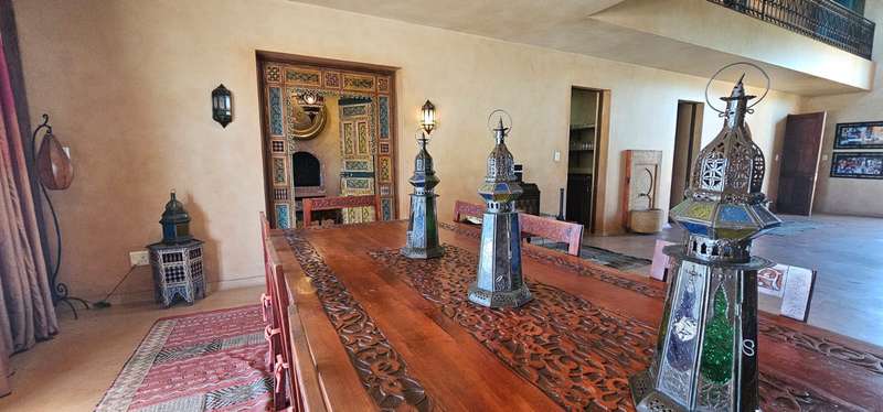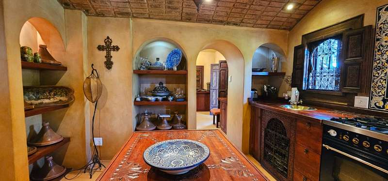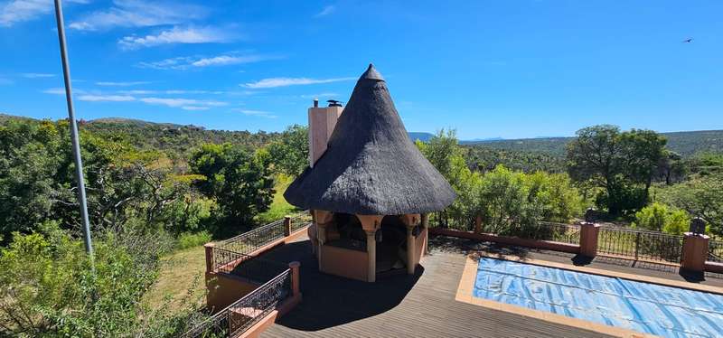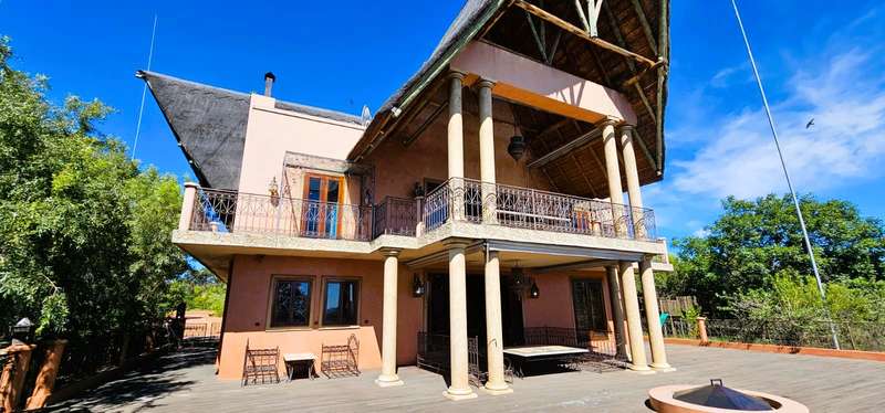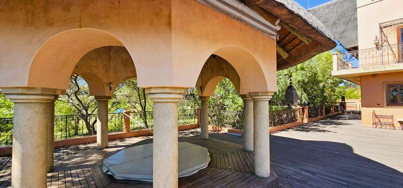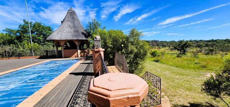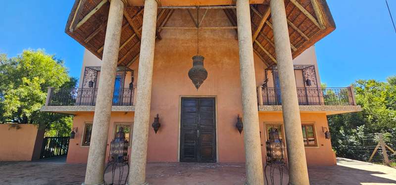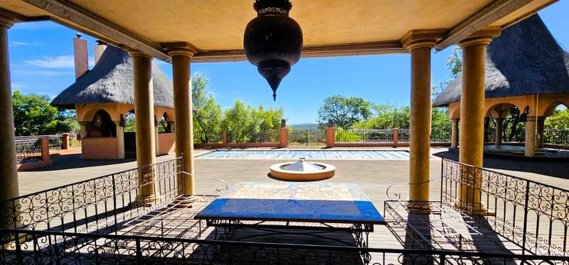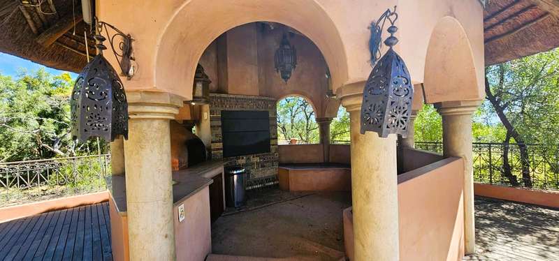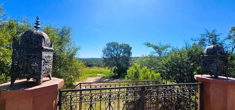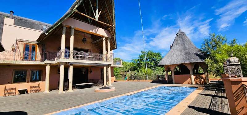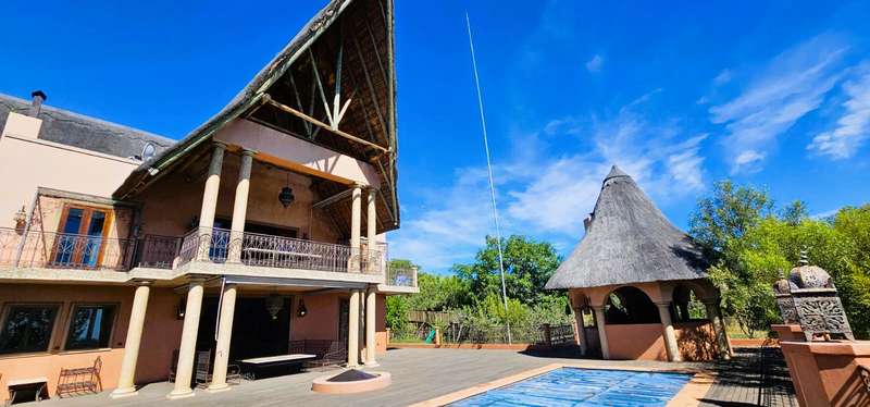 Step into the enchanting world of this Moroccan-inspired haven nestled within the breathtaking Big-5 Mabalingwe Nature Reserve. As you step through the grand entrance, be transported to a realm of opulence and serenity. Two indoor Moroccan daybeds invite you to pause and soak in the lodge's magnificence. The guest bathroom boasts exquisite finishes and a refreshing shower awaits. Enter the expansive open-plan dining and living area, seamlessly connected to a sprawling patio. The ground floor features a remarkable wooden kitchen, complete with a pantry and scullery leading to a charming courtyard play area for little ones. Indulge in a welcome drink from the intimate wine cellar before enjoying a game in the pool room or relaxing by the fireplace in the lounge. Outside, the vast patio offers panoramic views of the bushveld, mountains, and wildlife watering hole. Take a dip in the sparkling pool, unwind in the undercover jacuzzi, or savor a delicious barbecue from the braai area with a pizza oven. Upstairs, prepare to be amazed by four luxurious en-suite bedrooms, two boasting cozy fireplaces and all adorned with loft areas. Moroccan-inspired baths and impeccable finishes adorn each bathroom, while private balconies with traditional louvers provide tranquil retreats. A cozy TV room awaits before stepping onto the expansive balcony, where you can enjoy a well-deserved sundowner as you take in the breathtaking vista. Experience the epitome of Moroccan elegance and be the envy of all with this extraordinary property.