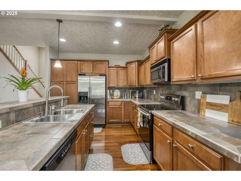 RECENT PRICE REDUCTION! Immaculate-clean-move in ready home. Main level features open entryway with High Ceilings and tile floors. Enormous living room with gas fireplace, carpeted floor and access to the 4th non-conforming bedroom (bonus room). Generous size kitchen with lots of cabinet storage and counter space. It does include all SS appliances in the sale, tile counter tops and hardwood floors. Huge island with sink and eating bar. Formal dining room that leads to a covered patio in the back for your relaxing time. 10x10 office/den on the main level. Upstairs features huge primary suite with vaulted ceilings, walk in closet, full bathroom which includes tile floor, standing shower, jetted tub, and double vanity. Guest bathroom upstairs has double vanity, tile counters and bath tub. Utility room with sink and lots of cabinetry to store all of your laundry supplements. Built in vacuum system through the house. Fully fenced backyard, covered patio. Convenient location. Move in Ready. MUST SEE!