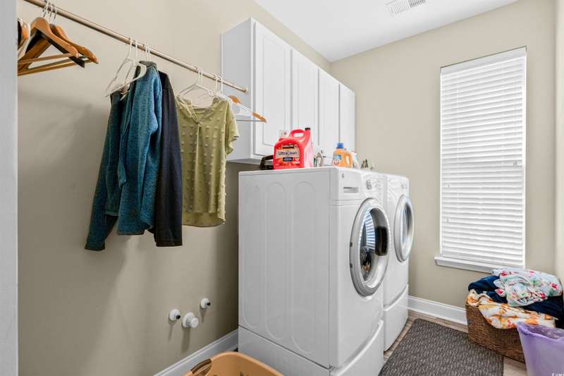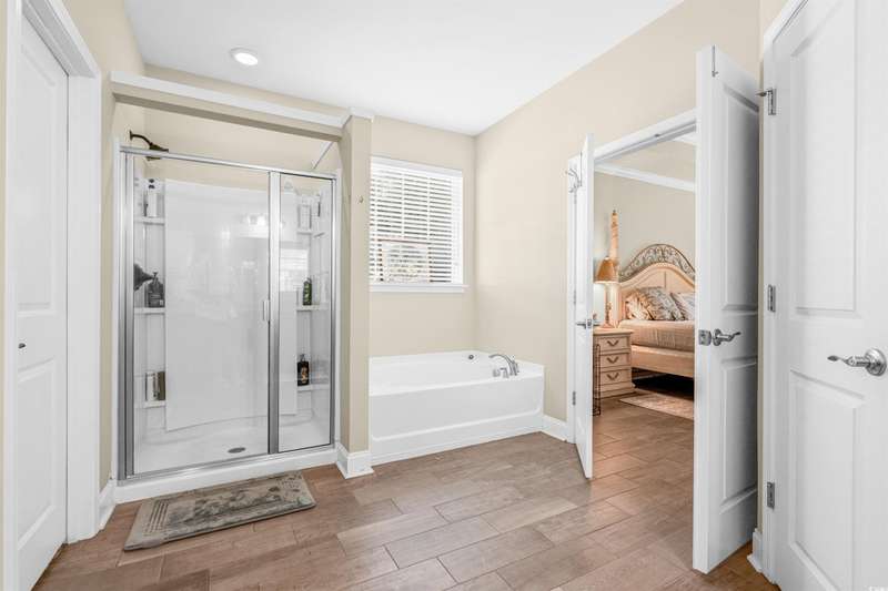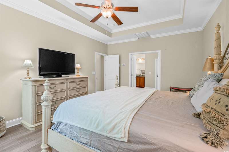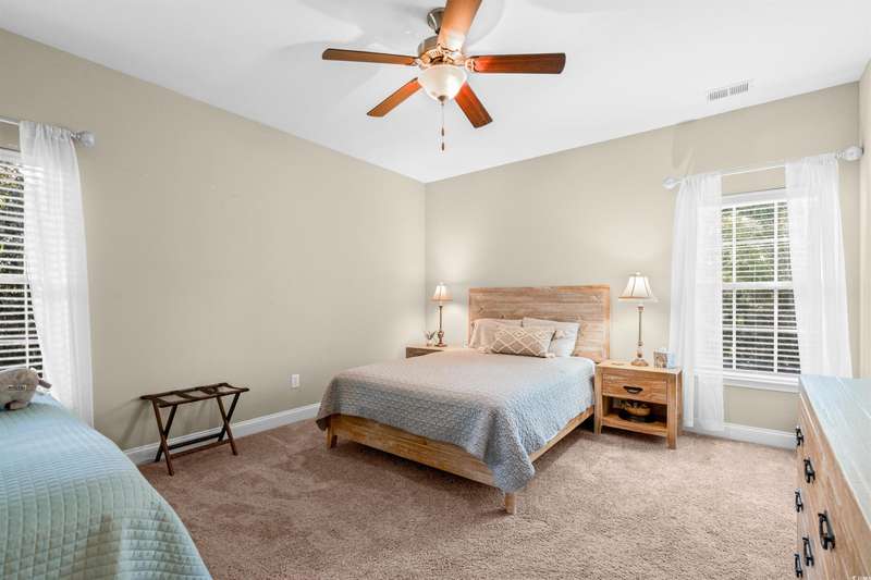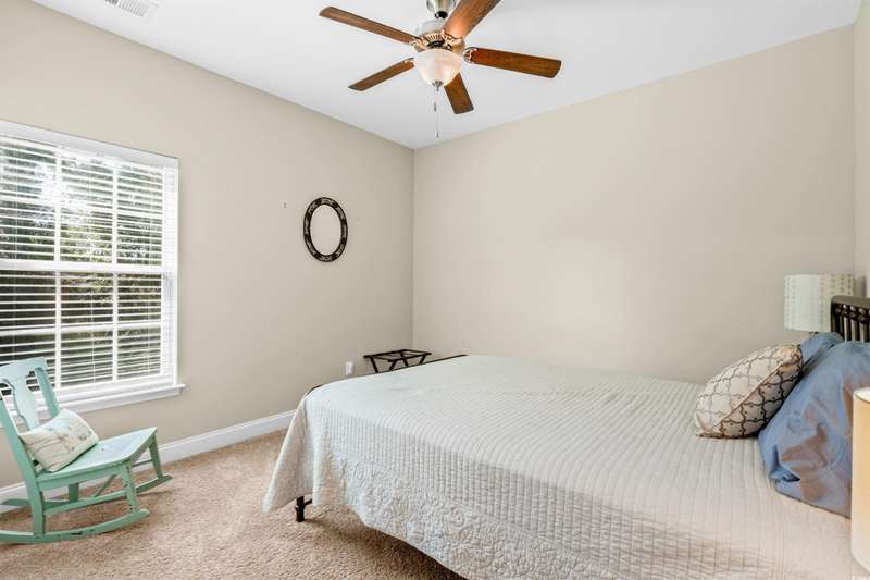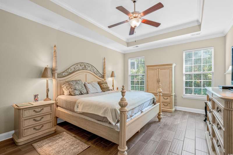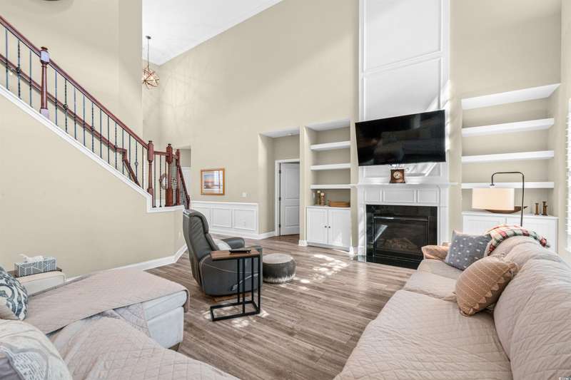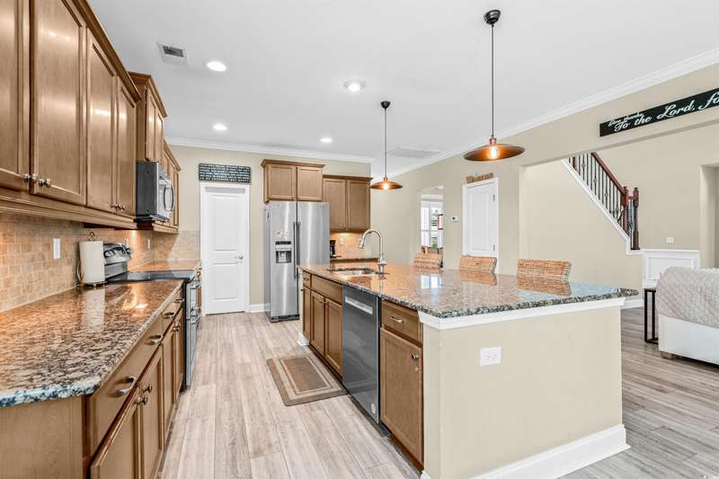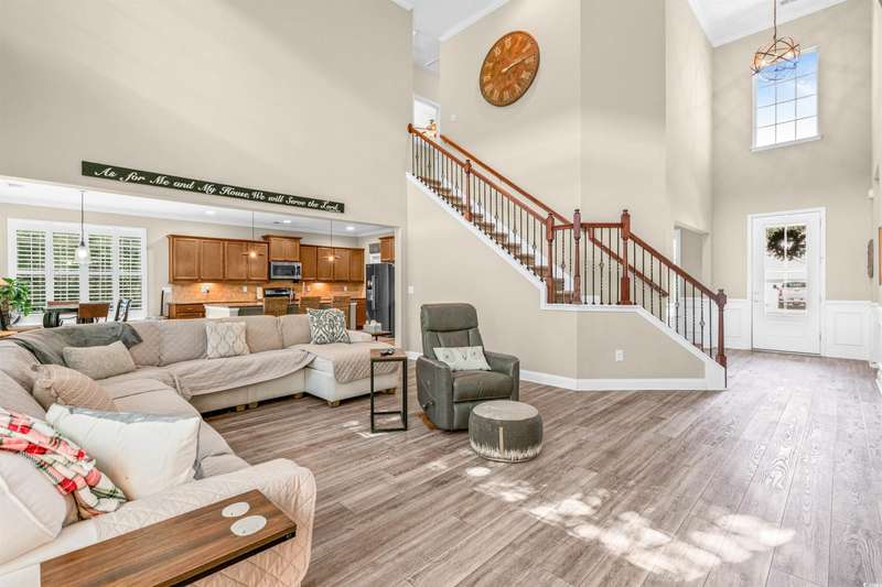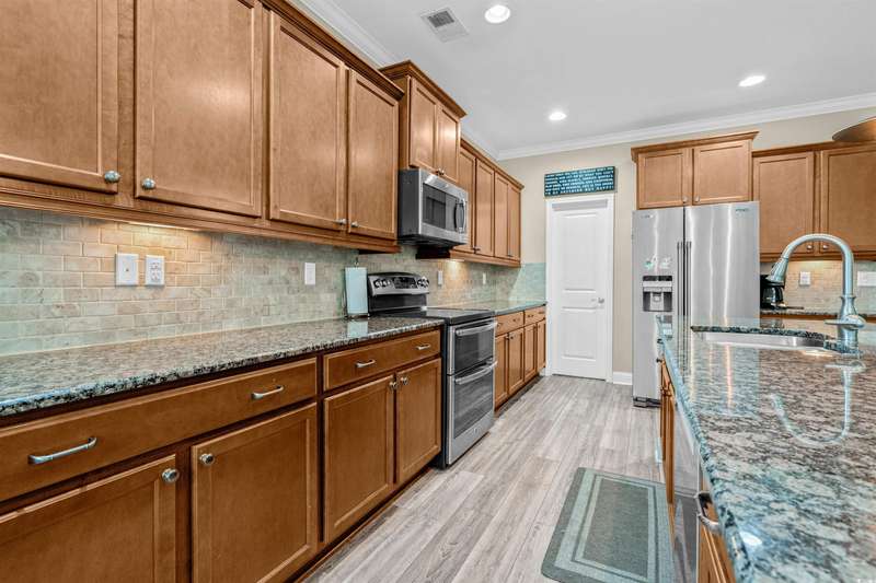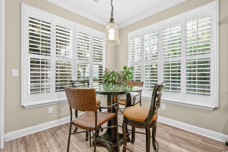 Gorgeous 5 Bedroom home with over 3000 heated sq feet featuring vinyl shake accents that offers timeless curb appeal in one of the area's most desirable communities. The Bridges of Litchfield takes its name from the neighborhood's charming wooden bridges, creating a serene and picturesque setting. This open-concept home offers a layout to include a dual owner's suite perfect for in-laws or guests with a private full bath. When stepping into the foyer, you'll be greeted by beautiful wood plank floors flowing throughout the main living areas, soaring 20-foot ceilings, angled wrought iron staircase and elegant wainscoting panels accenting both the foyer and the formal dining room. Abundant sunlight pours through triple windows with privacy-enhancing, energy-efficient vinyl film. The kitchen is a showstopper featuring a large center island with breakfast bar, granite countertops, stainless steel appliances, solid wood, full-overlay custom cabinets, subway tile backsplash, pendant lighting over the center island, breakfast nook overlooking the back patio and a large walk-in pantry. First floor owner's suite offers a tray ceiling, ceiling fan, double French doors to the master bath, garden tub, walk-in shower, angled double vanity with granite counters, water closet and spacious walk-in closet. Upstairs you'll find four bedrooms, all with ceiling fans, plush carpet and two full baths with tile flooring, tub/shower combos and stylish vanities. The fourth bedroom serves perfectly as the bonus room/in-law suite. Additional features include crown and baseboard molding, smooth ceilings and recessed lighting, plantation shutters, extra storage under the staircase and a 2 car garage. The Bridges of Litchfield if a prime location, just off Ocean Highway, next to HealthPoint Fitness, and minutes from the beach, grocery stores, shopping, dining, and world-class golf.
