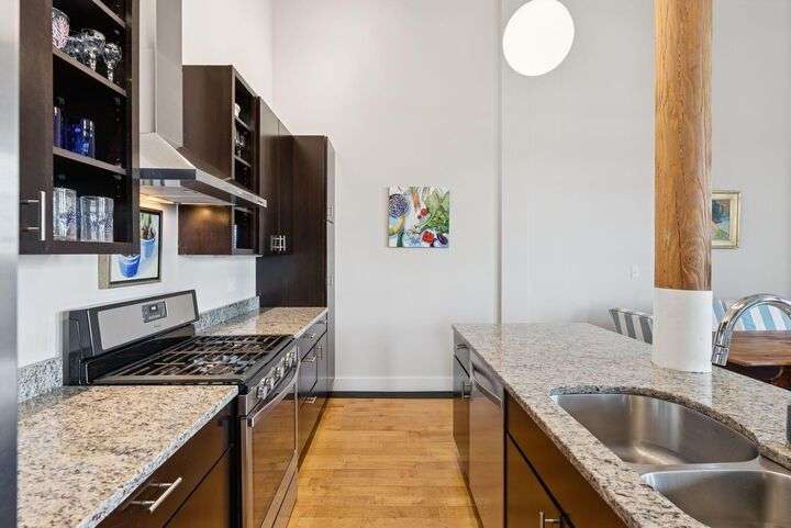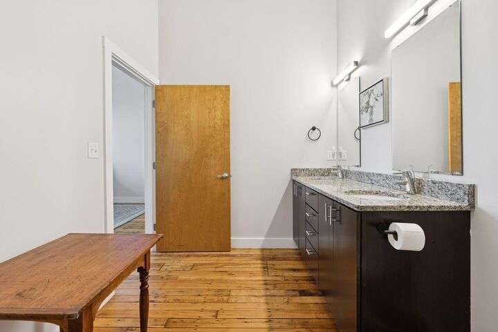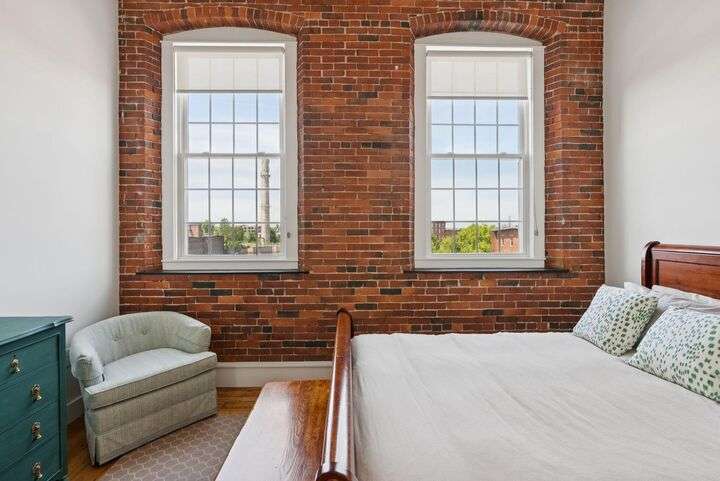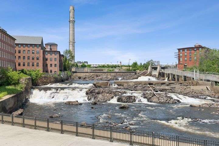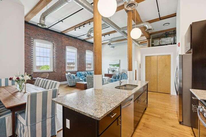 Experience breathtaking waterfront living in Biddeford, Maine with this remarkable 1,674 sq ft condo overlooking the Saco River Falls and historic mills. This rare two-bedroom, two-bathroom residence offers unobstructed water views and exceptional historic charm, featuring soaring ceilings, exposed brick and beams, oversized windows, and original 1850s hardwood floors. Sunlight fills the home throughout the day, while the spacious kitchen provides standout storage and display options. Thoughtfully designed, the layout includes a dedicated dining area and a cozy office nook—perfect for remote work. The expansive living room showcases three oversized windows framing stunning river views. Modern comforts include efficient heat pumps for heating and cooling, plus an in-unit washer/dryer. Both bedrooms are generously sized and easily accommodate king beds, offering plenty of room for personal style. This condo is an excellent choice for downsizing or simplifying, with an oversized storage unit and a designated parking space, plus the option to rent an additional spot. Residents enjoy direct access to the vibrant Pepperell Mill Campus, filled with businesses, makers, and wellness studios. Enjoy the convenience of walking indoors to Banded Brewing, the Garden Bar, Portland Pie, a ceramics studio, a spinning studio, massage therapy, photography studios, and more—all without stepping outside. Located in the heart of revitalized Downtown Biddeford, the Pepperell Mill community blends residential living with restaurants, coffee shops, and artist spaces along the Saco River. Biddeford has become one of Maine's fastest-growing creative hubs, offering a walkable, energetic lifestyle with top local dining, entertainment, and amenities just steps from your door.