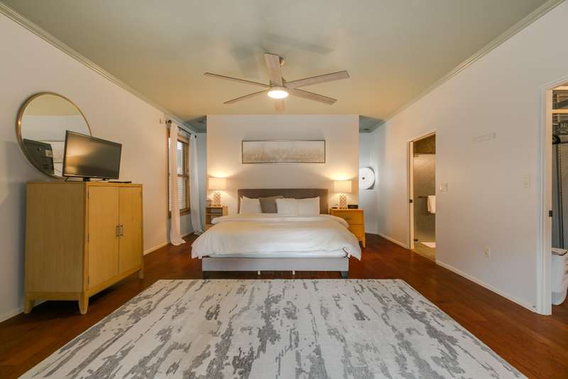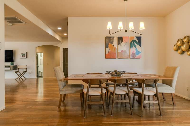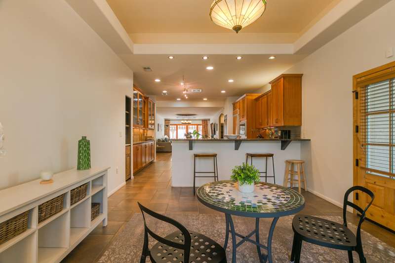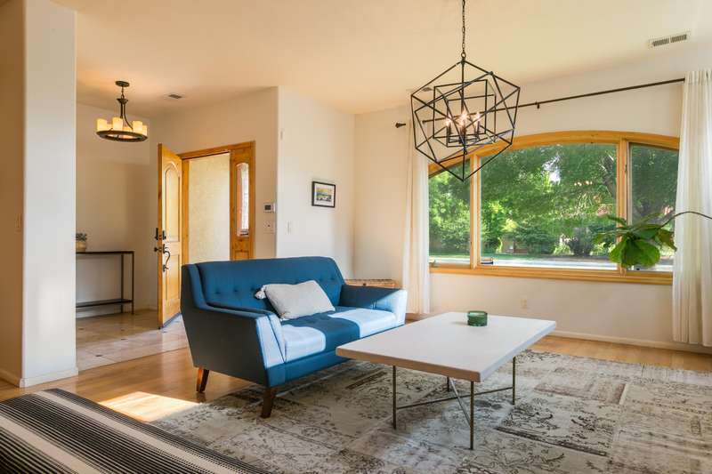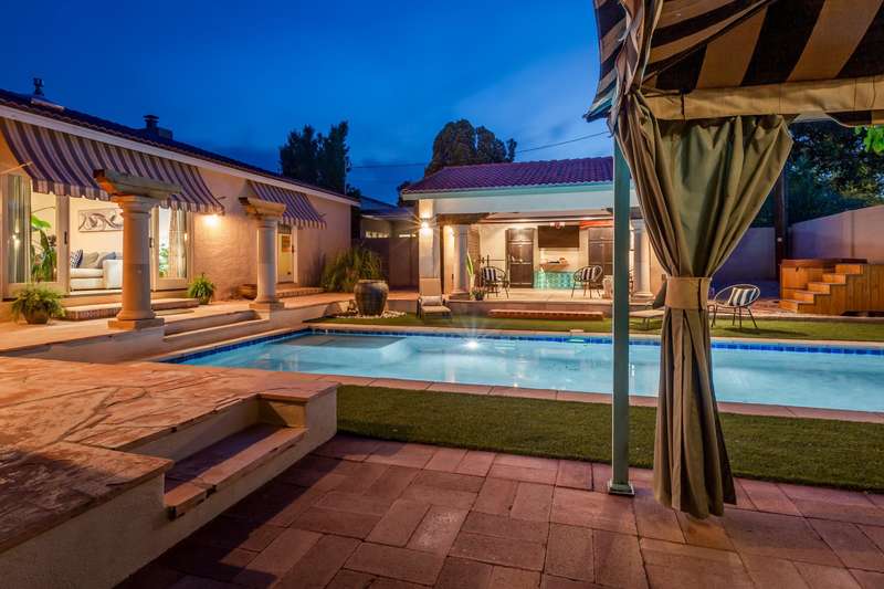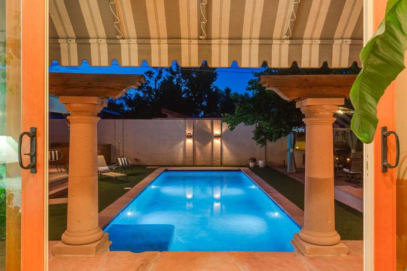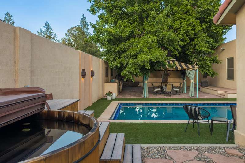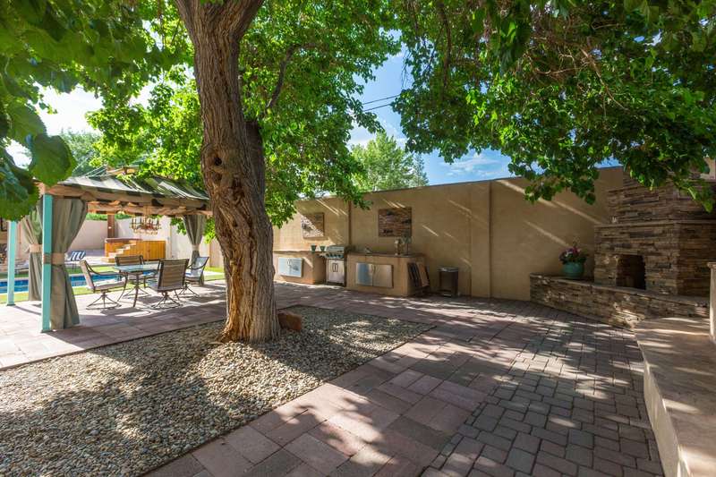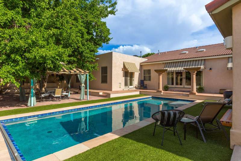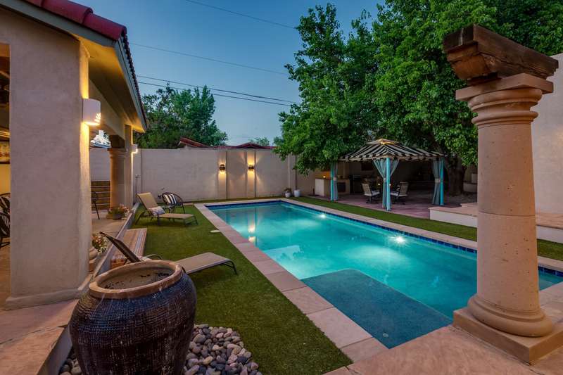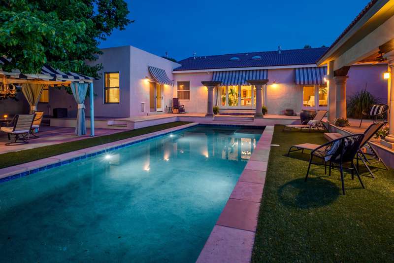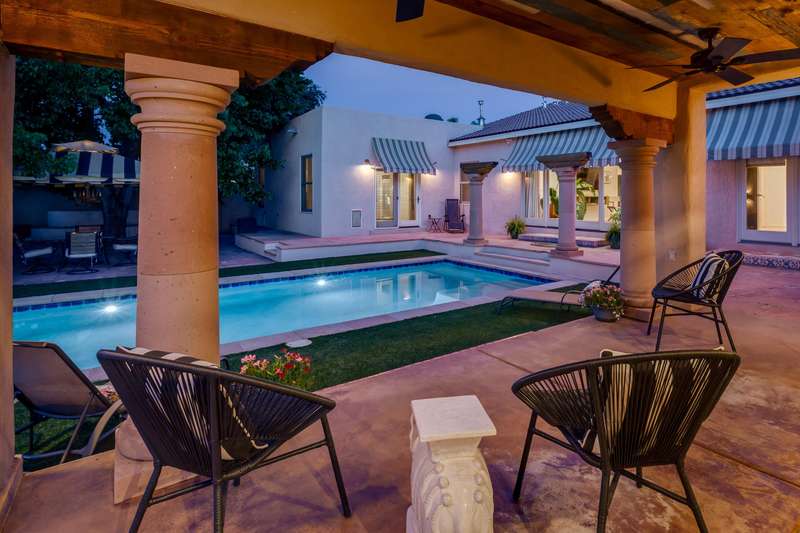 Timeless elegance in the heart of ABQ Country Club.Completely remodeled creating an open flowing floor plan between generous living, dining, den & kitchen spaces.Dramatic view to heated salt water pool from kitchen & den. Kitchen w/island, gas range, stainless appliances,& brkfst nook. Primary bdrm is split from other bdrms & is a true retreat! Dressing area w/custom storage, walk-in closet plus walk THROUGH closet for boots, shoes & purses! Access pool from this peaceful space. Each addtnl bdrm has access to bathrm. 1 bedrm also accesses pool. Fantastic cabana space offers additional outdoor living options plus Japanese hot tub, outdoor fireplace & cooking area.Short distance to Country Club and beautiful tree lined medians. Holidays will include luminarias & glowing hot air balloons.
