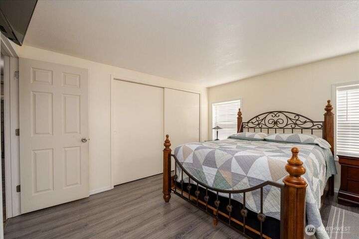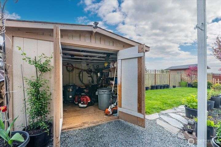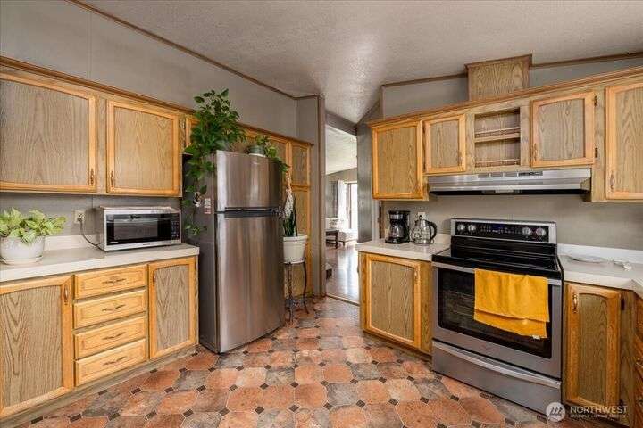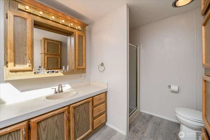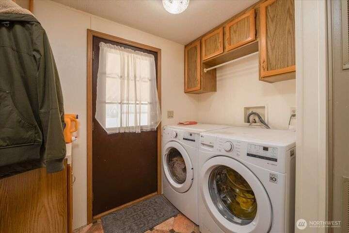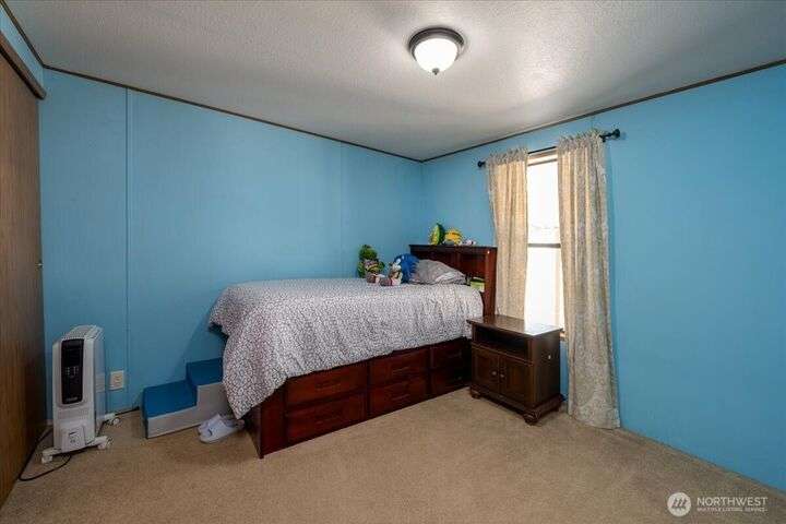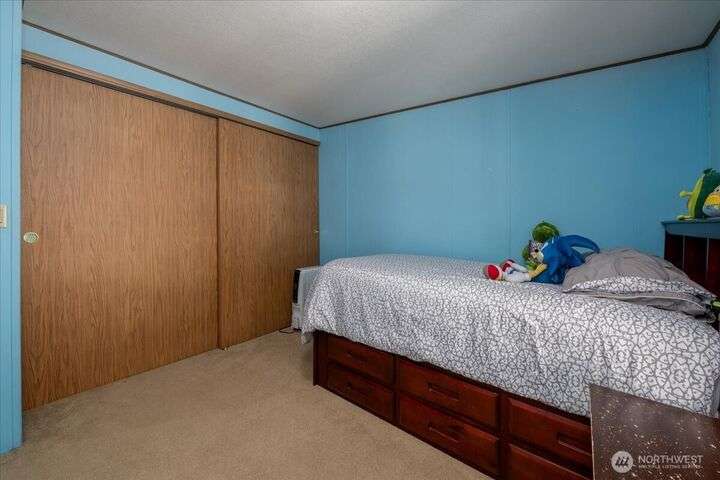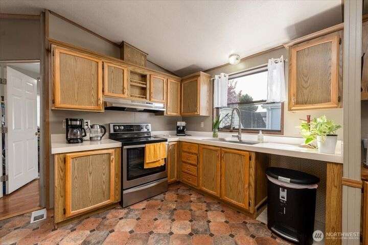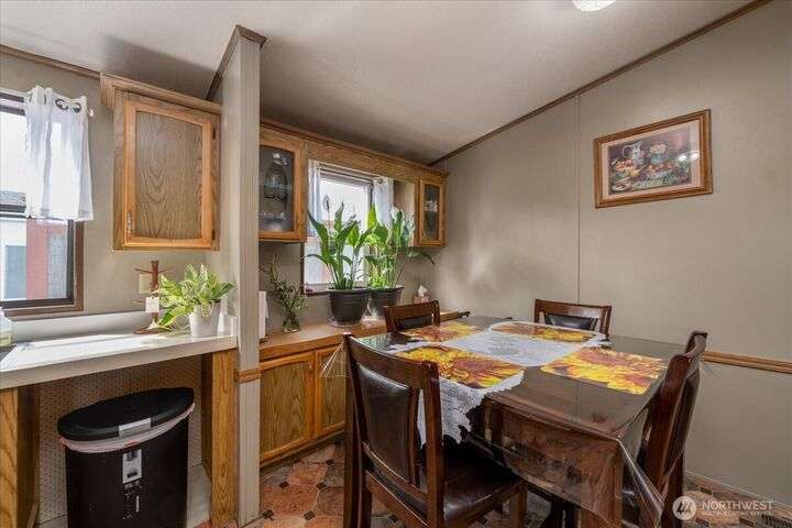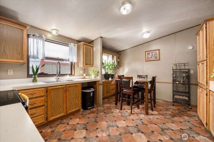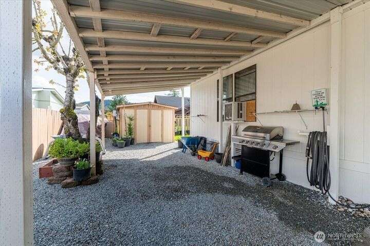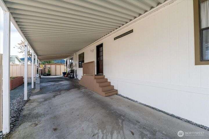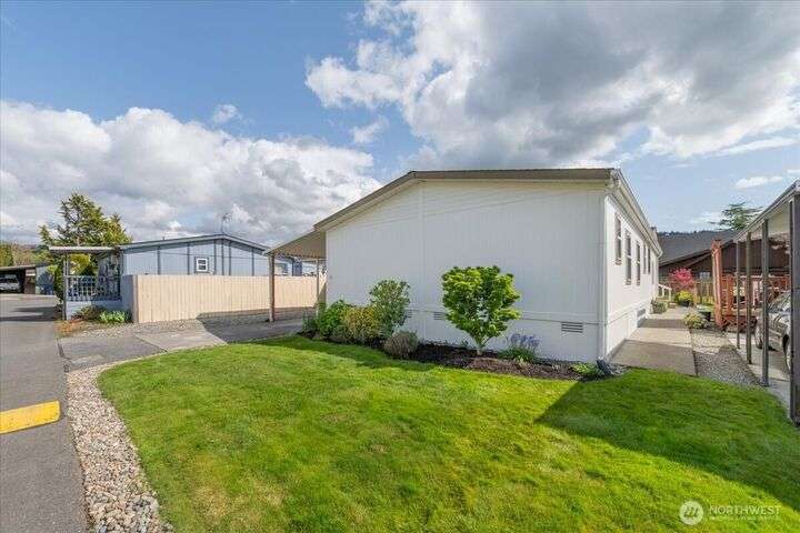Welcome to Viewmont Estates, a centrally located all-ages park near downtown Mount Vernon! This desirable 3-bedroom, 2-bathroom home features a highly sought-after floor plan with a large kitchen offering ample storage, stainless steel appliances, & dining area. The spacious living room boasts a free-standing stove & abundant natural light. One bedroom currently serves as an office with French doors, while a small bonus room with plumbed toilet provides storage & potential powder room conversion. The wrap-around yard includes a large storage shed & offers a beautiful blank canvas for creating your personal oasis. An attached carport provides covered parking, with additional guest parking in two locations. Green space & one pet allowed!