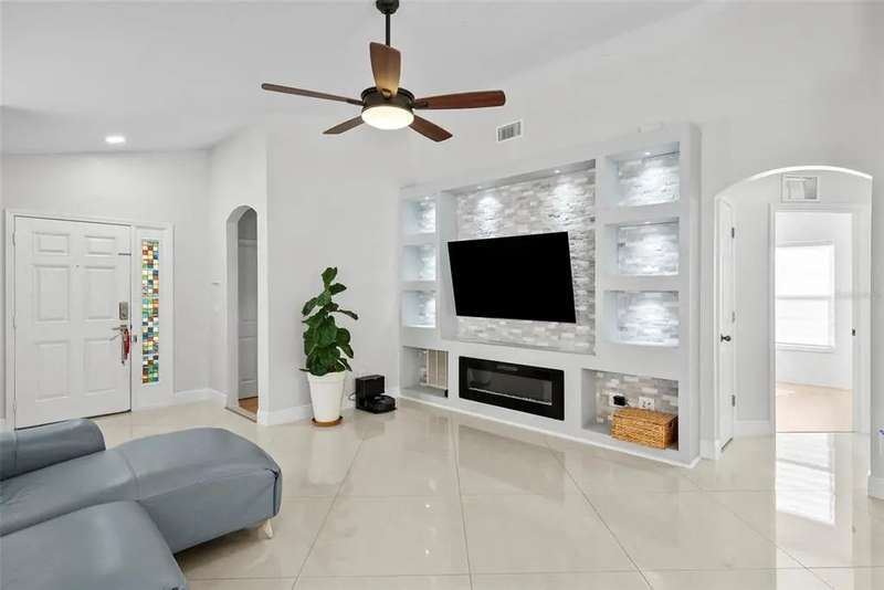 Peaceful Lakefront Living with easy access to everything you need! This beautiful 3/2 newer construction home offers a nice open layout and even has an additional bonus room from the garage conversion. Enjoy light finishes and tile floors throughout the main part of the house. The household finishes are light and bright. Enjoy an open kitchen floor plan complete with a gas stove and waterfront views. A built in shelves and accent wall provides a great space for watching TV or entertaining. The backyard is fenced and complete with a low maintenance turf and patio area. This community located right off 301 offers a community playground as well as a dog park. In addition to a gas water heater this home has an updated roof and storm shutters, making it perfect for Florida weather. Don't miss out on your chance to have it all.