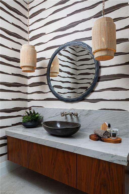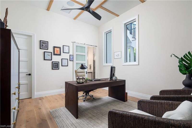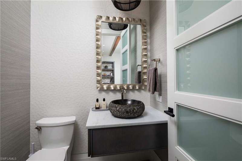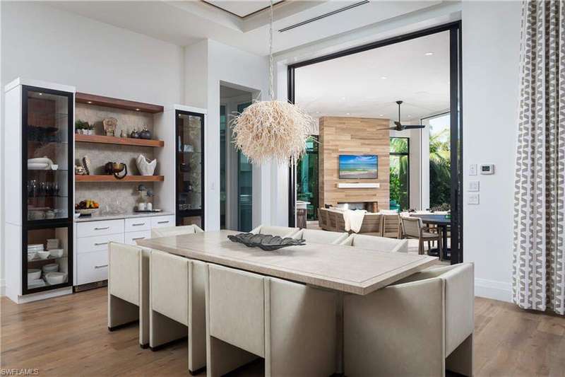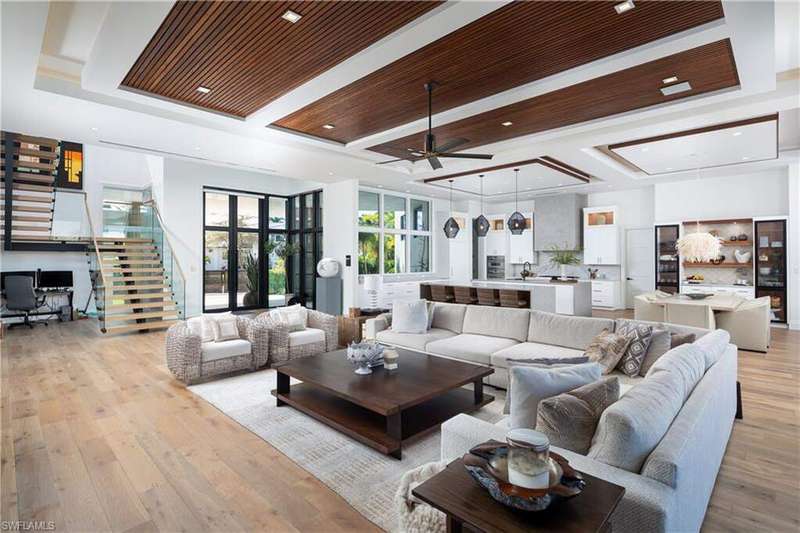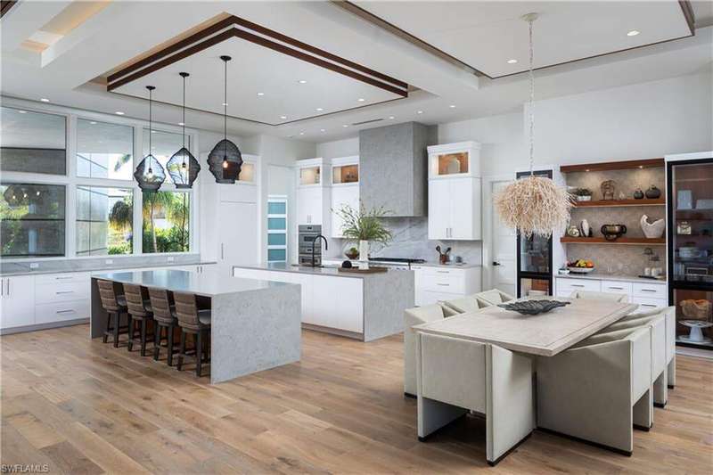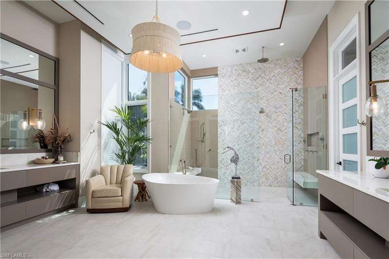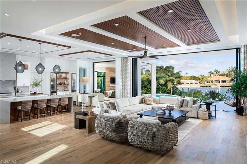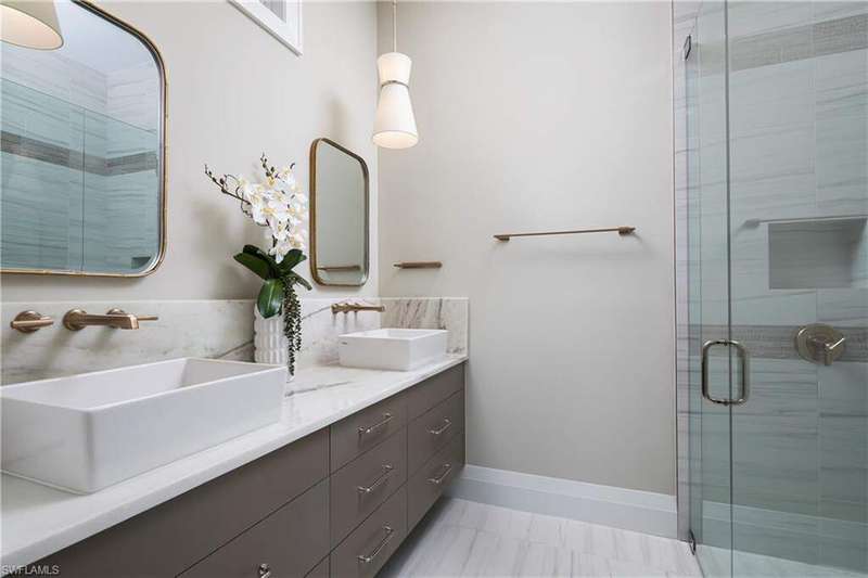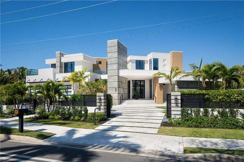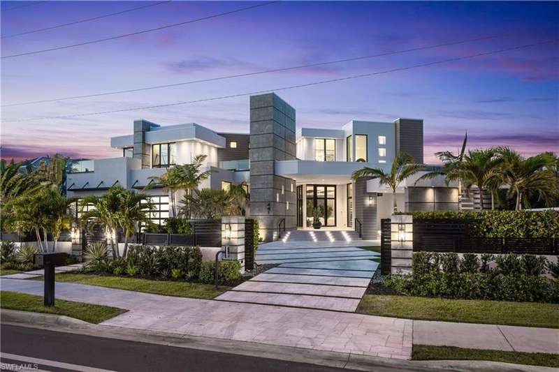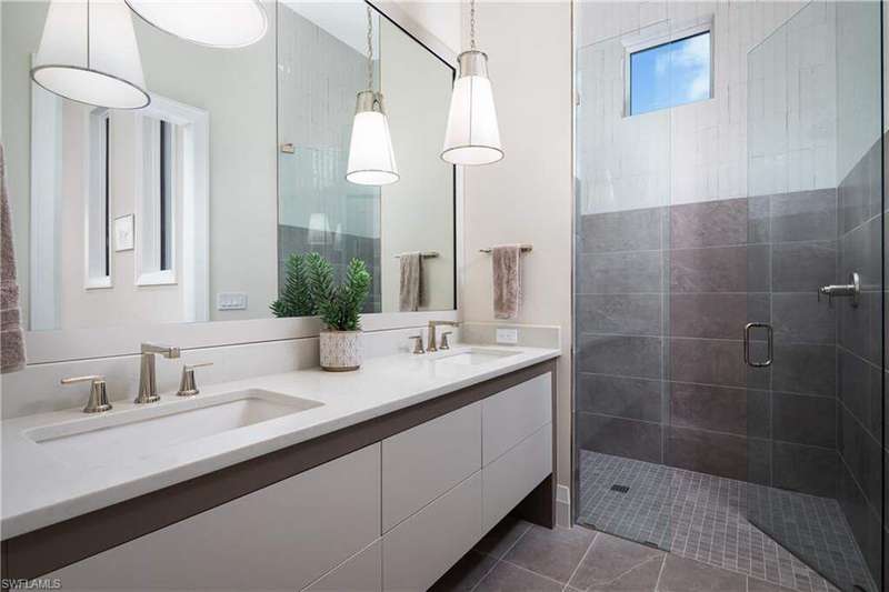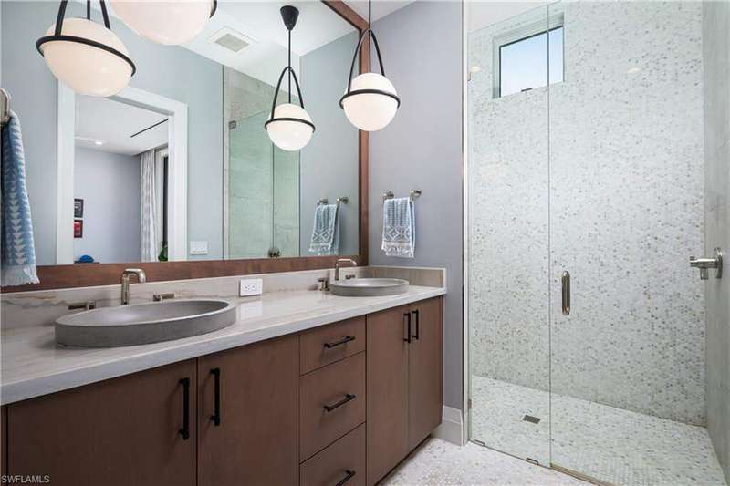 One-of-a-kind masterpiece built in December 2022 (nearly 2023) in the highly sought-after Moorings neighborhood of Naples with breathtaking bay views. Just a 10-minute walk (0.4 miles) to the beach, this architectural marvel offers an unparalleled coastal living experience. As a Moorings resident, you are eligible for membership (at a very low cost) to the exclusive Moorings Beach Park for effortless beach access. This modern estate was custom-built by the award-winning Potter Homes & expertly designed by Adelyn Charles Interior. Designed for the utmost privacy & exclusivity featuring electric motorized entry gates, a solid fortress-like construction of all concrete block, hurricane impact windows/doors throughout & electric hurricane shutters. Every aspect of this property has been crafted with the finest materials & attention to detail, including stunning oak flooring, reverse tray ceilings with wood paneling/uplighting & soaring 14-ft ceilings. Part of the exclusive "Golden 50" in the Moorings, with direct, bridge-free access to the Gulf in just 5 minutes via Doctors Pass. For boating enthusiasts, the home is equipped with dual lifts-one featuring a 30 ft boat lift with a 16,000 lb weight capacity, and the other for dual jet skis. The outdoor living space is a true paradise, with a luxurious pool and spa, fireplace, sun deck with built-in firepit, and a fully equipped summer kitchen perfect for al fresco dining. With 12 ft pocketing floor-to-ceiling sliders, the space effortlessly blends the interior and exterior for seamless waterfront living. Inside, this expansive estate offers 6,900 sq ft under air with 6 bedrooms, 6 full bathrooms (all with dual vanities), 3 half baths, a separate guest house, 3 laundry rooms & a 3-car garage. The state-of-the-art kitchen is a chef's dream, with custom white cabinetry, dual wood islands with waterfall concrete overlays, high-end Thermador appliances & a butler's pantry. The main-level primary suite is a private retreat, complete with custom wood ceilings, a wet bar, massive walk-in closets, and a spa-like bathroom with dual vanities, dual water closets, a generous shower with multiple showerheads, dual benches & a separate soaking tub. Upstairs, a spacious living room area with a wet bar, island with bar seating & 3 bedrooms create the perfect space for relaxation, while a sundeck provides breathtaking water views. For ultimate guest privacy, the separate guest villa offers a bedroom, ensuite bathroom, laundry room, full kitchen & private sundeck-ideal for hosting guests. Another highlight of this home is the rooftop observation deck offering sweeping views of the Gulf & Bay-perfect for sunset vistas. Additional features include a private elevator, buried gas propane tank, electric screens, lush landscaping, a spacious front yard ideal for pets & more. An extraordinary sanctuary in one of Naples' most coveted communities, The Moorings, this residence is truly a showcase of visionary design.