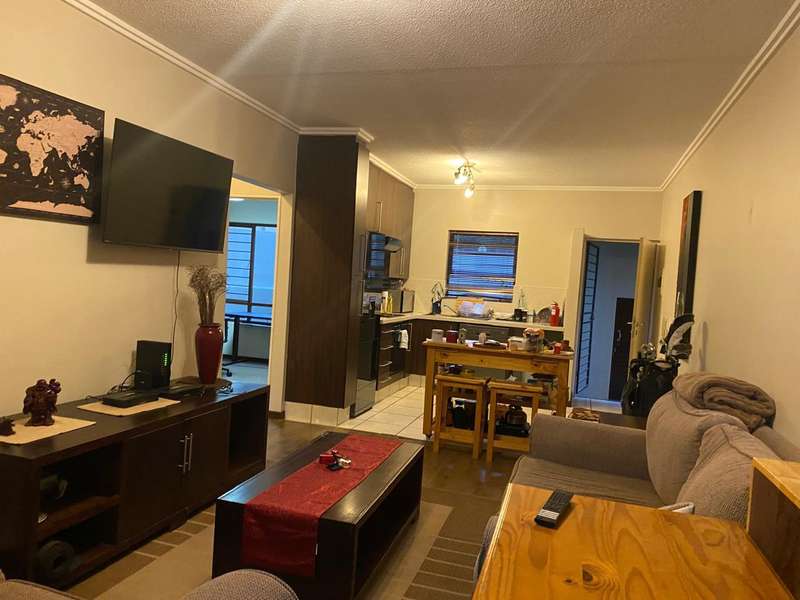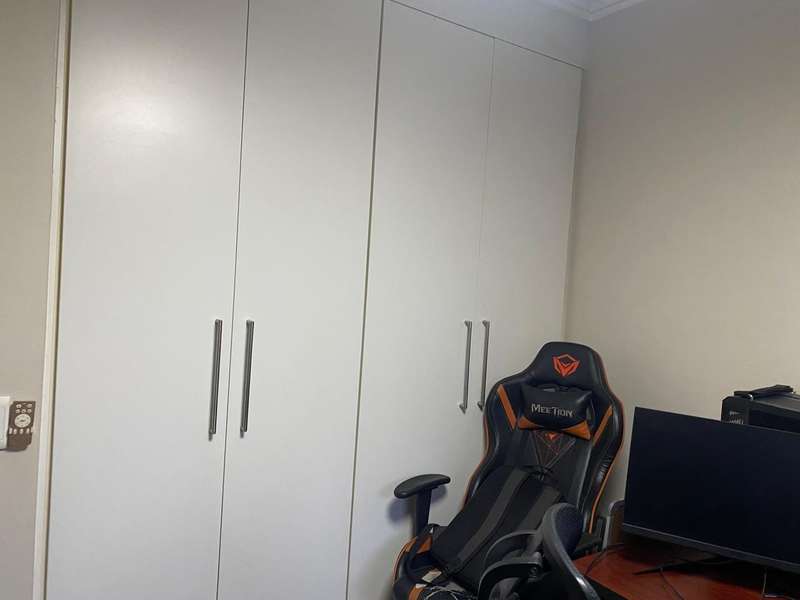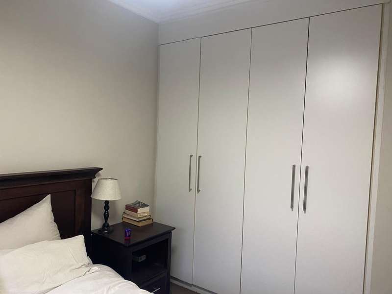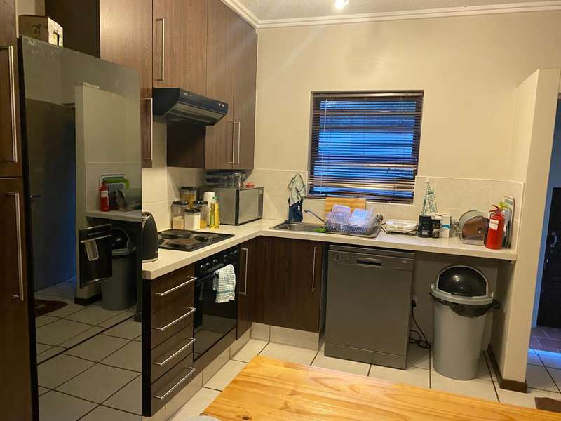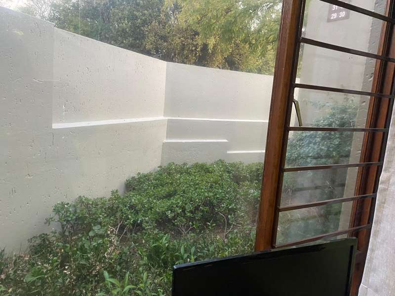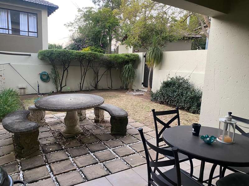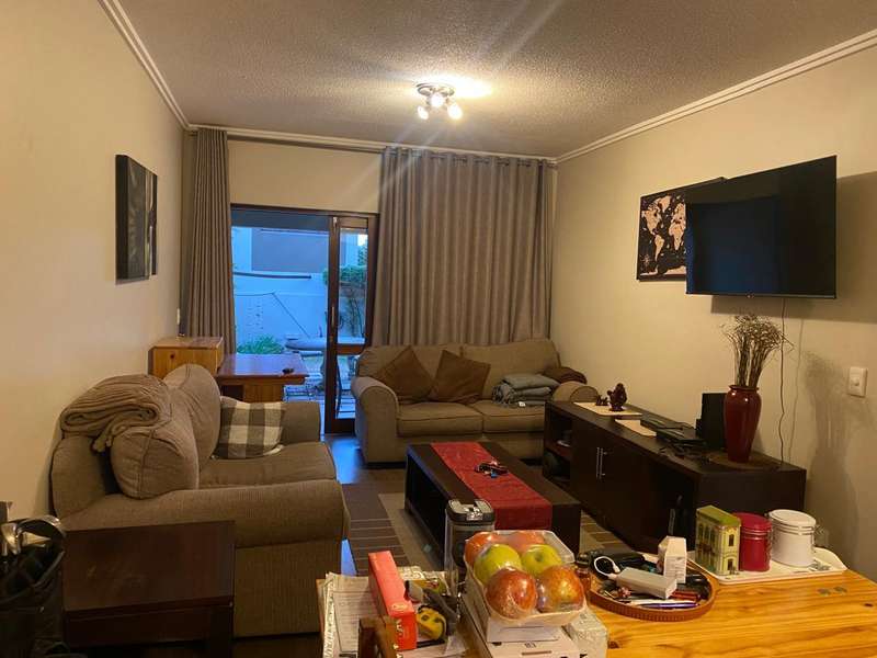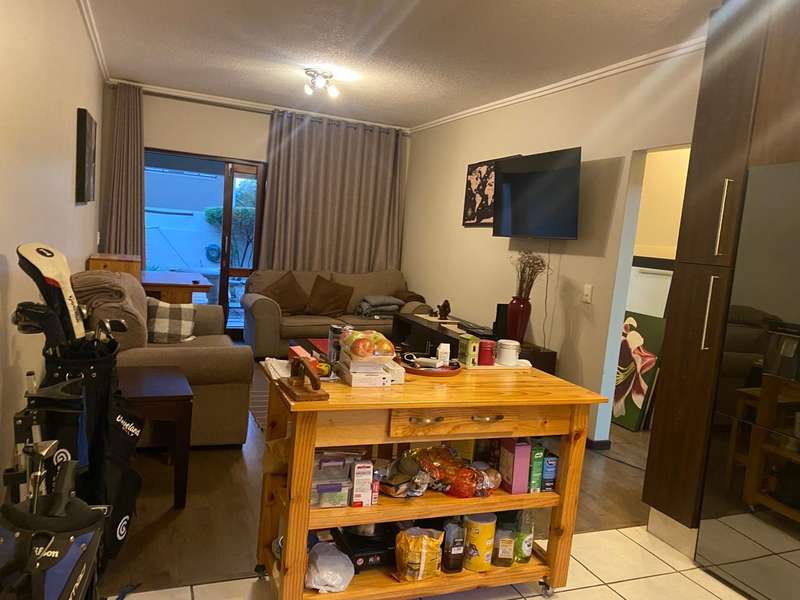 On entry into this garden unit is the granite kitchen with a double sink and space for 2 appliances. The kitchen has a wooden island for extra storage and gives and extra surface for preparing meals. The lounge are can fit a full lounge suite. There are sliding doors that lead onto the covered veranda and private garden. The veranda has a charming garden suite that can remain if desired..