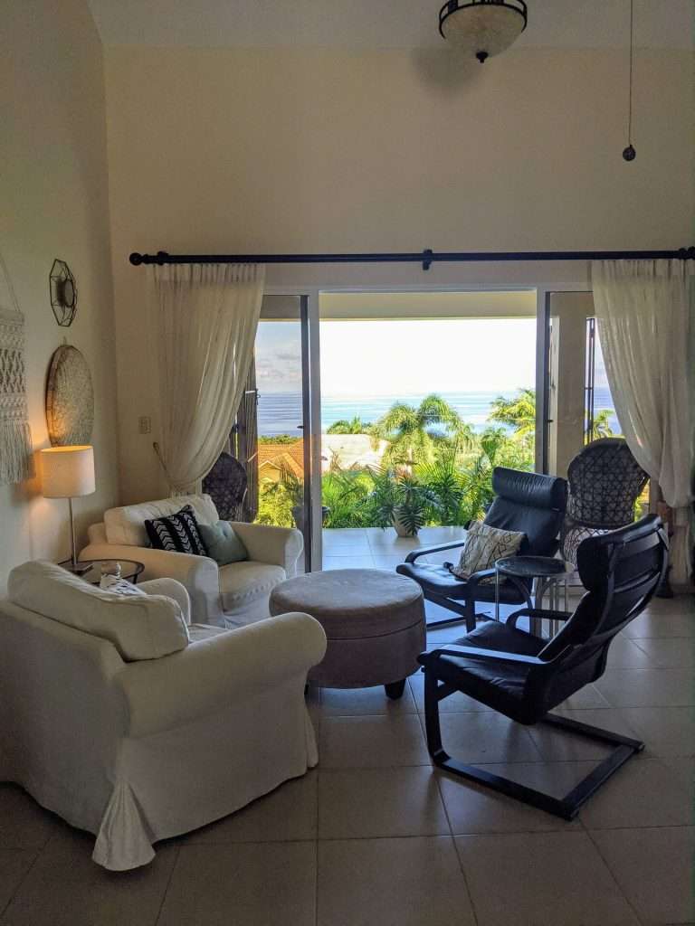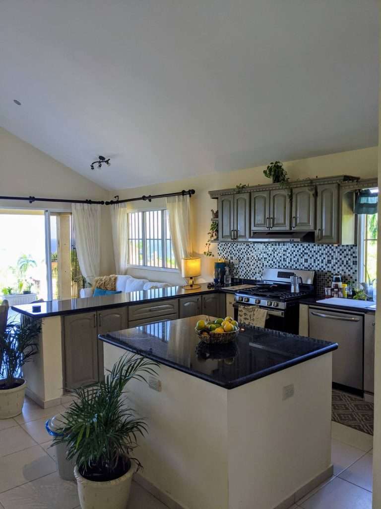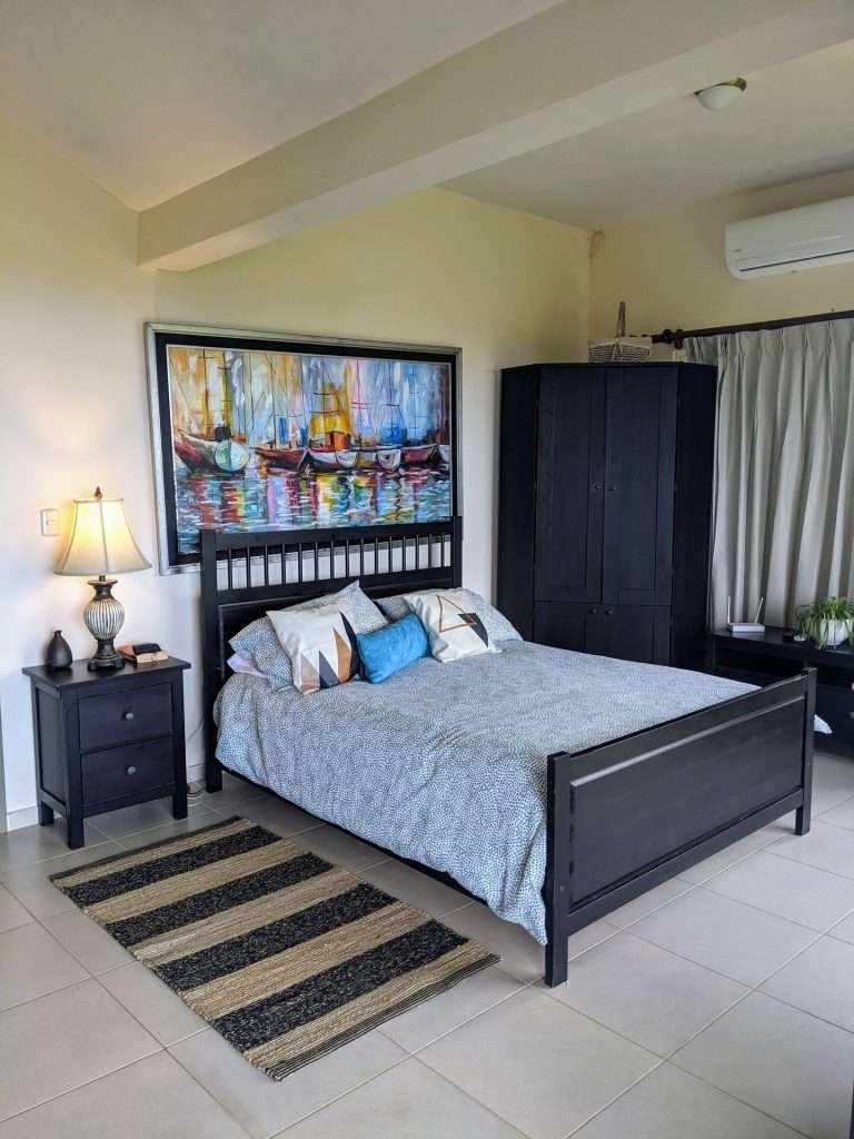 The master bedroom is spacious with an ensuite bath and AC. It has a queen bed and a convertible couch. Of the two additional guest rooms, one has a queen and the other a full bed. The home is considered modern by local standards. In addition, there are high ceilings, two seating areas, a dining room table that seats 8, and a kitchen with an island, a gas stove, a dishwasher, and a microwave. We also have plenty of parking and an enclosed single-car garage.