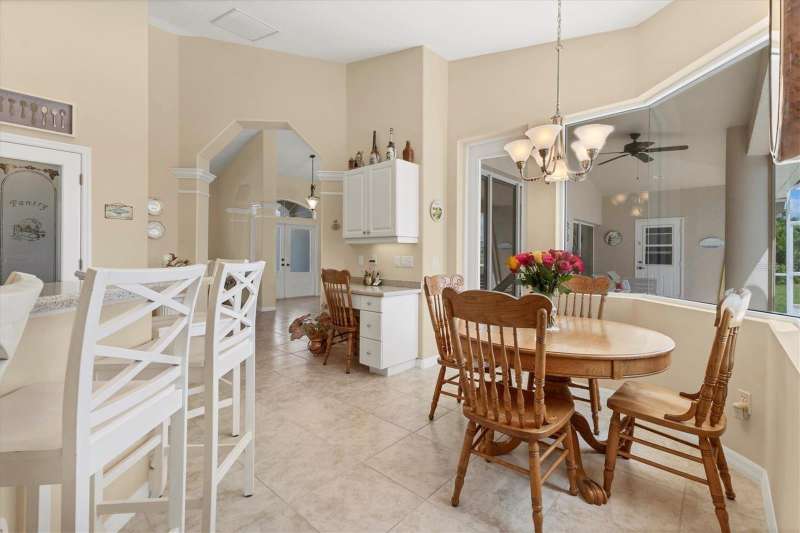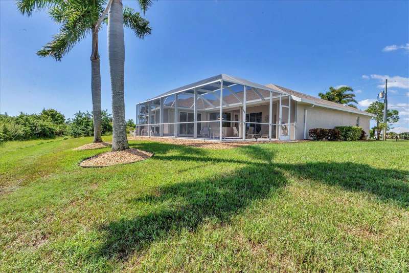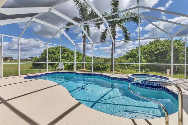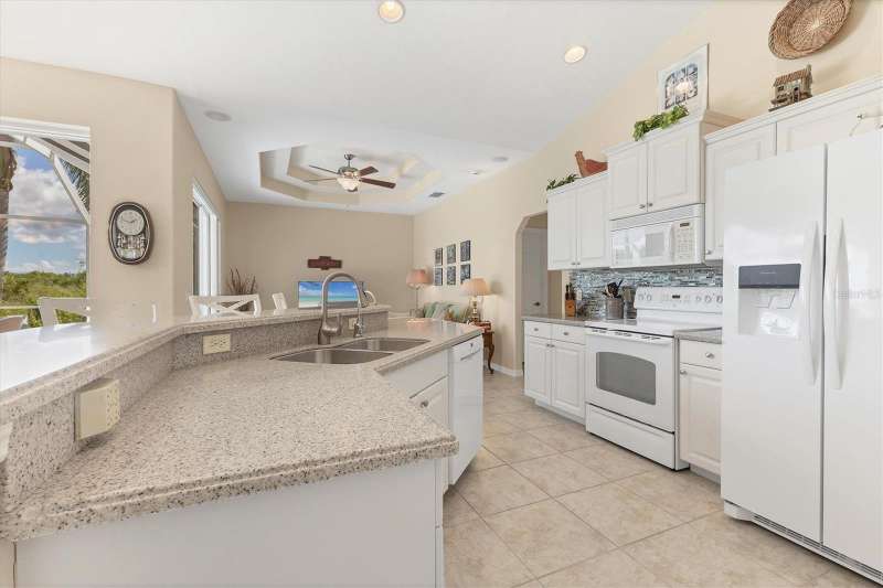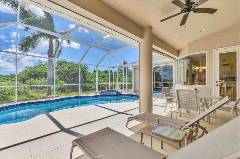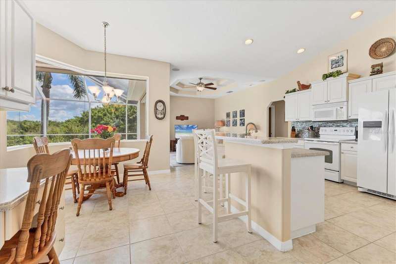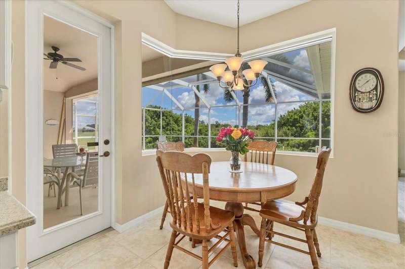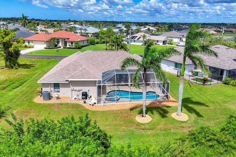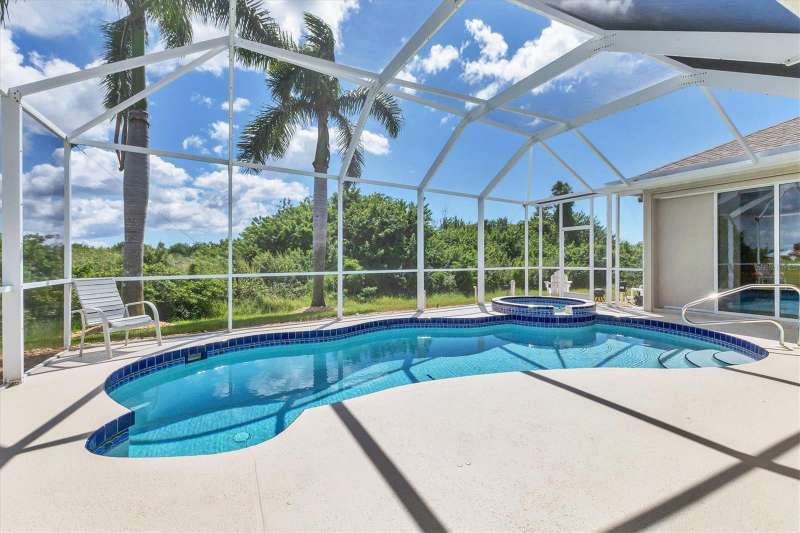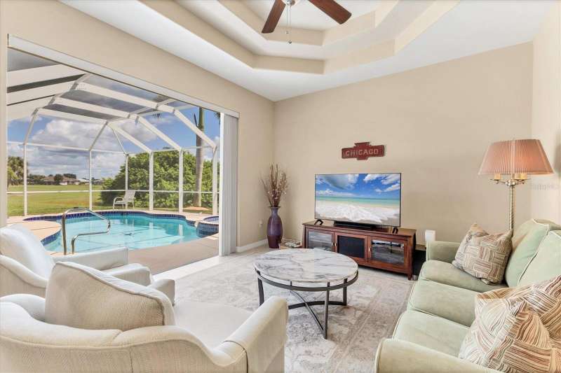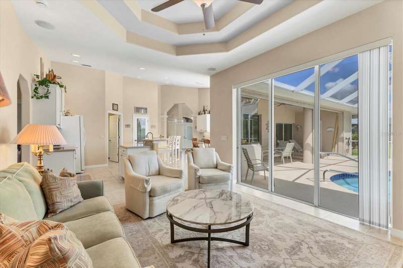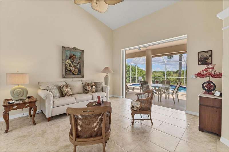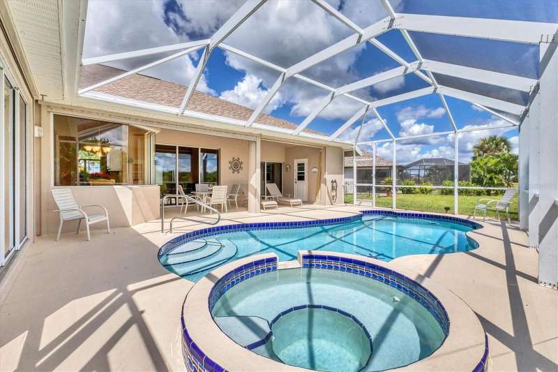 Under contract-accepting backup offers. This beautifully designed 2,036 sqft pool home, built in 2007, offers the perfect blend of comfort, privacy, and Florida lifestyle. Situated on a quiet street in the popular community of Rotonda West, and backing to a lush greenbelt, it provides serene views and a peaceful setting. Inside, 12-foot-high vaulted ceilings and abundant natural light create an airy, inviting atmosphere, with sliding glass doors in both the living and family rooms that fully pocket back to seamlessly connect indoor and outdoor spaces. The spacious kitchen features an island breakfast bar, closet pantry, built-in desk, and a cozy dinette area framed by an aquarium glass window—perfect for casual dining with a view. The 21-foot lanai is enclosed with roll-down screens, offering year-round enjoyment beside the sparkling heated pool and relaxing hot tub. Fabric/Kevlar hurricane shades protect all other windows and doors. The property is in an X flood zone with no history of flooding and no flood insurance required, public water with a kitchen water filtration system, public sewer, a ManaBloc plumbing system with PEX tubing, plus a private well for irrigation. This home is a rare opportunity to enjoy bright, open living in a tranquil and private setting.