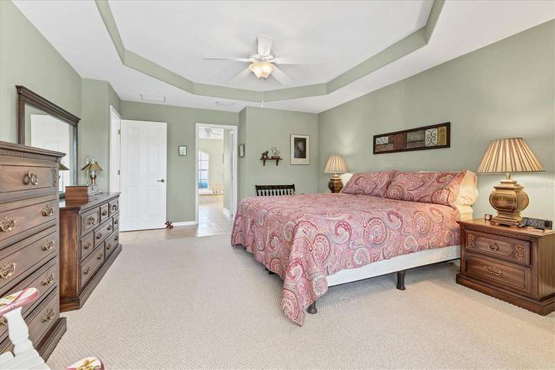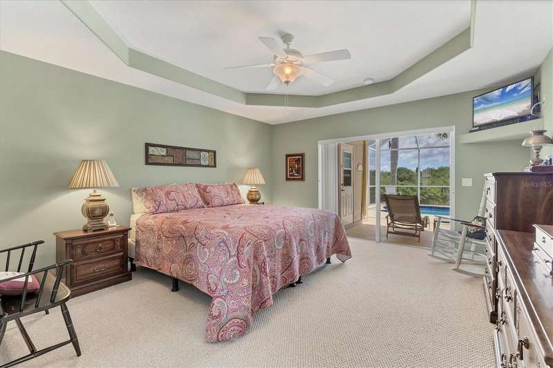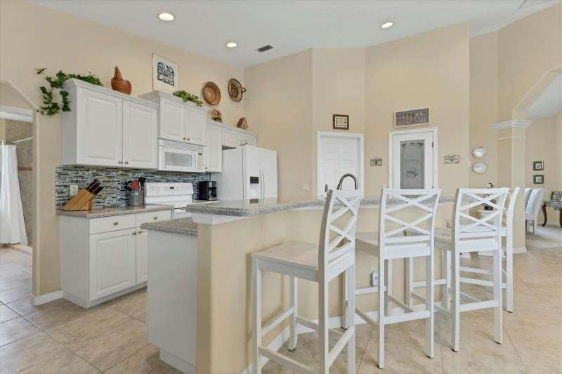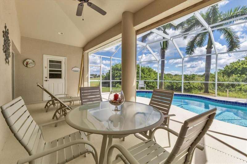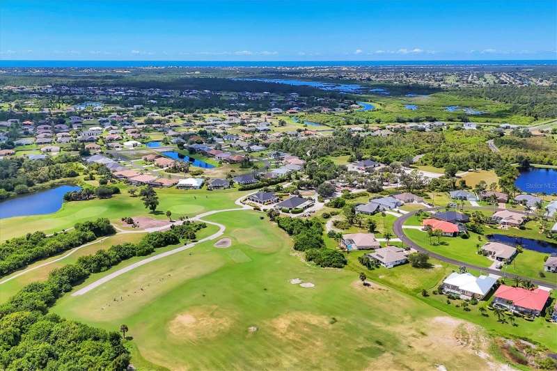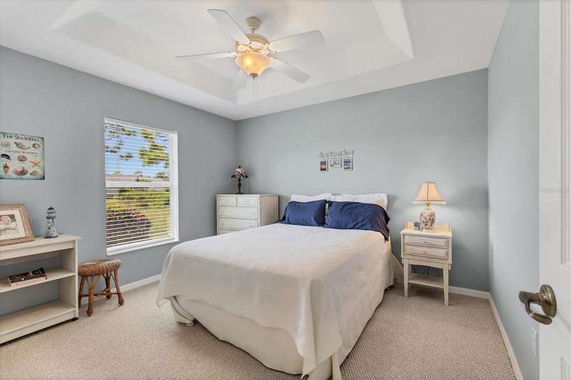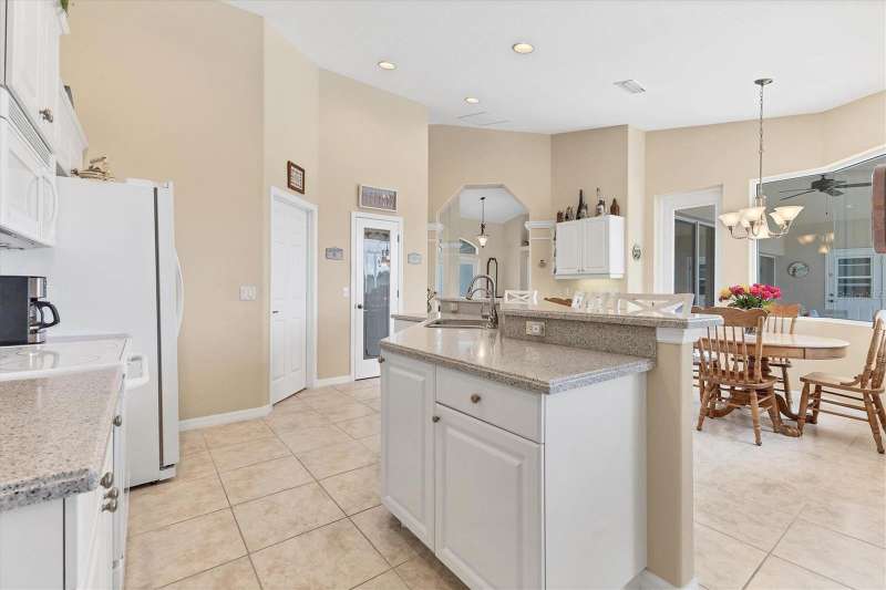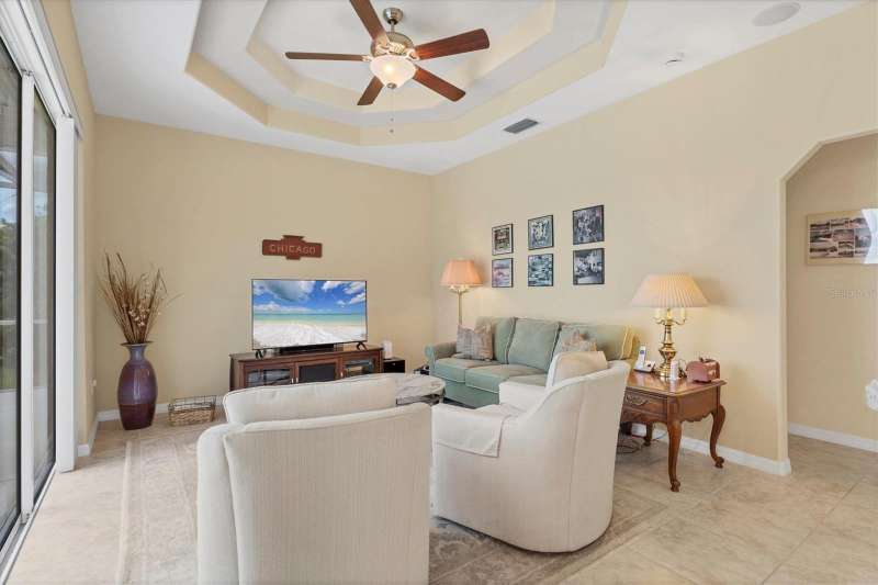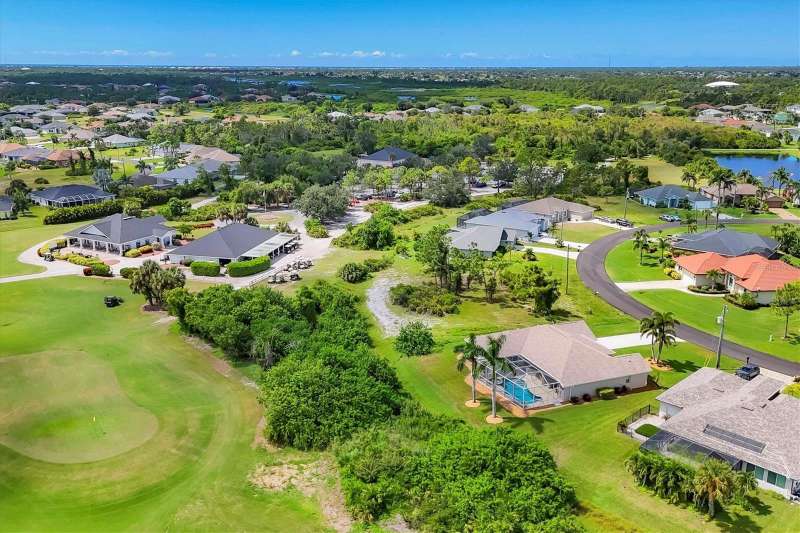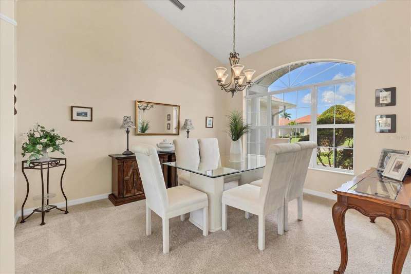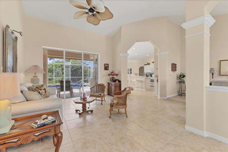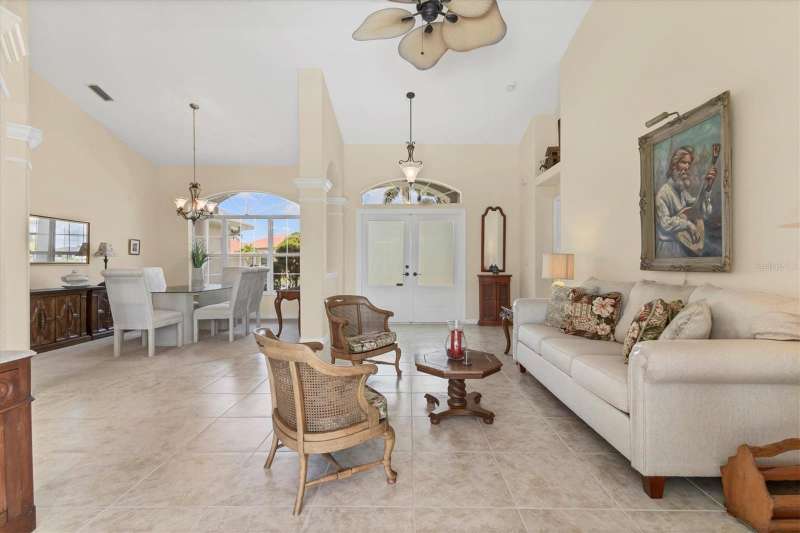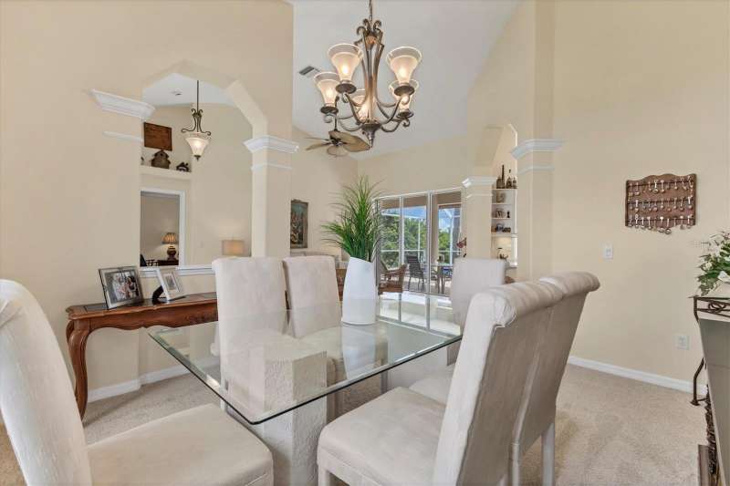 Under contract-accepting backup offers. This beautifully designed 2,036 sqft pool home, built in 2007, offers the perfect blend of comfort, privacy, and Florida lifestyle. Situated on a quiet street in the popular community of Rotonda West, and backing to a lush greenbelt, it provides serene views and a peaceful setting. Inside, 12-foot-high vaulted ceilings and abundant natural light create an airy, inviting atmosphere, with sliding glass doors in both the living and family rooms that fully pocket back to seamlessly connect indoor and outdoor spaces. The spacious kitchen features an island breakfast bar, closet pantry, built-in desk, and a cozy dinette area framed by an aquarium glass window—perfect for casual dining with a view. The 21-foot lanai is enclosed with roll-down screens, offering year-round enjoyment beside the sparkling heated pool and relaxing hot tub. Fabric/Kevlar hurricane shades protect all other windows and doors. The property is in an X flood zone with no history of flooding and no flood insurance required, public water with a kitchen water filtration system, public sewer, a ManaBloc plumbing system with PEX tubing, plus a private well for irrigation. This home is a rare opportunity to enjoy bright, open living in a tranquil and private setting.