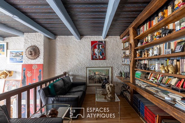 The entrance opens onto a large dining room whose wood panelling and high ceilings tell the story of the place. The adjoining living room, with its stone fireplace, extends this warm atmosphere. The separate kitchen, although functional, needs renovation to bring it up to current standards. A workshop/laundry room and a garage complete this level. Upstairs, a mezzanine landing reveals a custom-made solid wood library, a real character piece for lovers of peace and quiet and reading. Four spacious bedrooms make up the sleeping area, one of which has access to a private terrace with a view of the river. A bathroom in need of renovation completes this level.