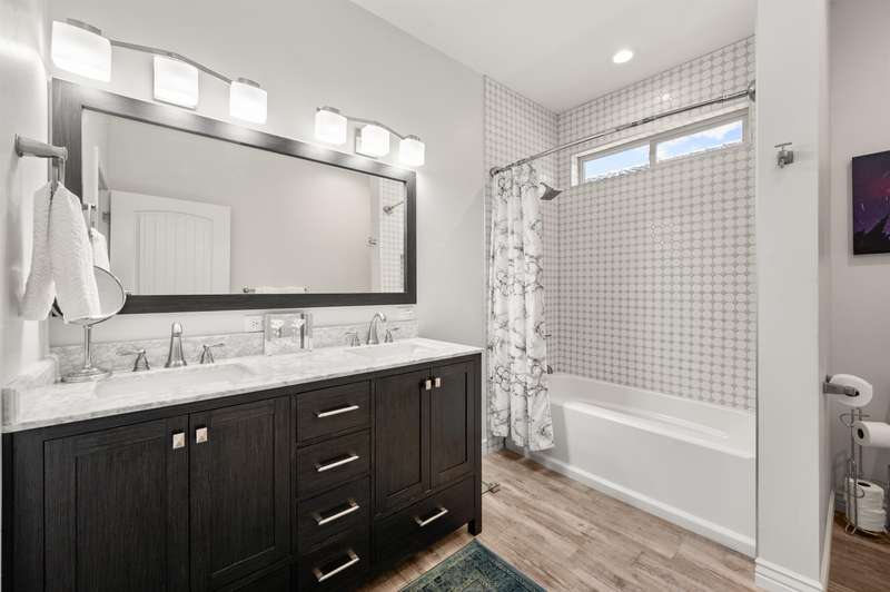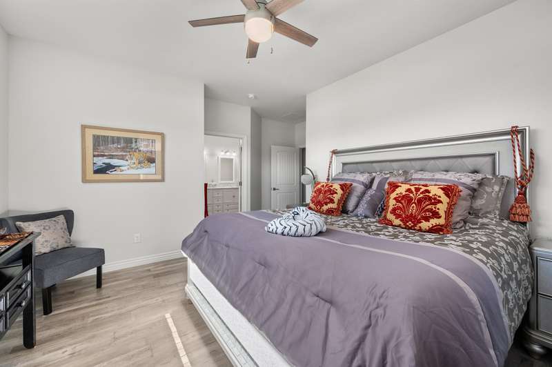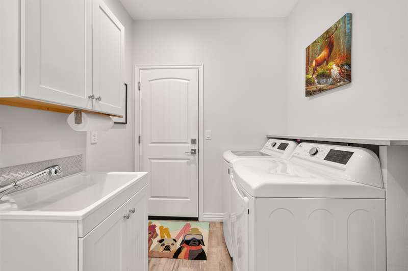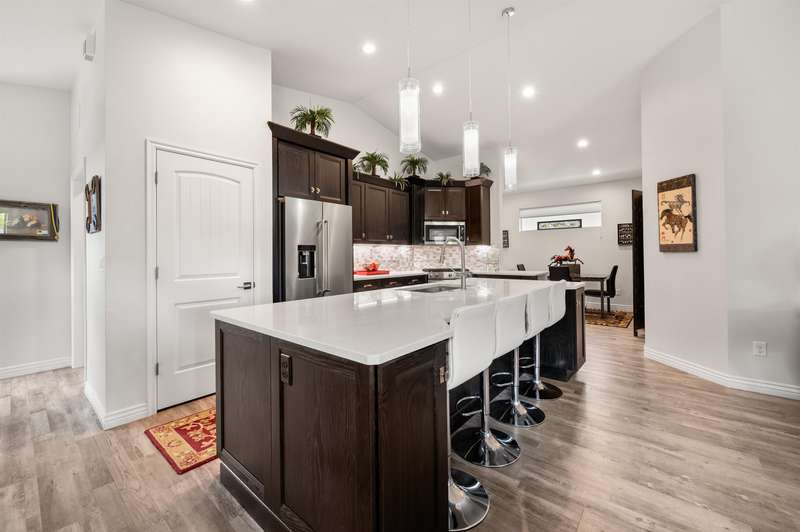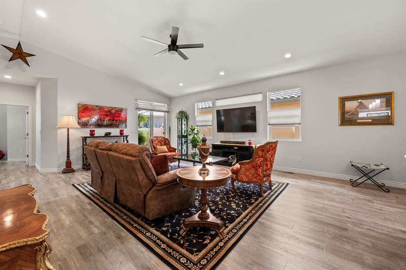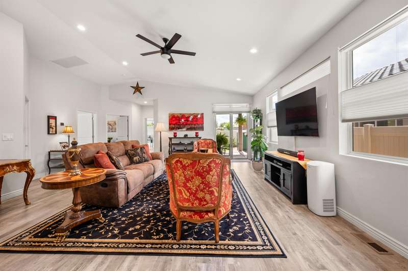 This stunning custom-built 3-bedroom, 2-bath residence in desirable Mesa Estates is packed with thoughtful upgrades and high-end finishes. Step into an open, light-filled living area with vaulted and 9-foot ceilings, LED dimmers throughout, and zero-VOC paint for a healthy, eco-friendly environment. The chef’s kitchen boasts a massive 10-foot island, quartz countertops, upgraded U.S.A.-made appliance package, and under-/over-cabinet lighting. The spa-style primary suite offers a luxurious 5-piece bath with a free-standing slipper tub and an oversized walk-in closet. Practicality meets comfort with a dedicated dog wash/mudroom station and waterproof, eco-friendly LVT flooring. The oversized 2-car garage provides additional storage space, is perfect for toys or gear. Outside, the yard is fully fenced, landscaped, and irrigated, with HOA-maintained front yard care included. This home truly blends style, sustainability, and convenience. Schedule your showing today because it won’t last long!