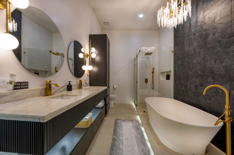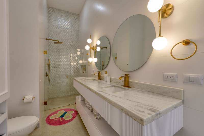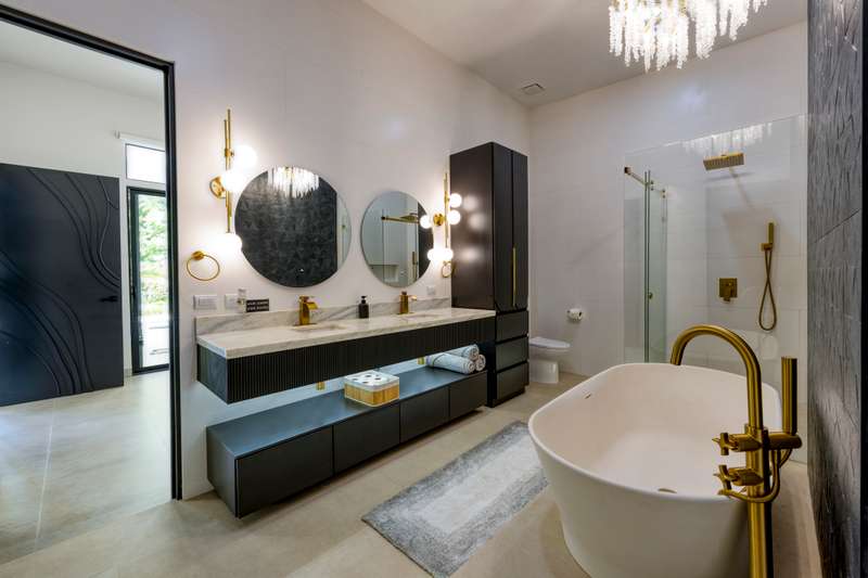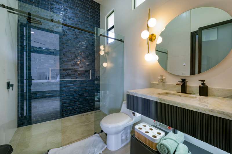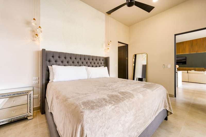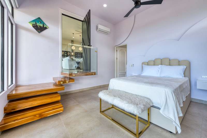 The primary suite is a private sanctuary with direct access to the pool deck, a spa-inspired bathroom with soaking tub, ambient LED lighting, dual vanities with natural stone counters, and a generous walk-in closet. A secondary suite on the opposite wing boasts sweeping coastal views, teak stair access, built-in closets, and a luxurious ensuite. The third bedroom, connected by an internal hallway, opens to the wraparound deck and shares a full bath with the main living area.