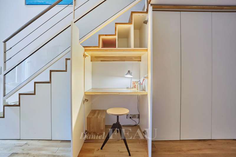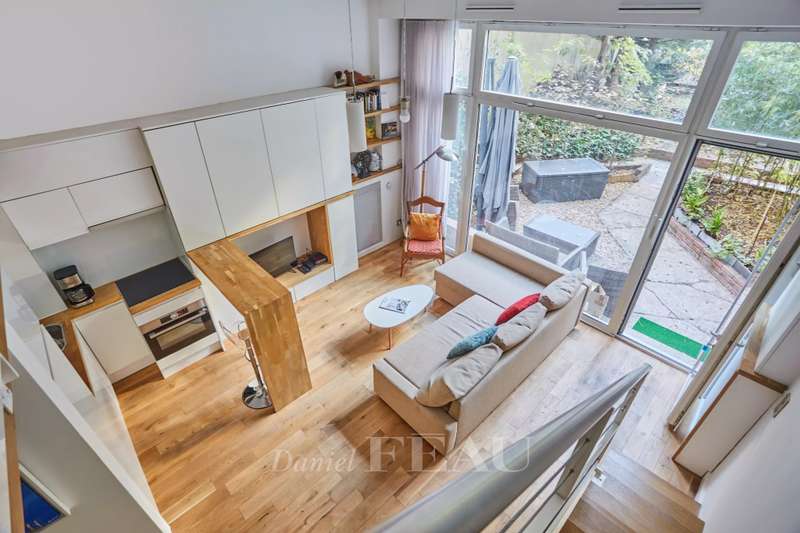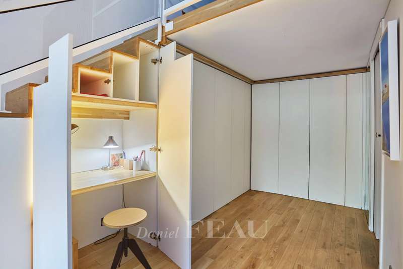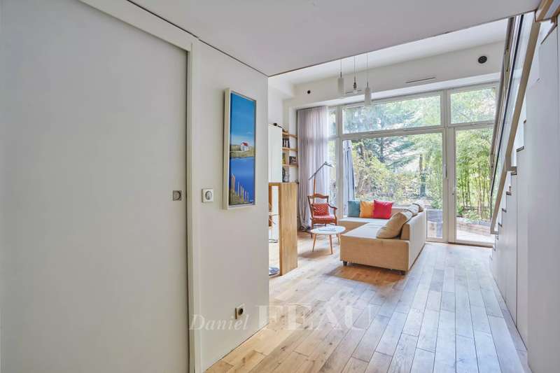 Quai des Grands Augustins. This delightful west-facing 31.50 sqm apartment benefits from a private 24 sqm garden. Featuring high ceilings, it comprises a living room with an open-plan kitchen, a 14 sqm mezzanine bedroom (not included in the living space as defined by the Carrez Law), and a shower room with a wc. Ample fitted storage space.