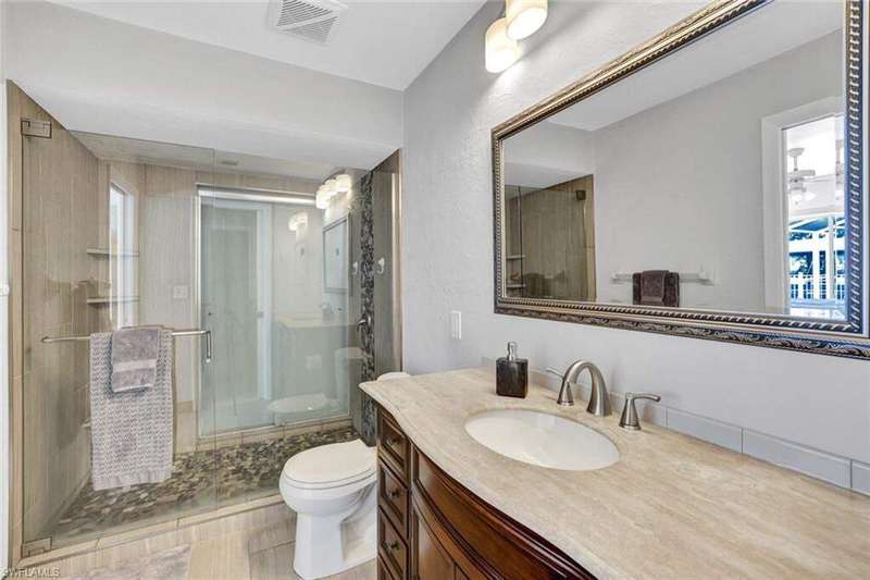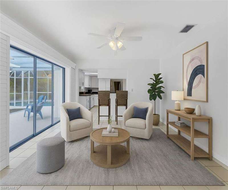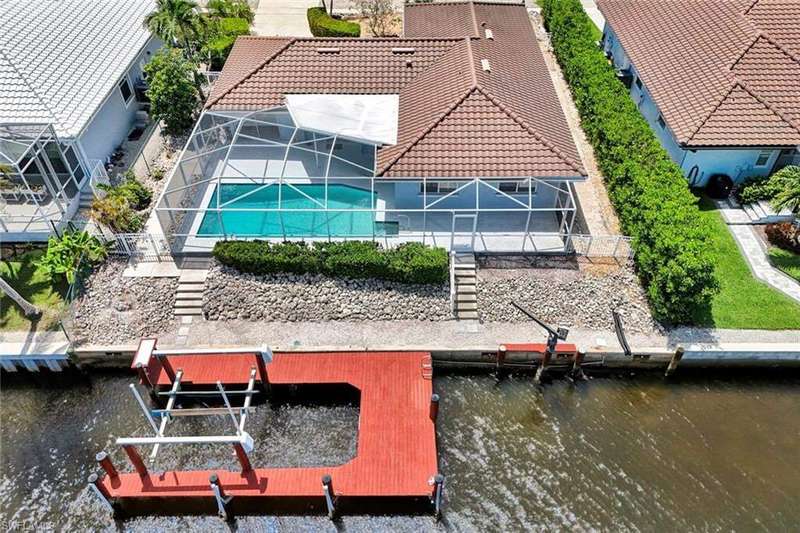 Exceptional value on this beautifully maintained waterfront pool home located on a quiet cul-de-sac with desirable southeast exposure for all-day natural light. This 3-bedroom, 2-bath home offers a bright and open layout with plantation shutters, tile plank and carpet flooring, and a welcoming double-door entry. The kitchen features white cabinets, granite countertops, stainless steel appliances, and a pantry. The spacious primary suite includes private outdoor access, while two guest bedrooms share a full bath. Enjoy outdoor living on the screened lanai (2019) overlooking the retiled and resurfaced pool (2017). Additional upgrades include new HVAC (2023), water heater (2023), roof (2017), and garage door (2018). A new seawall is scheduled for 2025 or 2026. The low-maintenance yard is a tropical retreat with a mature avocado tree, plumeria, and hurricane shutters for added protection. This move-in ready home offers comfort, peace of mind, and true Florida living-ideal for full-time or seasonal enjoyment.