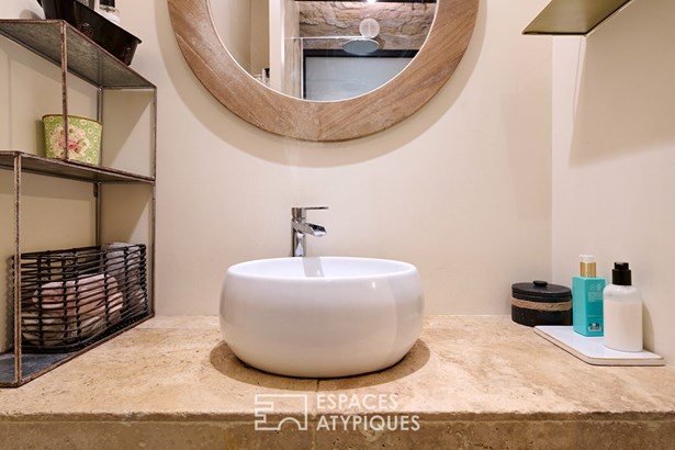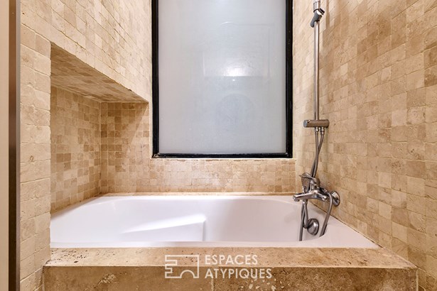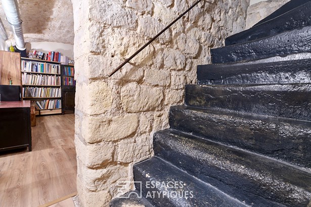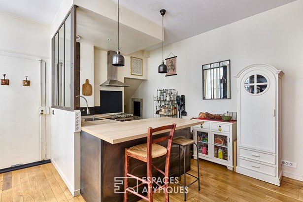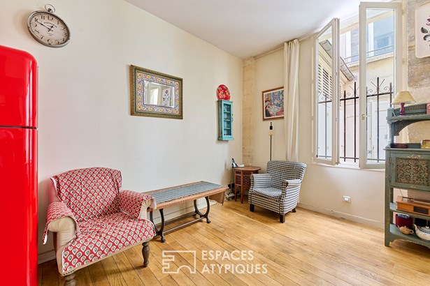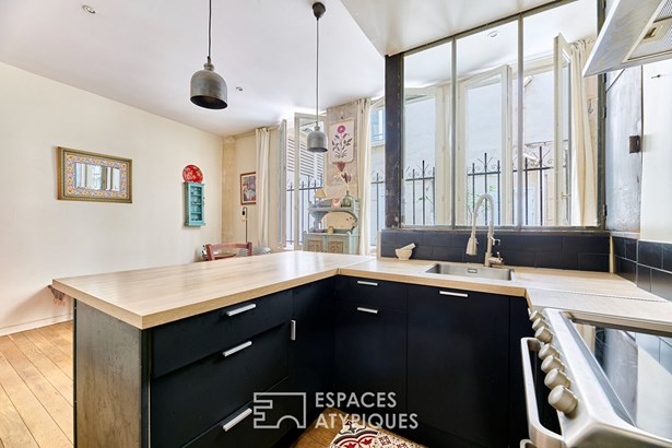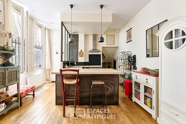 As in a small house, the private entrance is located in the courtyard and opens onto a living room with open fitted and equipped kitchen of almost 20.47m2 with 3m high ceilings.