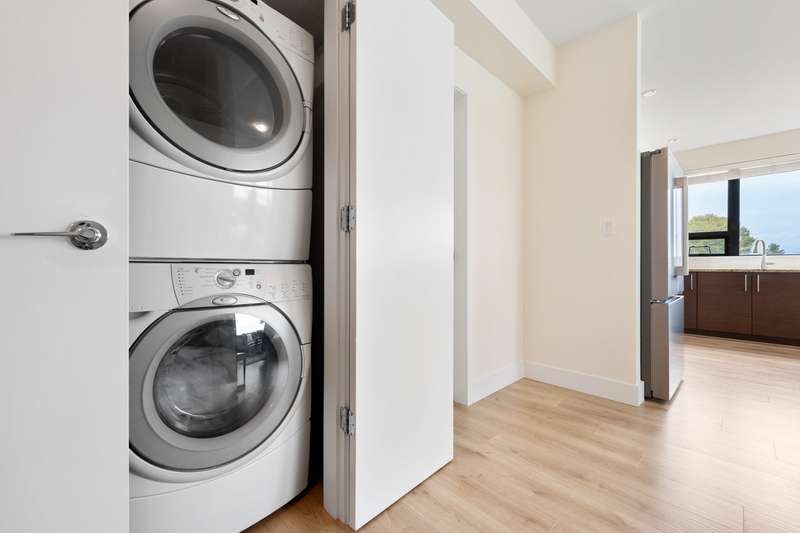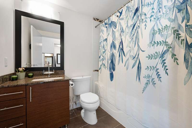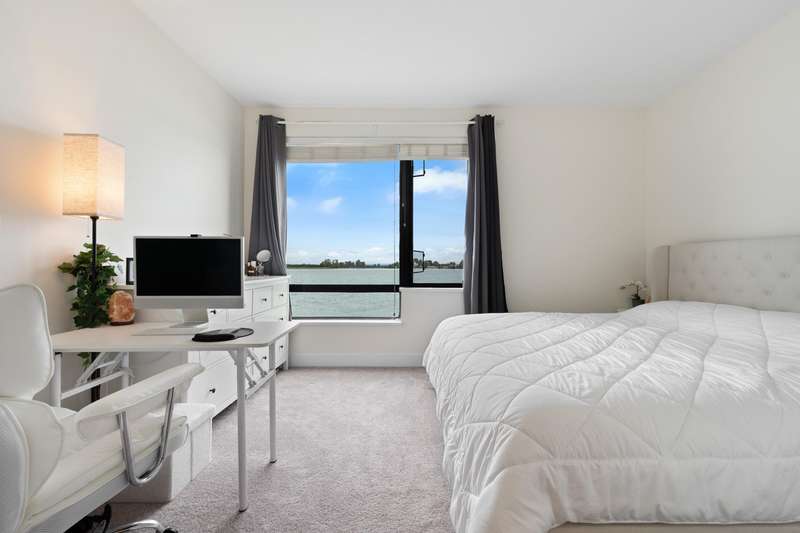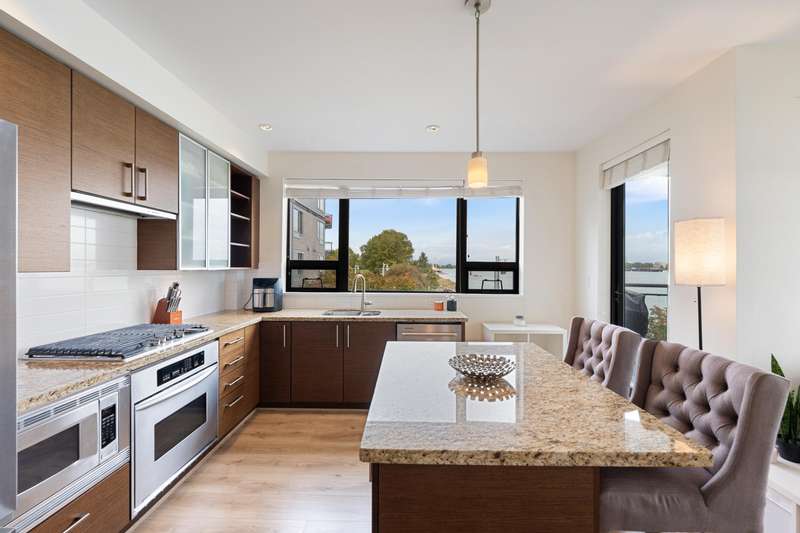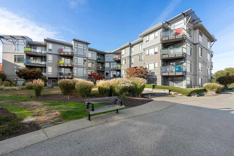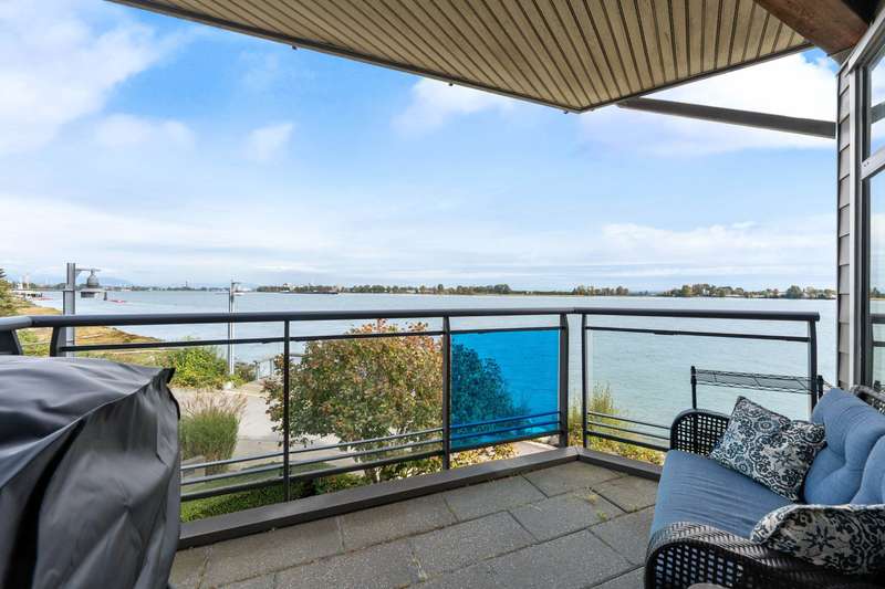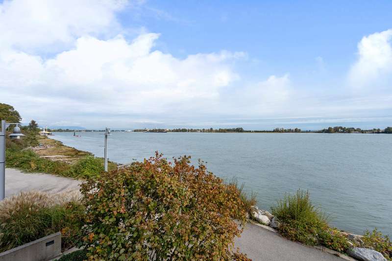 WATERSTONE PIER | Riverfront living with Mount Baker views. This bright, spacious 2-bed/2-bath home overlooks the Fraser River from the kitchen, living room and primary suite. The open kitchen features granite counters and stainless steel appliances, flowing into a generous living area with 9-ft ceilings, A/C and an electric fireplace. A handy foyer nook is perfect for a home office. Enjoy the beautifully landscaped courtyard and riverfront walking trail. Two secure underground parking stalls plus visitor/street parking. Steps to SilverCity, water park, Richmond Ice Centre, shops and dining, with quick access to Hwy 99 and YVR. Move-in ready.