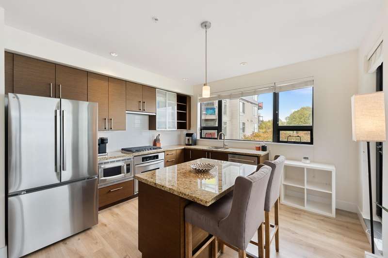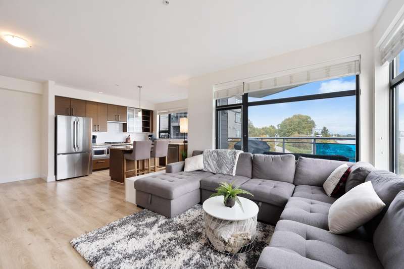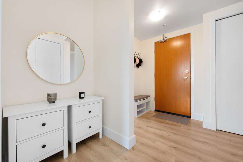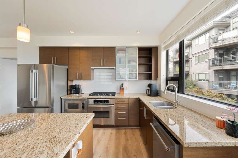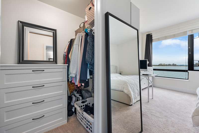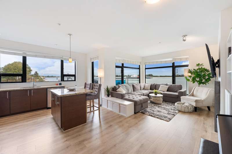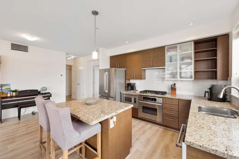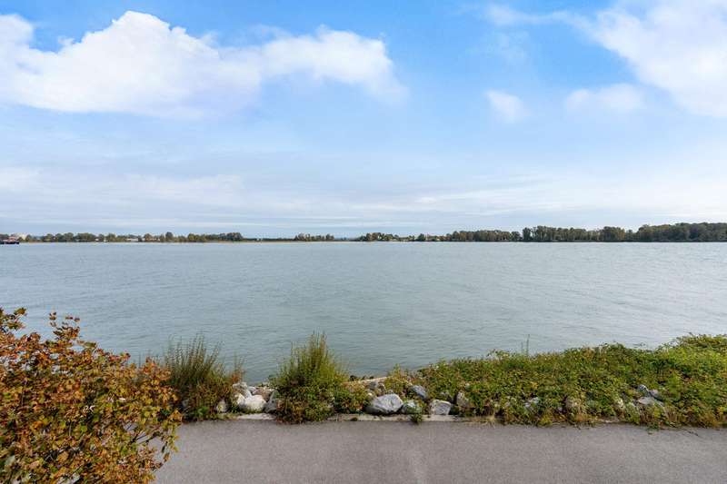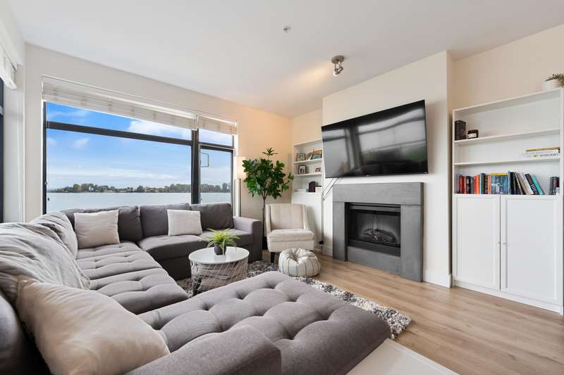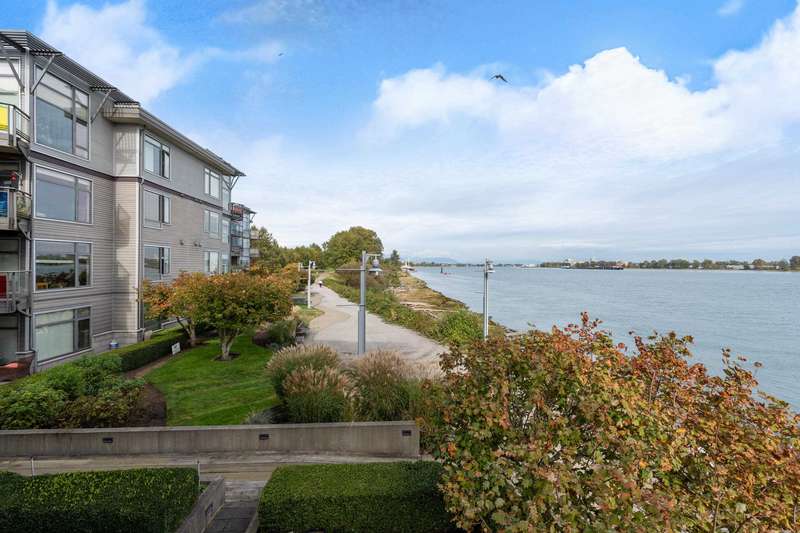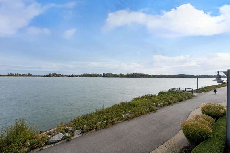 WATERSTONE PIER | Riverfront living with Mount Baker views. This bright, spacious 2-bed/2-bath Corner home overlooks the Fraser River from the kitchen, living room and primary suite. The open kitchen features granite counters and stainless steel appliances, flowing into a generous living area with 9-ft ceilings, A/C and an electric fireplace. A handy foyer nook is perfect for a home office. Enjoy the beautifully landscaped courtyard and riverfront walking trail. Two side by side underground parking stalls plus visitor/street parking. Steps to SilverCity, water park, Richmond Ice Centre, shops and dining, & quick access to Hwy 99& ironwood mall. Move-in ready.