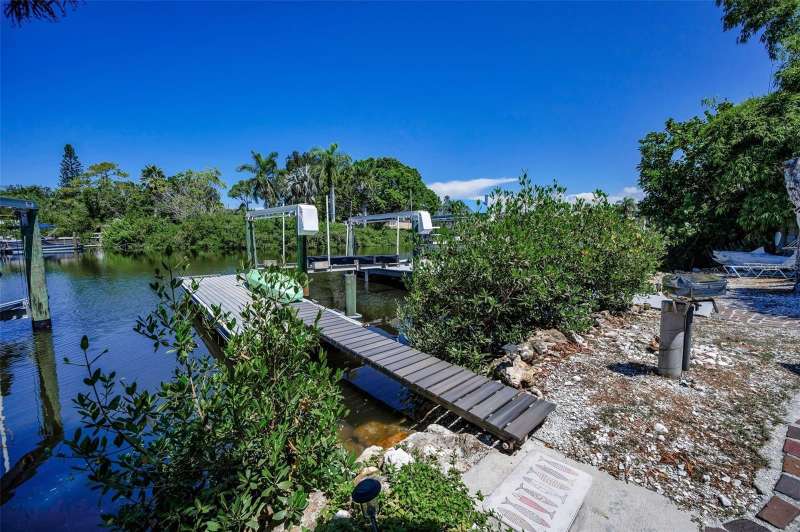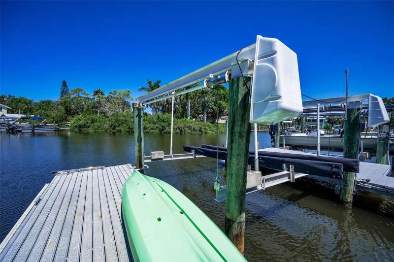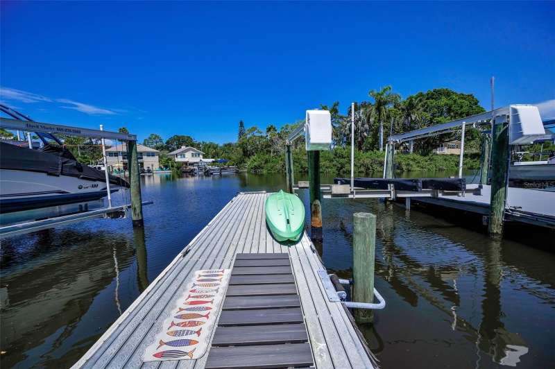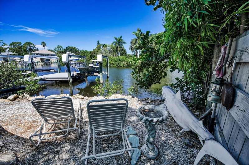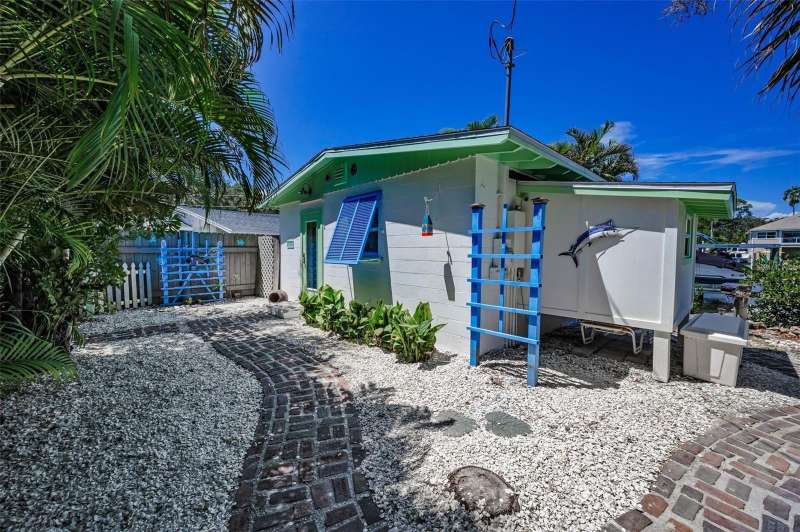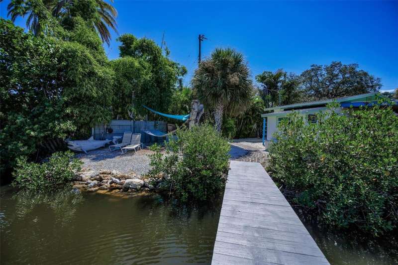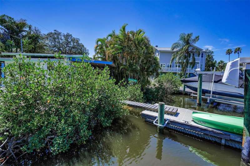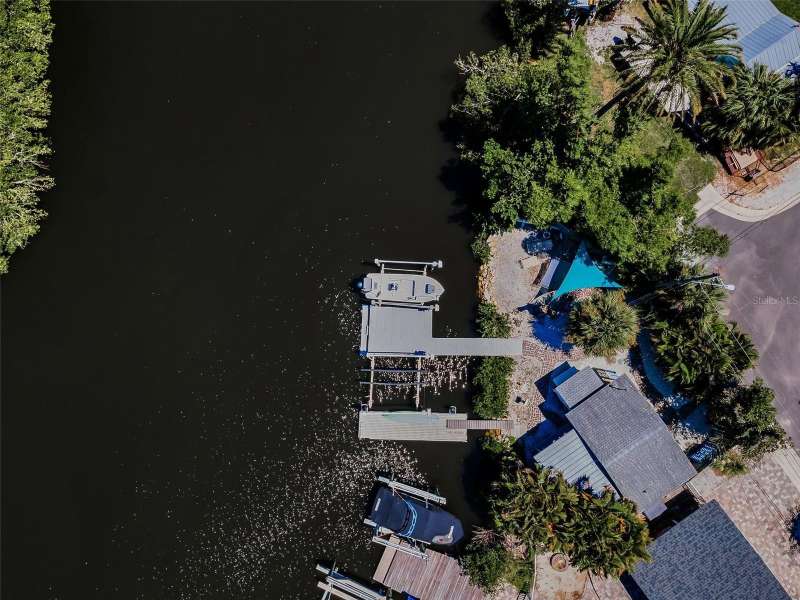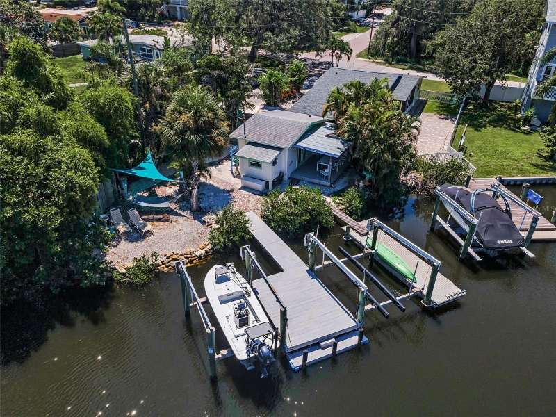 Your Opportunity Awaits! BOATER’S PARADISE in Crystal Beach! Nestled on a little private corner lot along a deep-water canal, this one-of-a-kind coastal retreat offers direct access to the Intracoastal Waterway in just minutes. Designed for boating enthusiasts, the property features a secluded cottage-style boathouse with three slips—including two lifts / Verified minimun of 10,000 LB LIFTS (with a GALVANIZED I BEAM) along with a commercial-grade aluminum floating dock. The charm begins outside with tropical xeriscape landscaping, vintage Augusta brick paver walkways, and a fenced yard accented by nautical details, boat lights, and decorations. Inside, the cheerful cottage showcases high ceilings, water-resistant luxury vinyl flooring, plantation shutters, ceiling fan, nautical lighting and double glass doors opening to the large covered patio and boat slips. A cozy kitchenette provides space for a refrigerator and includes a microwave, while the queen-size bed nook, marble shower, and tankless water heater add comfort and convenience. Outdoor living shines with a large covered porch, washer/dryer hookup, an outdoor shower with hot and cold water, and a custom chiminea fire pit with hammock for the ultimate laid-back lifestyle. Watch the dolphins & manatees come in to play! All kinds of native fish & birds, too! Additional highlights include impact windows and doors, foam-insulated roof, security system with 6 cameras, plus roof and A/C replaced about 8 years ago.This hidden gem is the perfect blend of old Florida charm and modern amenities—a rare affordable opportunity to truly live the beach and boating life and own this unique boat house!