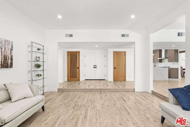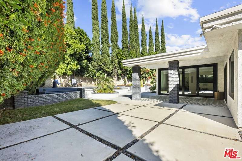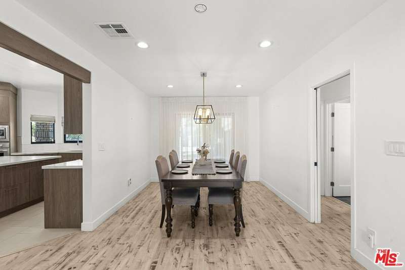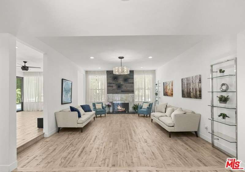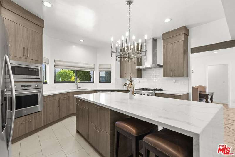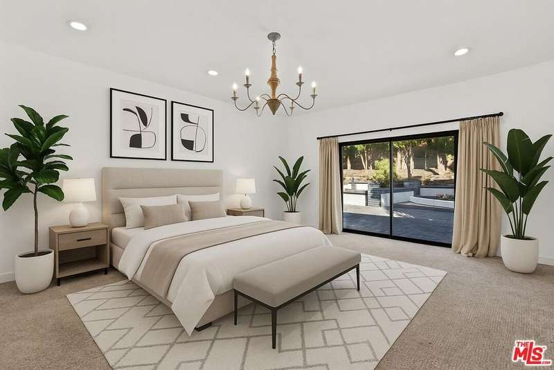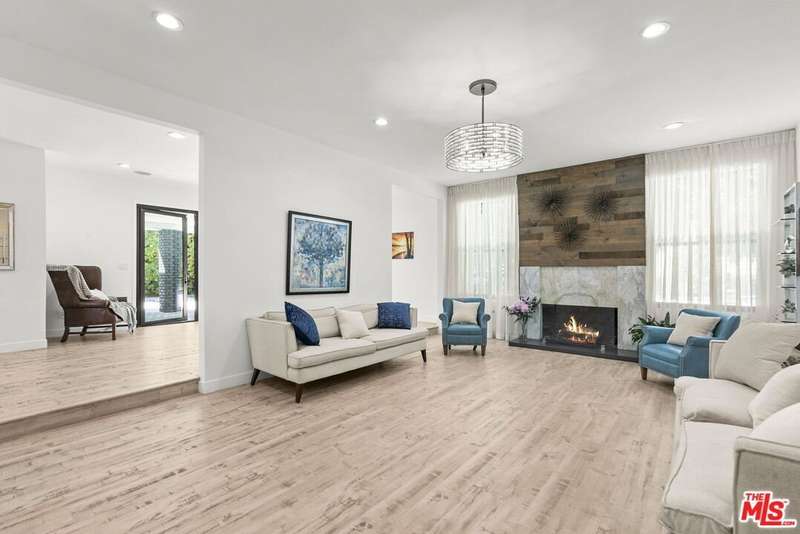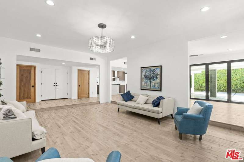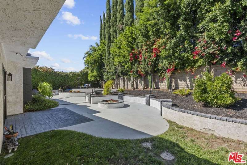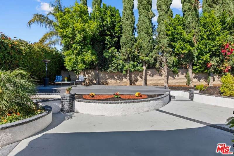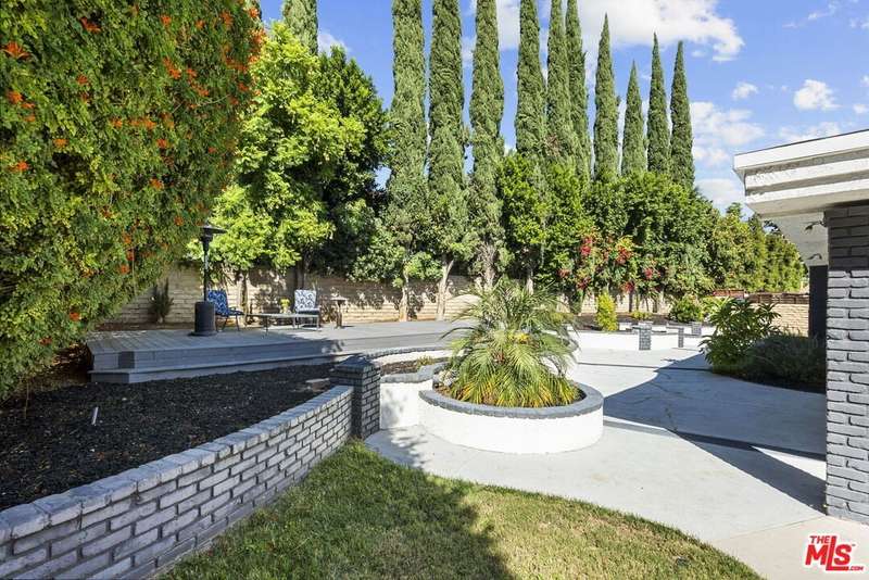 Step inside this elegant single-story home in Northridge's coveted Devonshire Highlands, where modern design meets timeless comfort. Spanning nearly 2,800 sq ft on an almost 13,000 sq ft lot, this 4-bedroom, 4-bath retreat welcomes you with an airy open layout, high ceilings, and abundant natural light from modern sliding doors that frame the lush greenery outside. The formal entry leads to a sophisticated living room with a striking marble-and-wood fireplace and calming neutral tones. The chef's kitchen is the heart of the home, showcasing an enormous center island, quartz countertops, custom cabinetry, and stainless steel appliances, flowing seamlessly into the family room with accordion glass doors that open to the backyard for effortless indoor-outdoor living.The dining area offers elegance with a modern chandelier and large sliding doors, ideal for family gatherings or entertaining guests. The primary suite is a private retreat featuring a spa-inspired bath, soaking tub, and a spacious walk-in closet. Nearly every bedroom includes its own walk-in closet, ensuring comfort and functionality throughout. Additional highlights include recessed smart lighting, newer windows, modern bathrooms, a 3-car garage, a huge backyard with mature trees that enhance both privacy and beauty. A covered patio outdoor with spacious deck, and newly refreshed landscaping make this home perfect for relaxation or entertaining. With designer finishes, modern upgrades, and a cul-de-sac location near top-rated schools, shops, and dining, this home captures the essence of modern California living.