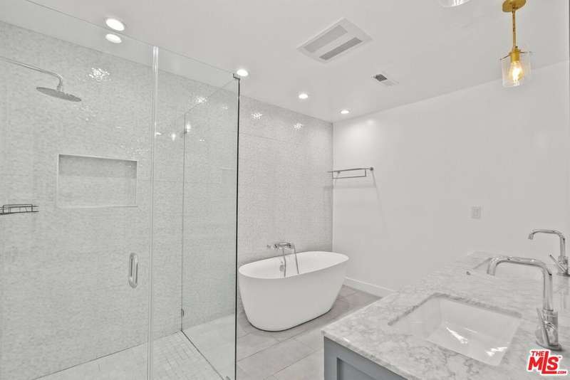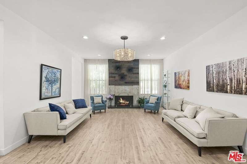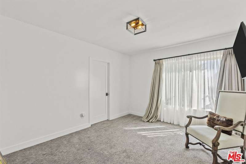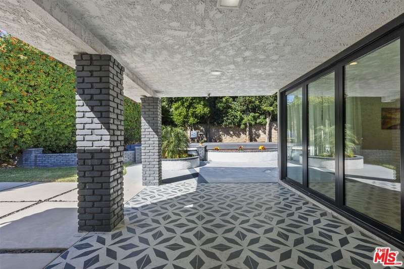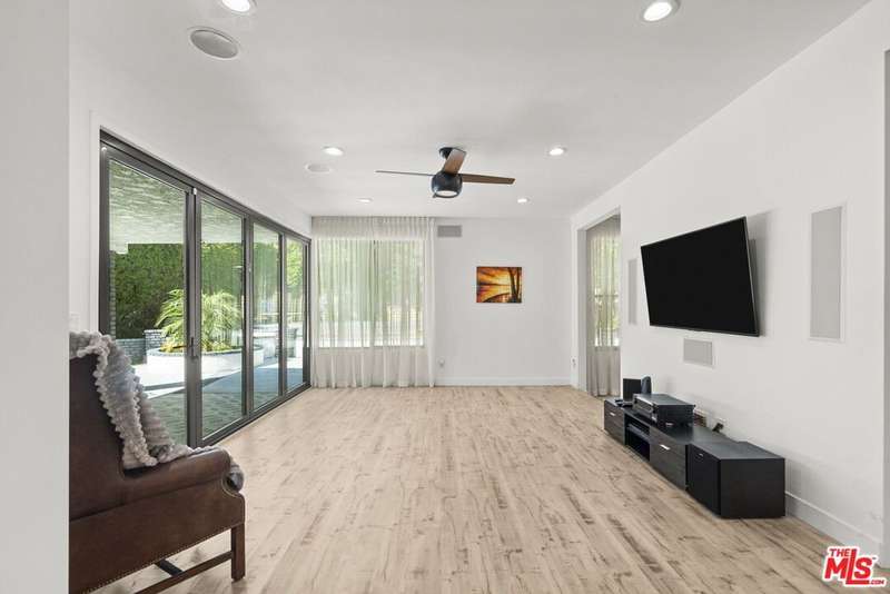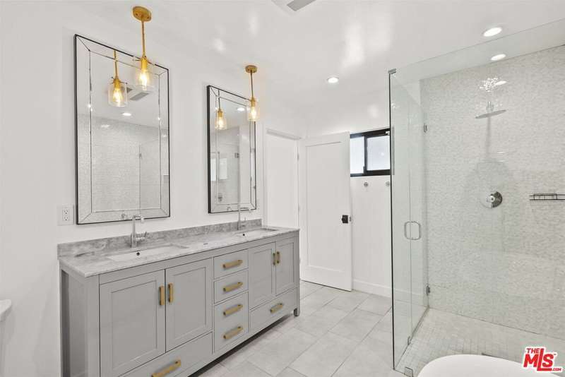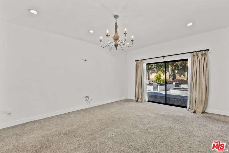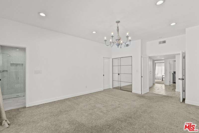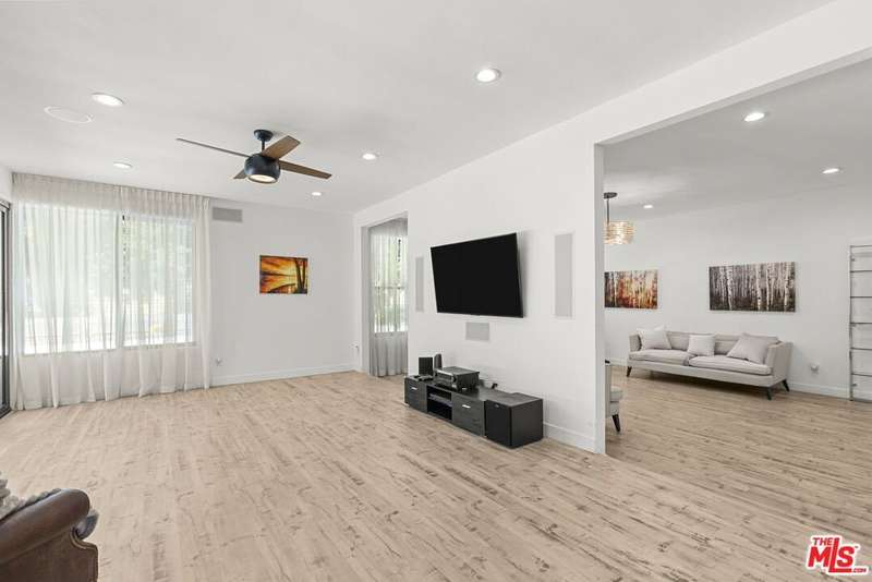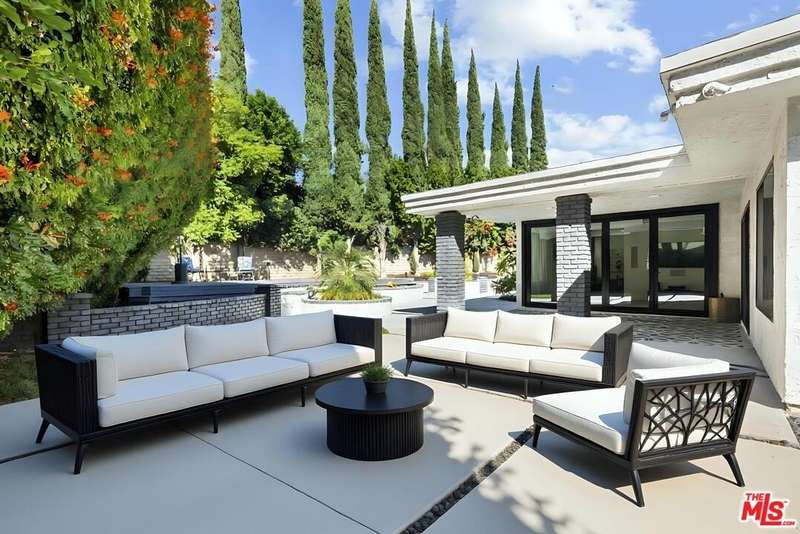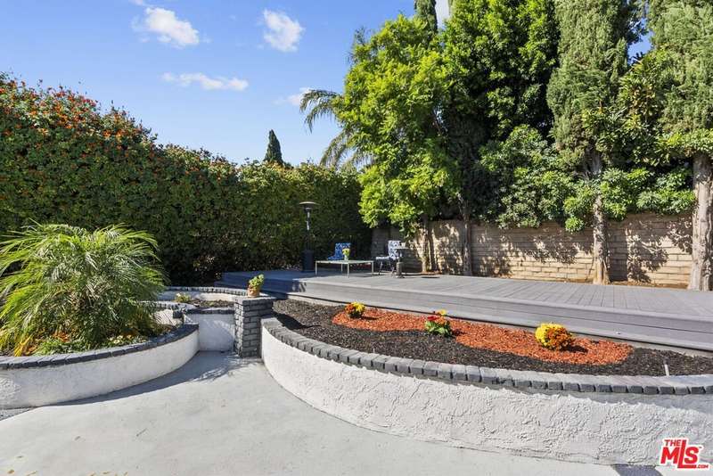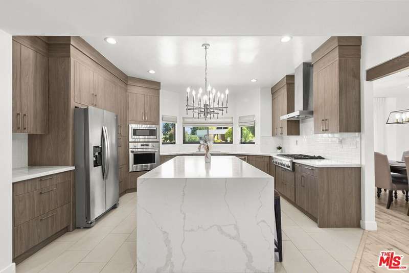 Step inside this elegant single-story home in Northridge's coveted Devonshire Highlands, where modern design meets timeless comfort. Spanning nearly 2,800 sq ft on an almost 13,000 sq ft lot, this 4-bedroom, 4-bath retreat welcomes you with an airy open layout, high ceilings, and abundant natural light from modern sliding doors that frame the lush greenery outside. The formal entry leads to a sophisticated living room with a striking marble-and-wood fireplace and calming neutral tones. The chef's kitchen is the heart of the home, showcasing an enormous center island, quartz countertops, custom cabinetry, and stainless steel appliances, flowing seamlessly into the family room with accordion glass doors that open to the backyard for effortless indoor-outdoor living.The dining area offers elegance with a modern chandelier and large sliding doors, ideal for family gatherings or entertaining guests. The primary suite is a private retreat featuring a spa-inspired bath, soaking tub, and a spacious walk-in closet. Nearly every bedroom includes its own walk-in closet, ensuring comfort and functionality throughout. Additional highlights include recessed smart lighting, newer windows, modern bathrooms, a 3-car garage, a huge backyard with mature trees that enhance both privacy and beauty. A covered patio outdoor with spacious deck, and newly refreshed landscaping make this home perfect for relaxation or entertaining. With designer finishes, modern upgrades, and a cul-de-sac location near top-rated schools, shops, and dining, this home captures the essence of modern California living.