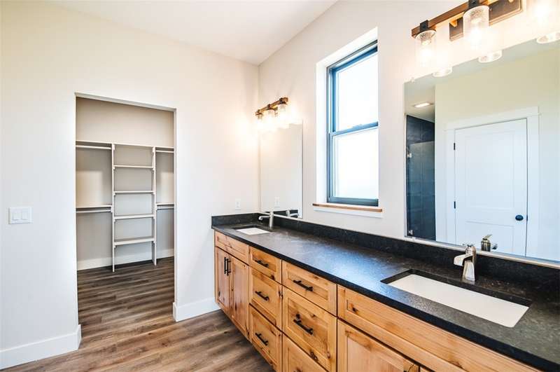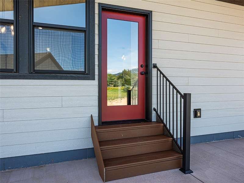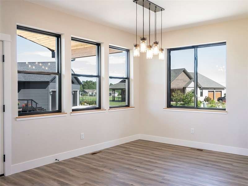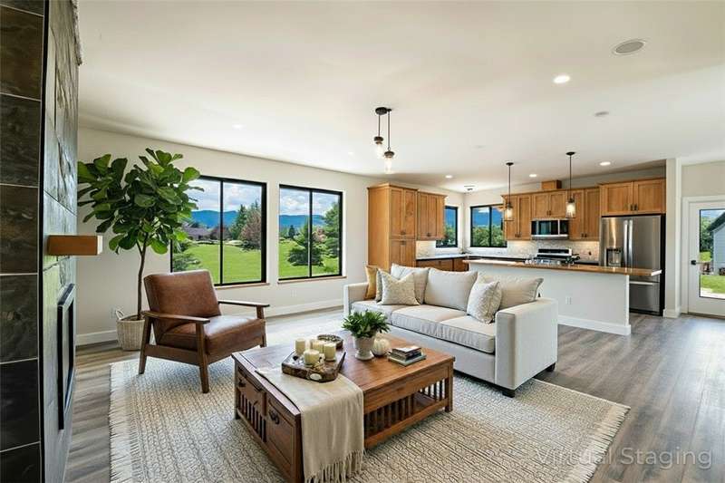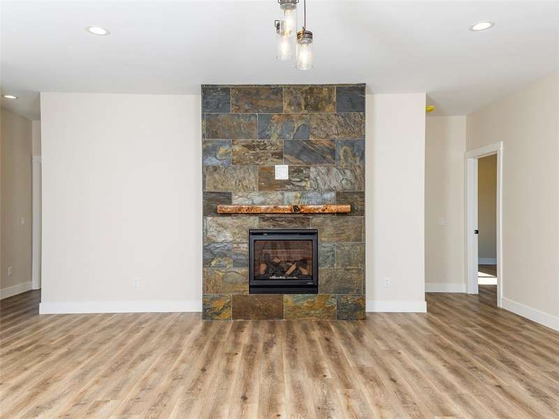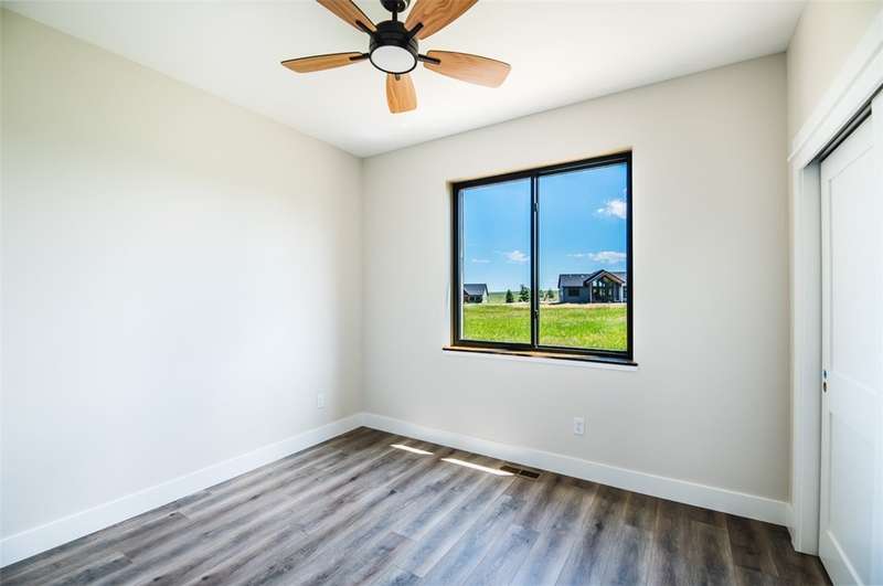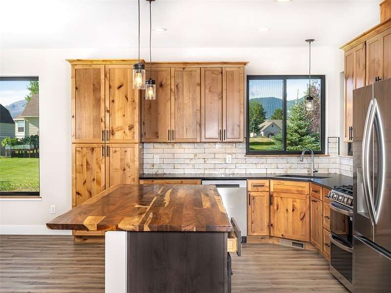 Exceptional craftsmanship and thoughtful upgrades define this stunning custom ranch home-part of the newest collection by Mycke Custom Homes, LLC. Enjoy outdoor living at its finest with a welcoming covered front porch and a spacious 372 sq ft covered patio featuring a tongue-and-groove ceiling, dimmable can lighting, and unobstructed views of the Beartooth Mountains and ski hill. The exterior is finished with durable LP Smart Siding and accented by Versetta stone wainscoting. Inside, you'll find rich Knotty Alder cabinetry, window sills, and a barn door in the primary suite, along with granite countertops throughout in a leather finish. The smoke-stained island is topped with a warm butcher block countertop, complementing the open kitchen design. A floor-to-ceiling tiled fireplace with a custom-milled live edge mantel anchors the living space, while custom-tiled showers, 9' ceilings, and luxury vinyl plank flooring add to the home's upscale comfort and style.