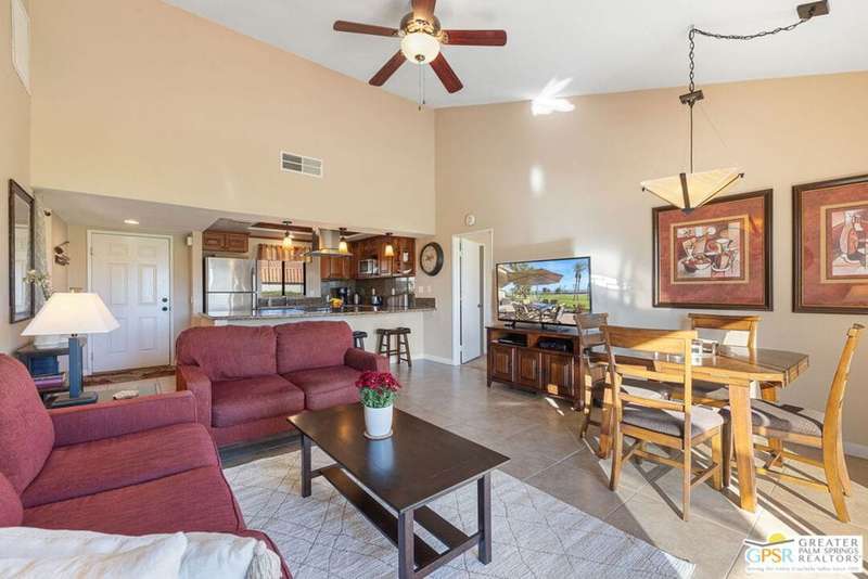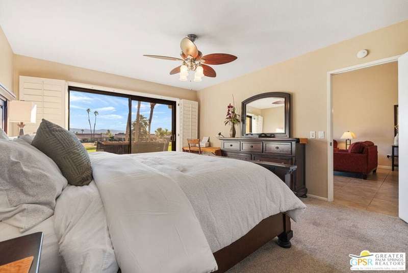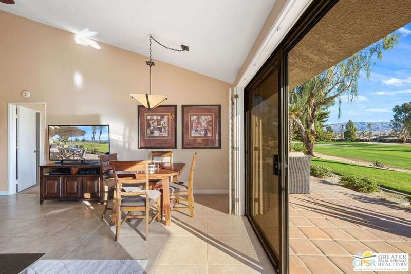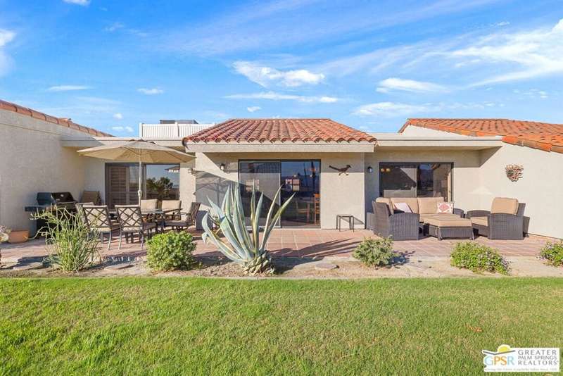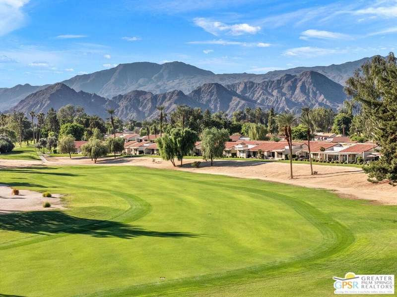 It's all about location for this popular Vintage Model Plan within the gates of Palm Desert Resort CC overlooking the 13th fairway with elevated views of golf course and mountains. Upon entering, you'll be awed by the light and bright feel with open concept kitchen with expansive peninsula counter top with barstool seating and cabinets galore. Intelligent floor plan with owner's suite and bath is on one side of the home and guest bedroom and bath on the opposite, which is perfect for privacy and separation and makes this the most popular model. Completely relax in the back patio with an extended patio while enjoy the east facing mountains that emits a purple during certain hours called the amethyst hour. Offered furnished per inventory list to help for immediate enjoyment. Palm Desert Resort CC features 18-hole championship golf course, newly renovated clubhouse, 20 pools and spas, and the Coachella Valley's premier pickleball and tennis club. Triple threat home makes it a perfect for primary residence, vacation rental or second home.