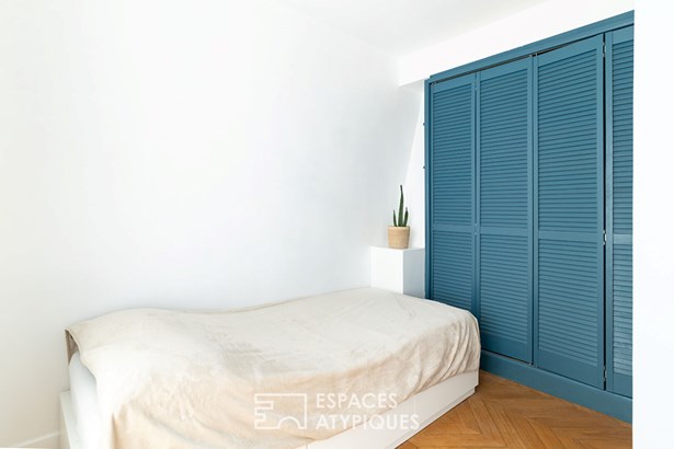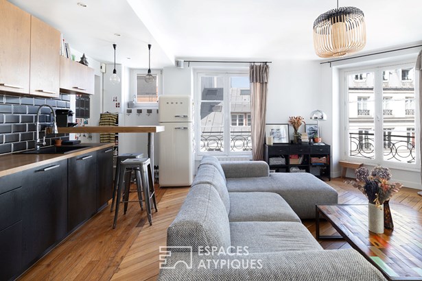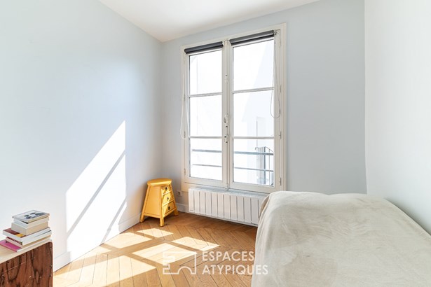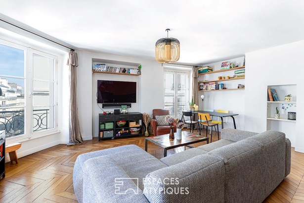 From the moment you enter, light floods in thanks to the double exposure and large windows overlooking the Parisian rooftops.