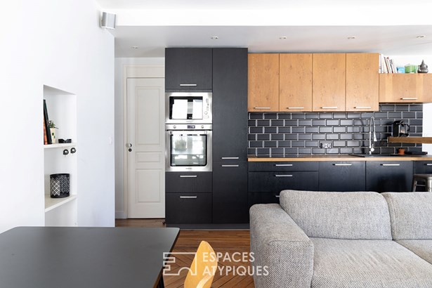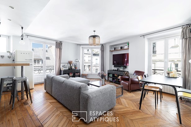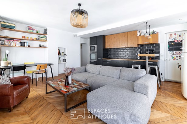 Located on the 4th floor of an old building with no elevator, this 73.49 m2 (71.46 m2) corner apartment has undergone a complete and inspired renovation, orchestrated by an architect.
