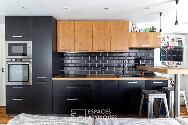 The open-plan living space features an open-plan kitchen with a strong design, playing on contrasting materials and colors, and a convivial living room extended by a dining room.