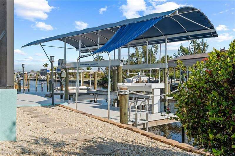 WHOA!!! Have I got the Charter Captains, Fishermen or Women's DREAM PROPERTY IN PARADISE!! This home is like having your own MINI MARINA right here! With two boat lifts(yes I said 2) one 20,000 lb. and the other is 7000 lb. gives you a choice between Deep Sea fishing and Shallow water fishing. The Captains wraparound composite wood dock will last a lifetime and has plenty of room for maneuvering with a large cleaning station and Dock Box. Situated on the Dawson Canal with Direct 5 minute access to Matlacha Pass which gives you many directional options from Pine Island Sound to the North towards Cabbage Key or South to the Sanibel Bridges and Fort Myers Beach to exploring the Caloosahatchee River, your choice! In any direction you decide, the fishing and boating options are endless from catching a World Famous Tarpon in Boca Grande Pass to hunting the elusive snook, redfish and snapper in the back waters. You are right in the middle of Some of the Best fishing Florida has to offer! The home itself...being completely re-constructed down to the stringers the upgrades are endless throughout the home including NEW ELECTRICAL WITH TOUCH LIGHTING, NEW PLUMBING, LUXURY VINYL FLOORING, HURRICANE RATED WINDOWS AND DOORS, GRANITE COUNTER TOPS, SHAKER CABINETRY, and BRAND NEW A/C AND DUCTWORK, just to name a few. Being SOLD TURN-KEY FURNISHED makes moving in a breeze and the RELAXED COASTAL DECOR will Welcome you as you walk through the door. The master suite has sliding door access to the covered lanai area with paver pool deck so you can slip into the HOT TUB after a great day of fishing or COOL OFF IN YOUR OVERSIZED POOL with a well-deserved beverage. There are 50 rod holders in the ONE CAR GARAGE along with the LAUNDRY AREA/UTILITY SINK, and the owner expanded the driveway and put in a tall reinforced Carport to house more and bigger vehicles along with cover for the pool equipment, 50lb ice machine, and extra freezer to store all those fish! Located on a cul-de-sac also makes for less traffic and more privacy with a very low maintence yard and nice screened front porch to relax on. I GUESS WHAT I AM TRYING TO SAY HERE IS... BETTER MAKE YOUR APPT. TODAY BECAUSE THIS IS TRUELY WHAT FLORIDA LIVING IS ALL ABOUT!!