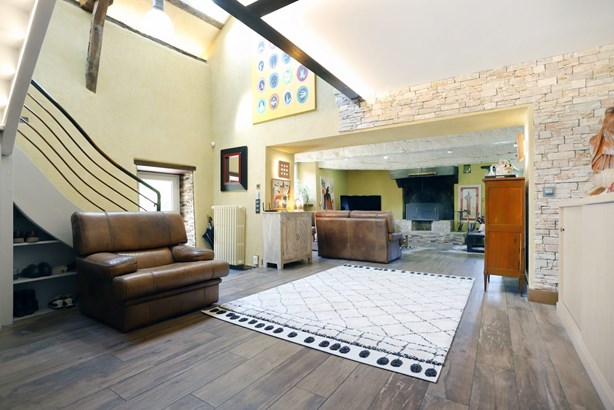 Located on the edge of a wooded environment on a wooded and landscaped plot of over 4000 sqm, the stone building stands out for its unique architecture and generous volumes. Its complete renovation harmoniously combines the charm of the old, respected and magnified, with high-quality contemporary fittings that are revealed in the background. Preceded by its south-facing terrace and bordered by a remarkable olive tree, the garden level opens onto a spacious entrance whose cathedral ceiling immediately provides a feeling of space.