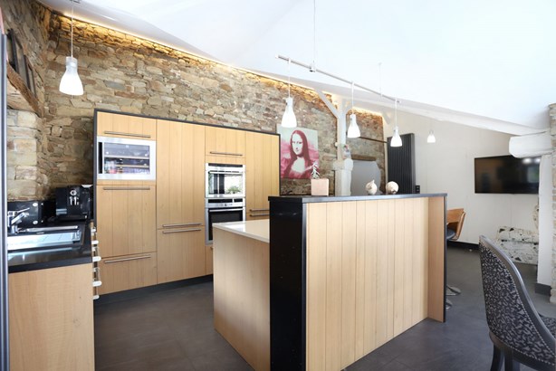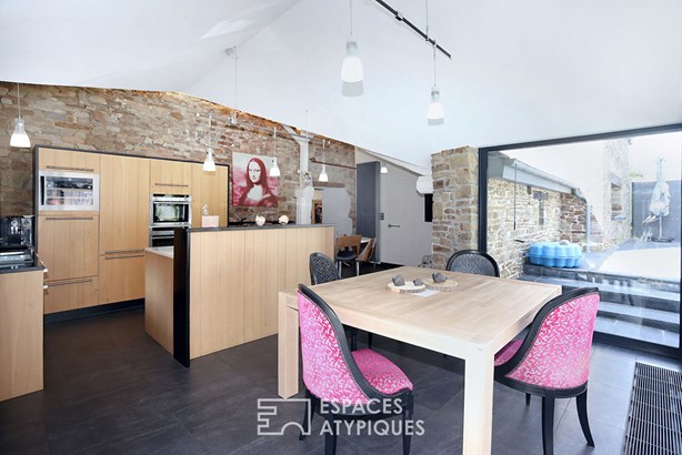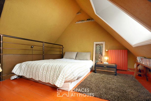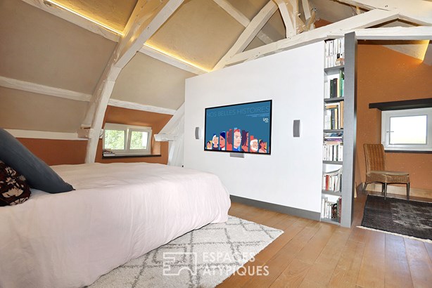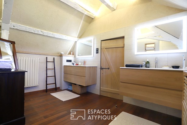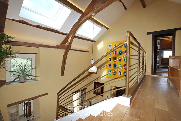 Set back, a hallway leads to a large bedroom topped with a mezzanine, then to a bathroom. In addition, a second fitted and equipped kitchen that can be transformed into an additional bedroom, enriches the ground floor. Connected by a beautiful oak staircase, the more intimate floor reveals the night spaces. There we discover a bedroom, a bathroom, then a comfortable master suite. The latter consists of a bedroom with a custom-made dressing area and a very beautifully designed bathroom.