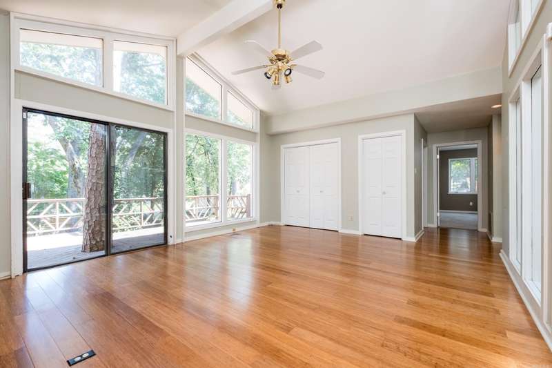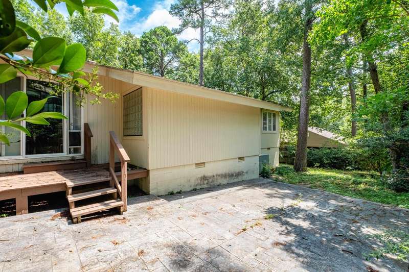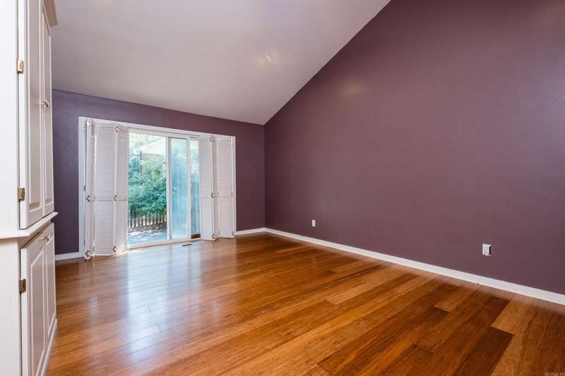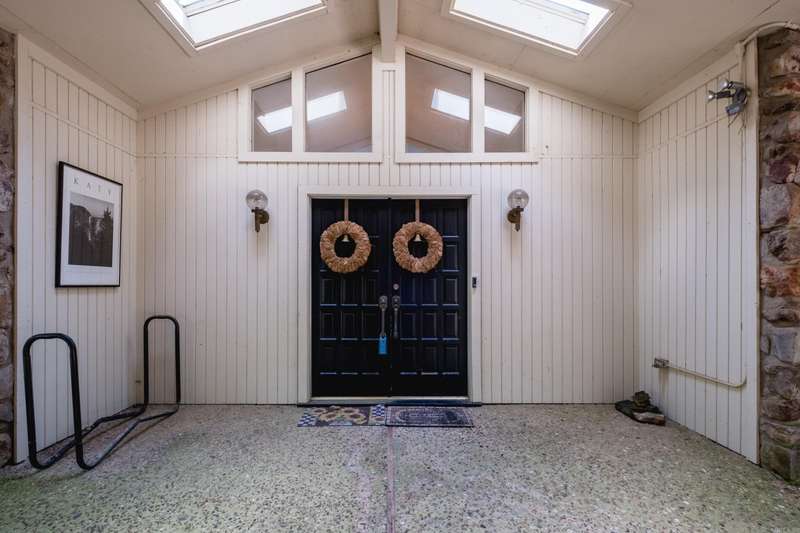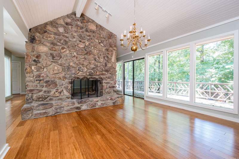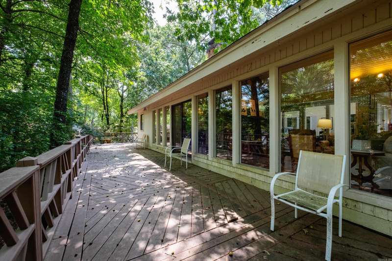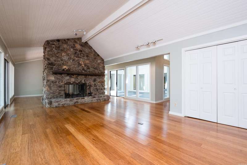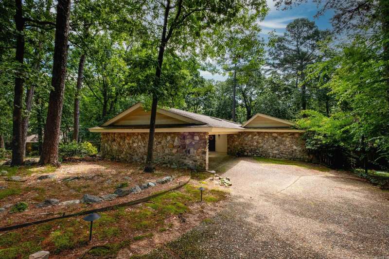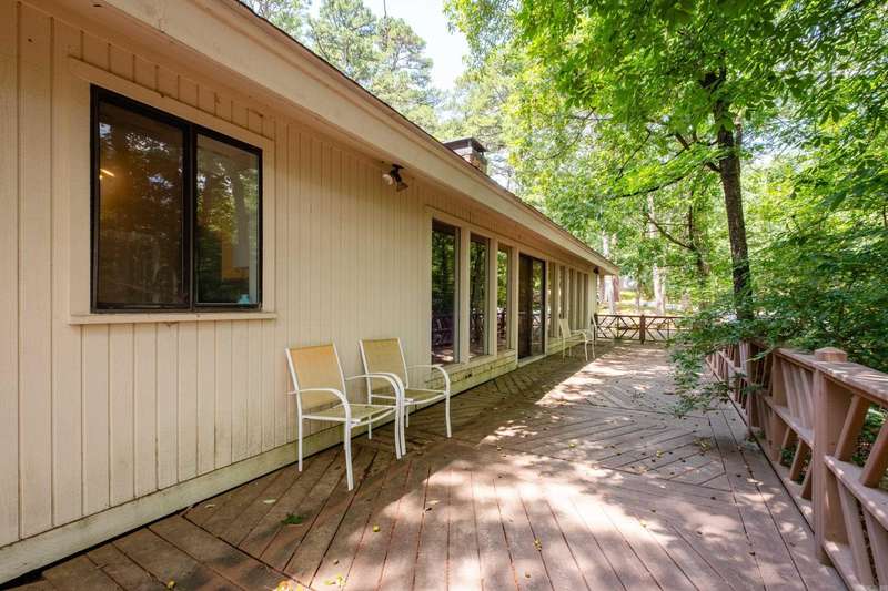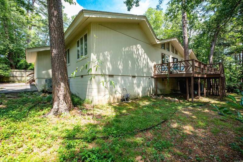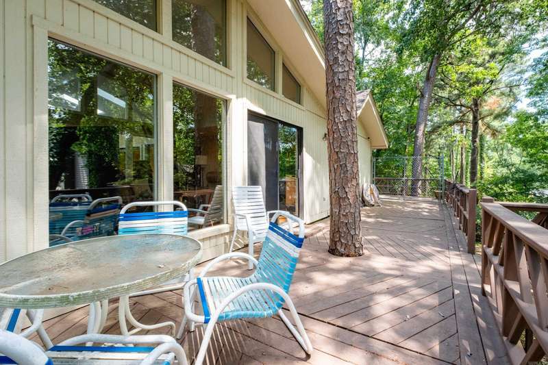 Located on a private cul-de-sac, this distinctive home sits on a large lot beneath a canopy of mature trees, offering both privacy and charm. Vaulted ceilings and skylights throughout fill the interior with natural light and a spacious feel. At the center of the home, a glassed-in, tiled atrium creates a serene space, ideal as a sunroom, office, or garden retreat. Formal living and dining areas are anchored by an impressive dual-sided rock wood-burning fireplace. The lovely kitchen features quartz countertops, a gas range, ample counter space, and opens to a den with glass doors leading to a wraparound deck along the side and back of the home. The primary suite includes vaulted ceilings, a large bath with soaking tub, and access to its own private deck and patio. Two additional bedrooms share a full hall bath, with an extra half bath nearby. A separate laundry closet adds convenience. The home’s overall character blends soft contemporary and traditional elements with warmth and originality. New roof July 2025. Come see!