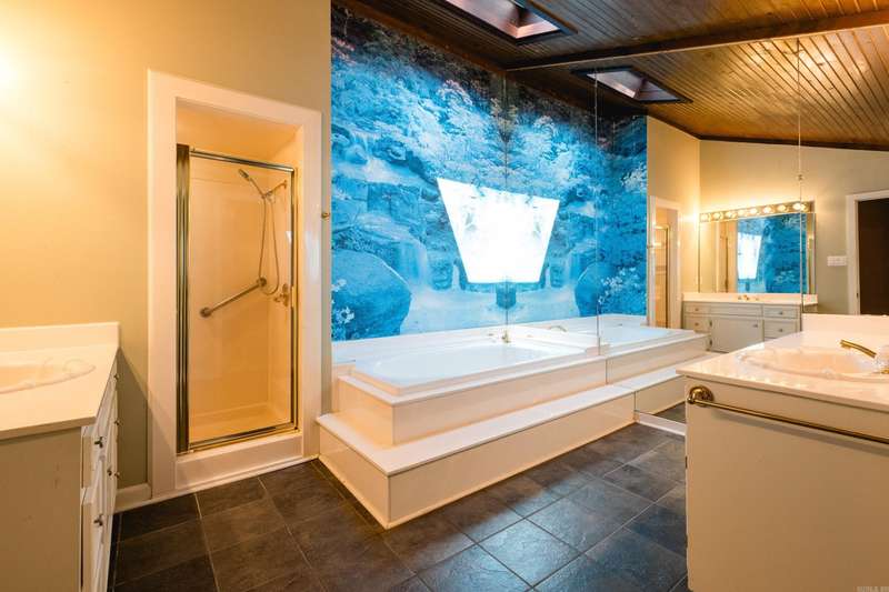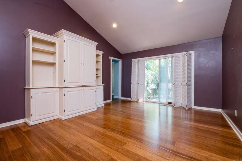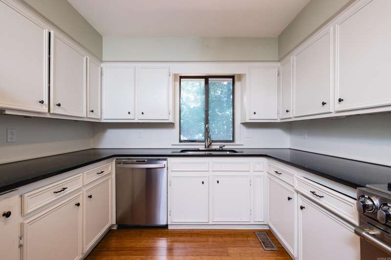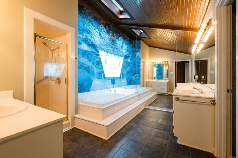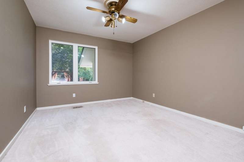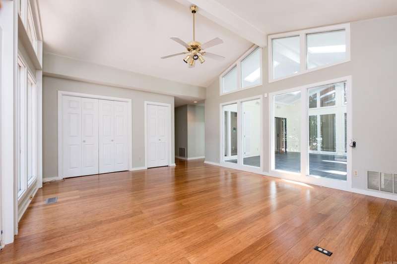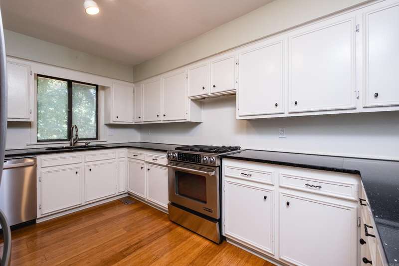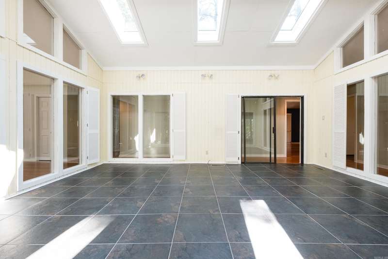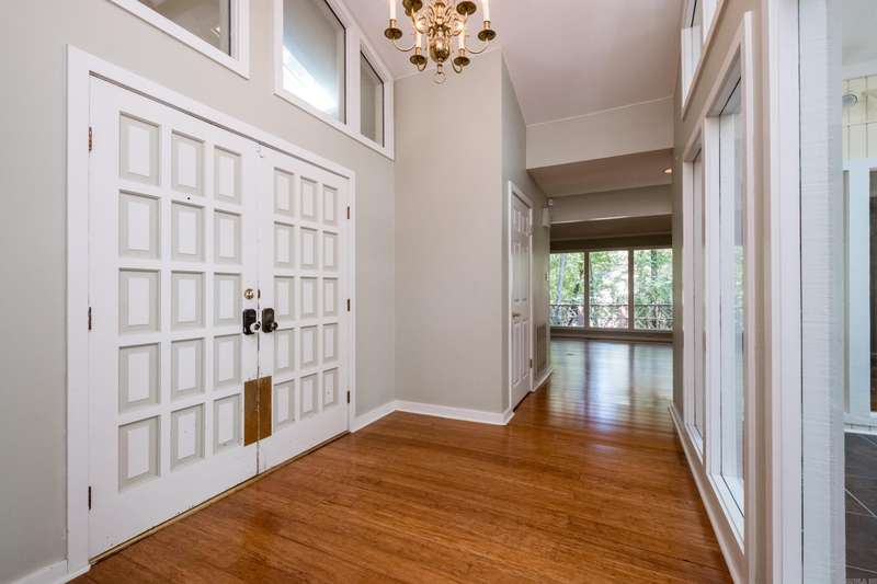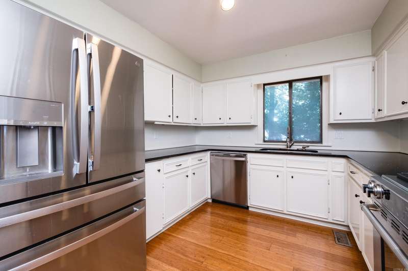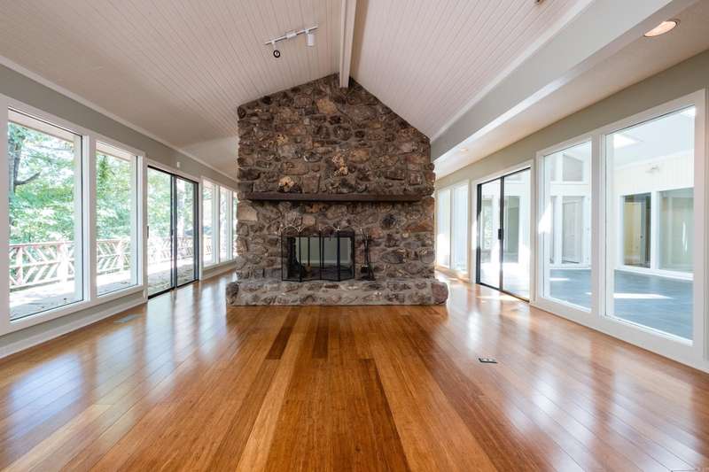 Located on a private cul-de-sac, this distinctive home sits on a large lot beneath a canopy of mature trees, offering both privacy and charm. Vaulted ceilings and skylights throughout fill the interior with natural light and a spacious feel. At the center of the home, a glassed-in, tiled atrium creates a serene space, ideal as a sunroom, office, or garden retreat. Formal living and dining areas are anchored by an impressive dual-sided rock wood-burning fireplace. The lovely kitchen features quartz countertops, a gas range, ample counter space, and opens to a den with glass doors leading to a wraparound deck along the side and back of the home. The primary suite includes vaulted ceilings, a large bath with soaking tub, and access to its own private deck and patio. Two additional bedrooms share a full hall bath, with an extra half bath nearby. A separate laundry closet adds convenience. The home’s overall character blends soft contemporary and traditional elements with warmth and originality. New roof July 2025. Come see!