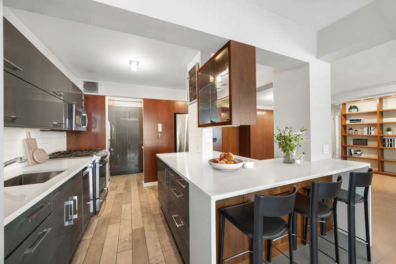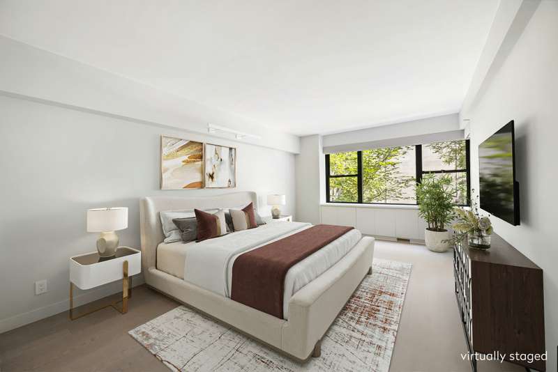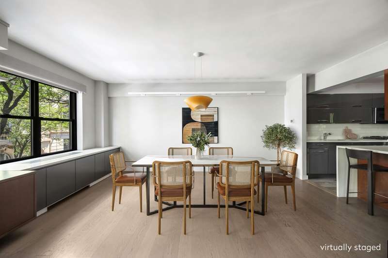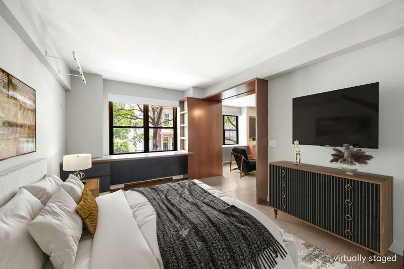 This apartment has been cleverly reconfigured to create a very spacious "loft-like" feeling. Beautiful Cherry wood shelves/book cases and a built-in Cherry wood wine rack. Great storage underneath the windows. There is a Miele washer and dryer in the over-sized pantry off the kitchen. The dining room can easily be converted to a third bedroom. The special space of this lovely Fifth Avenue apartment is an absolute must see.