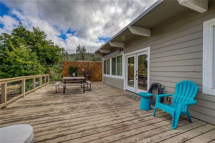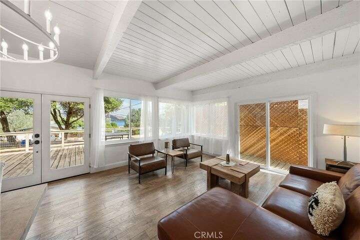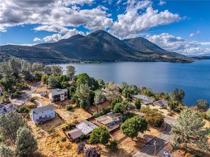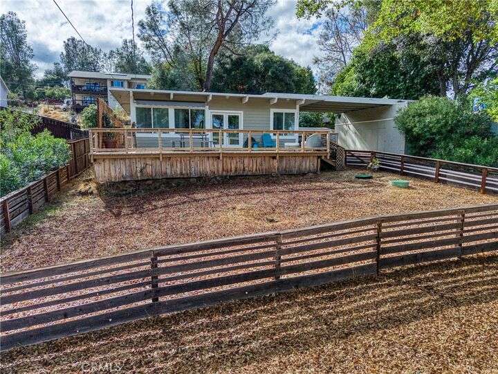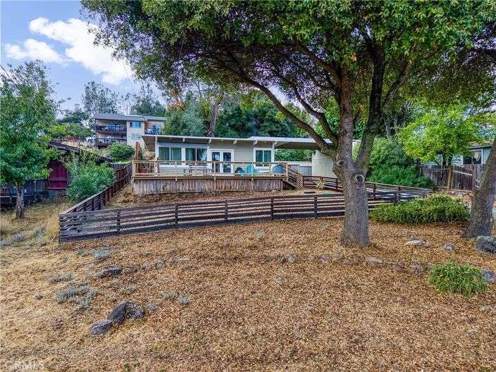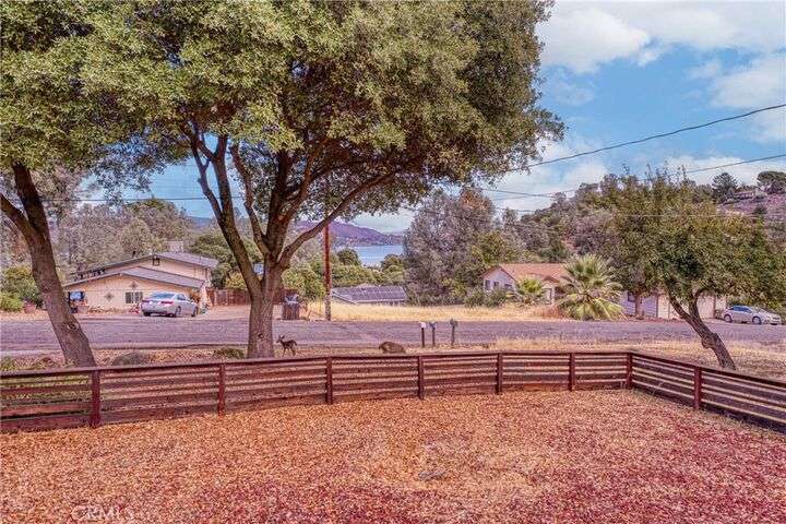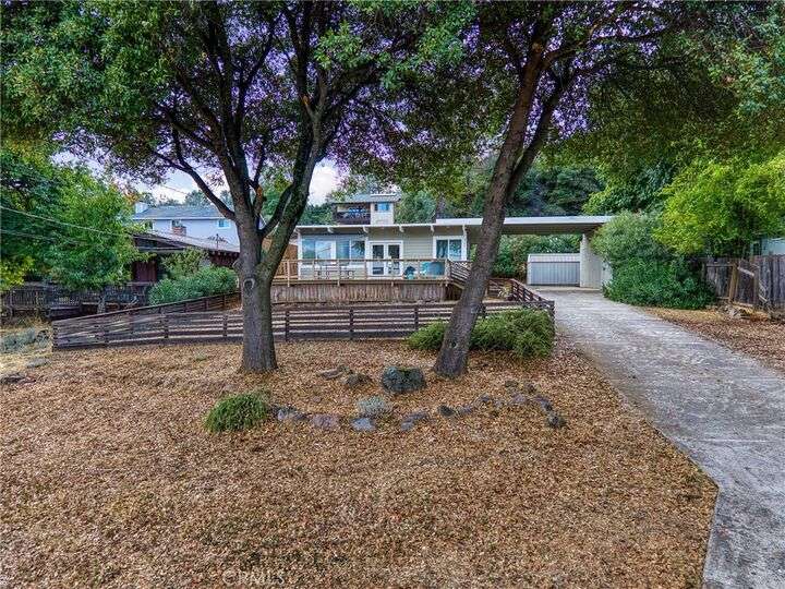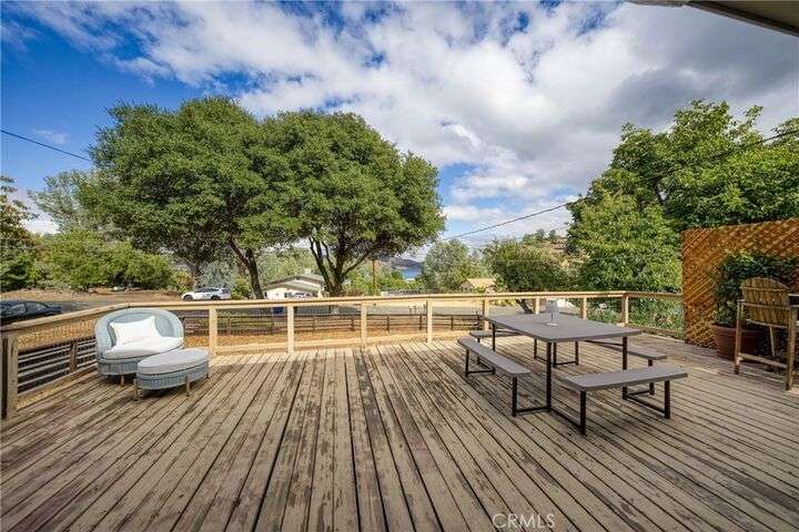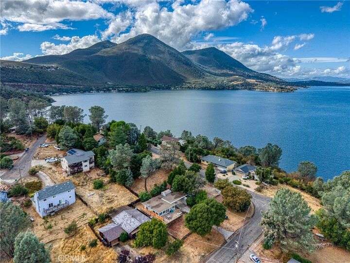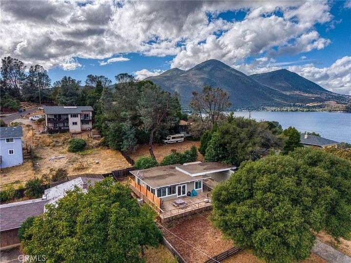 This charming modernized single-level mid-century style lake view home that has been recently upgraded to reflect modern styling. The home features new windows and French doors, laminate flooring throughout, and a light-filled great room with exposed beams and doors that open to a large front deck overlooking the lake. The modern kitchen is equipped with bar counter seating and tile countertops. The stainless steel appliances include a propane range, microwave hood, and refrigerator. The integrated dining room is elevated by a modern chandelier and is located off the French doors that lead to the wrap-around style deck, perfect for entertaining and barbecues. The residence includes two bedrooms that offer slider doors to the wrap around style deck, the rooms are full of natural light. The bathroom was updated with a walk in tiled shower, wainscoting and a single furniture style vanity. Outside, you will find an attached carport with built-in storage, a laundry room and a long, flat driveway that accommodates many cars. The front yard is fenced and is graced by oak trees and nature sightings. Located in Kelseyville Riviera, the home is close to schools, shopping, and the lake. Enjoy country living in a centrally located community in Lake County, California, just 2.5 hours from San Francisco and 2 hours from Sacramento.