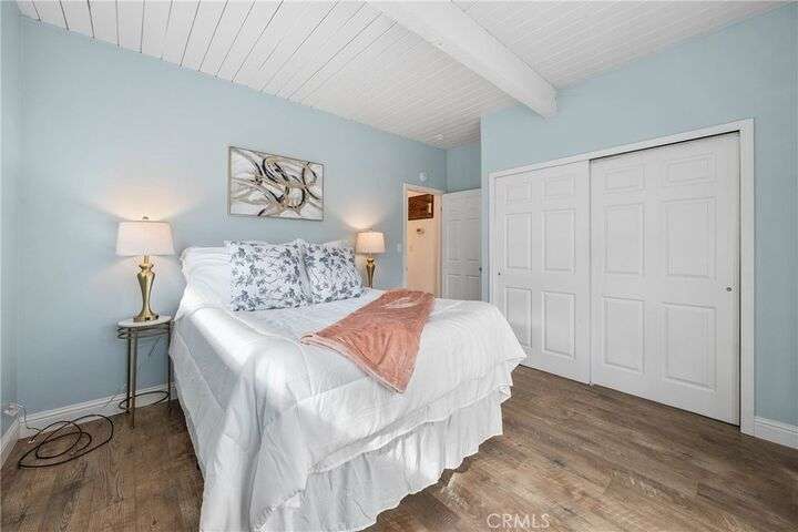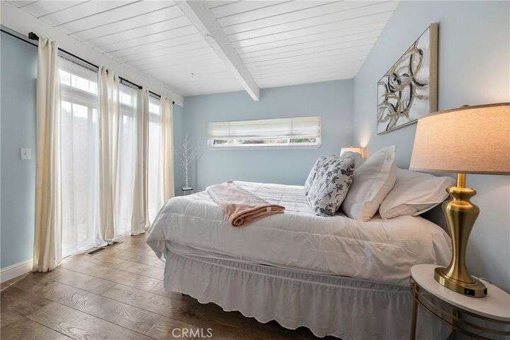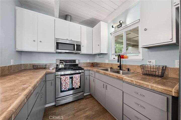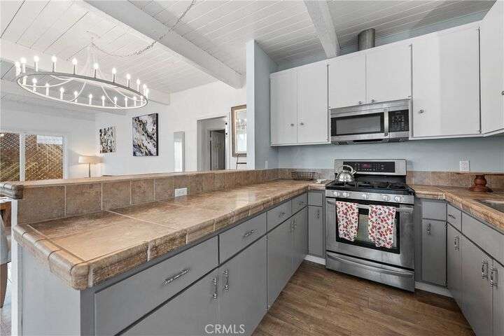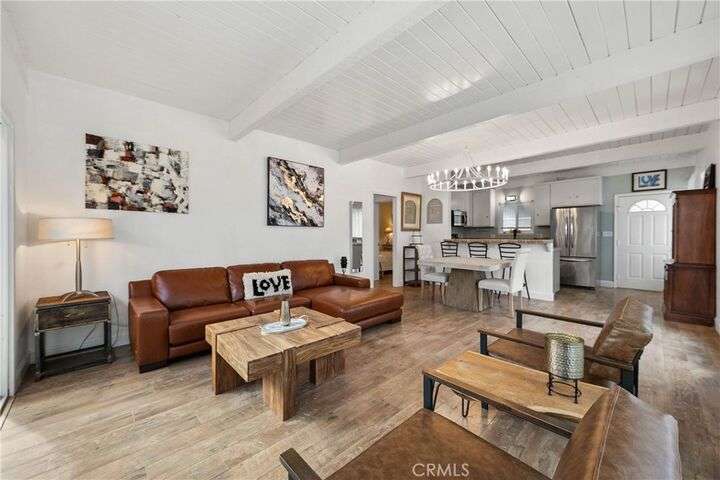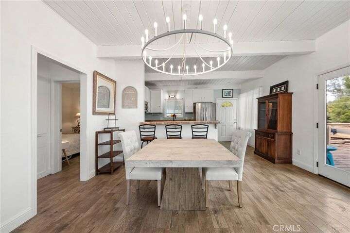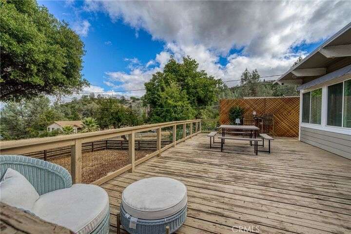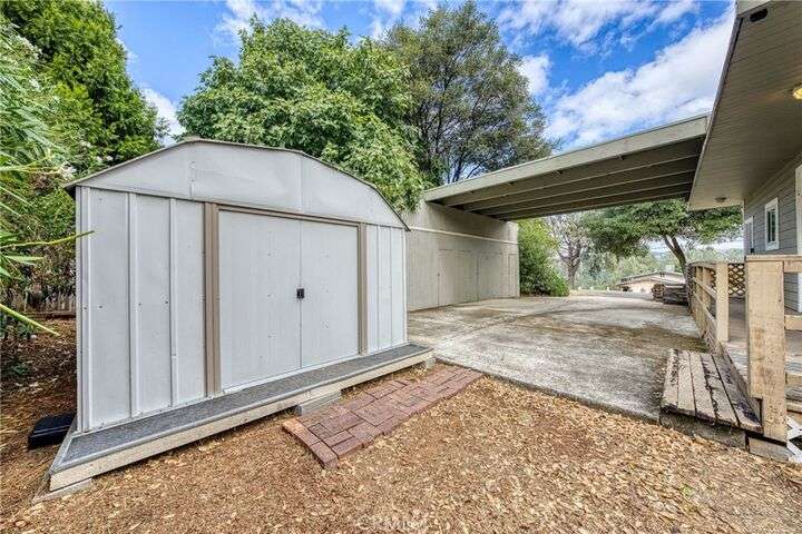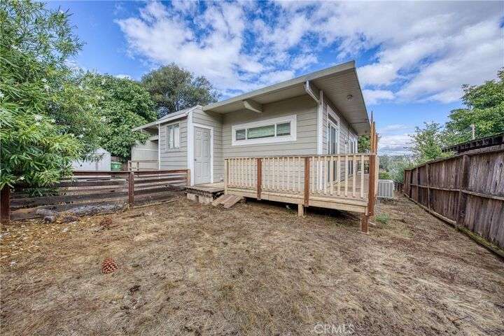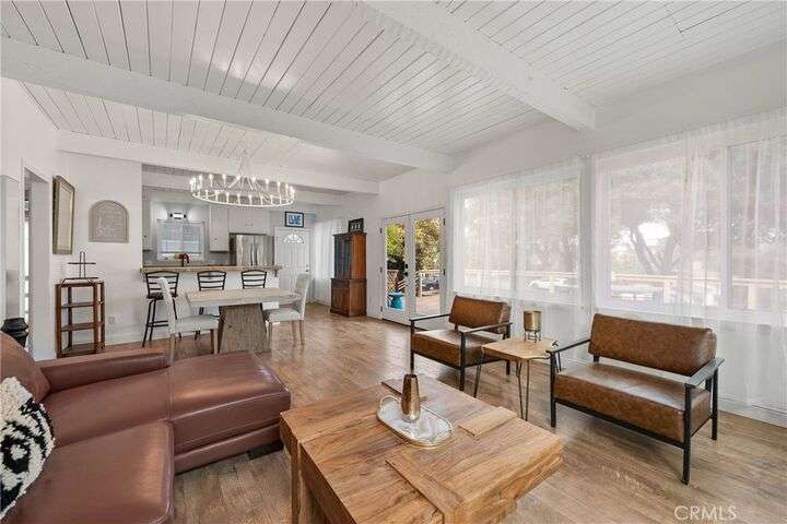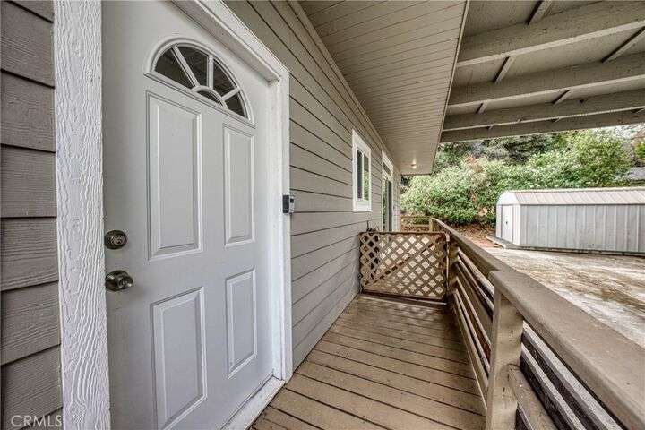 This charming modernized single-level mid-century style lake view home that has been recently upgraded to reflect modern styling. The home features new windows and French doors, laminate flooring throughout, and a light-filled great room with exposed beams and doors that open to a large front deck overlooking the lake. The modern kitchen is equipped with bar counter seating and tile countertops. The stainless steel appliances include a propane range, microwave hood, and refrigerator. The integrated dining room is elevated by a modern chandelier and is located off the French doors that lead to the wrap-around style deck, perfect for entertaining and barbecues. The residence includes two bedrooms that offer slider doors to the wrap around style deck, the rooms are full of natural light. The bathroom was updated with a walk in tiled shower, wainscoting and a single furniture style vanity. Outside, you will find an attached carport with built-in storage, a laundry room and a long, flat driveway that accommodates many cars. The front yard is fenced and is graced by oak trees and nature sightings. Located in Kelseyville Riviera, the home is close to schools, shopping, and the lake. Enjoy country living in a centrally located community in Lake County, California, just 2.5 hours from San Francisco and 2 hours from Sacramento.