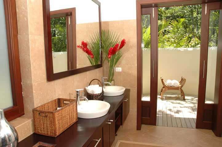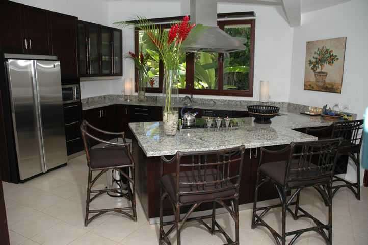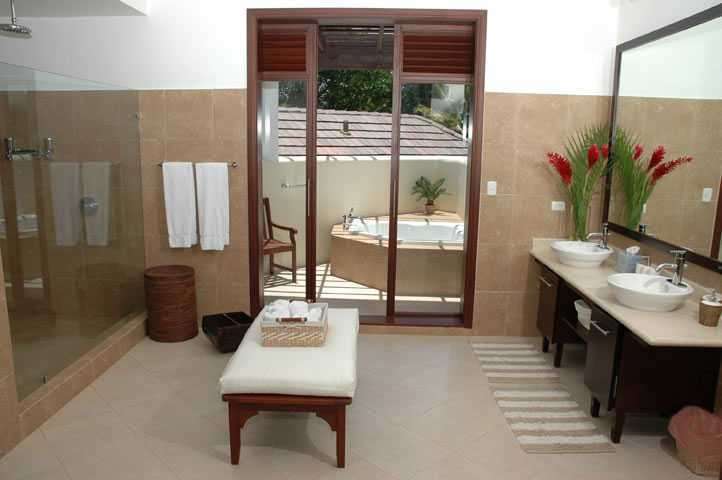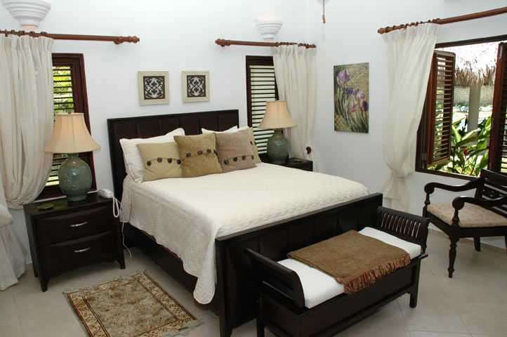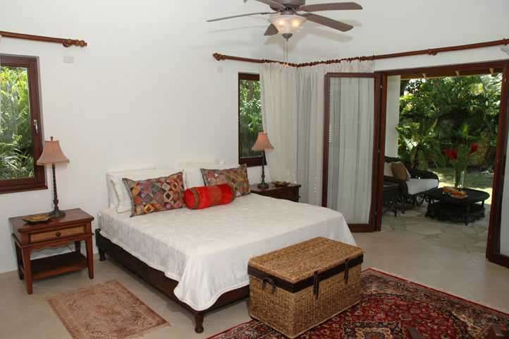The second master is located in a separate guest house connected by a thatched roof walkway. Two additional large bedrooms are located in the main house on the first floor and have queen-size beds and private baths, one with both inside and outside showers.