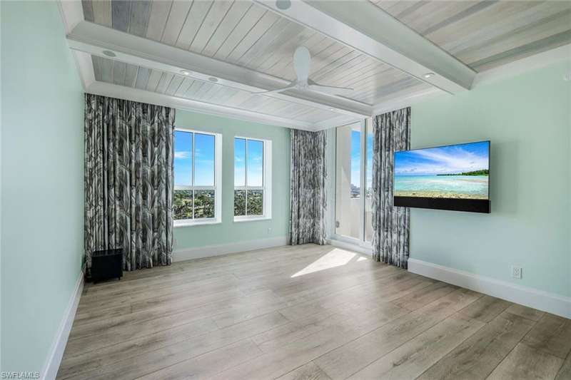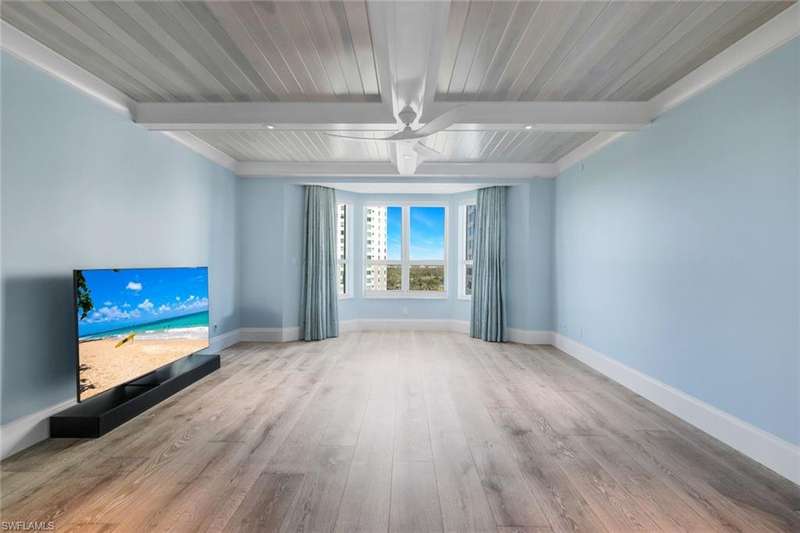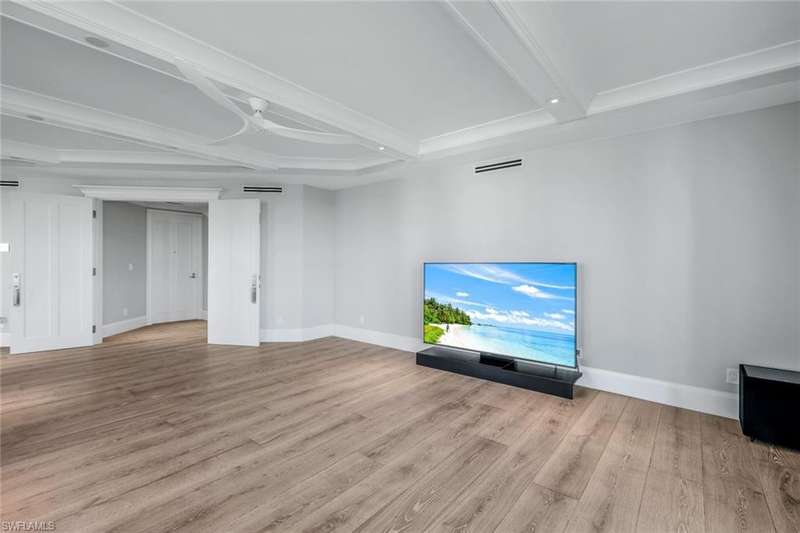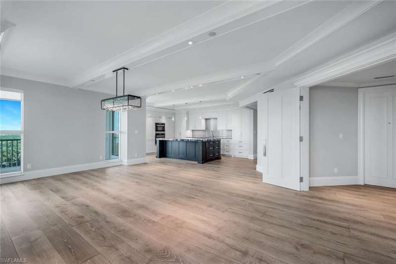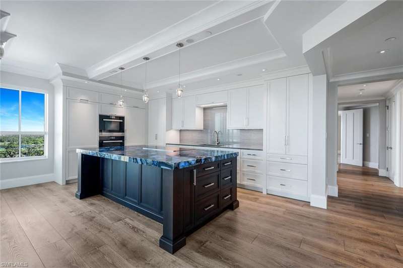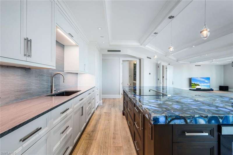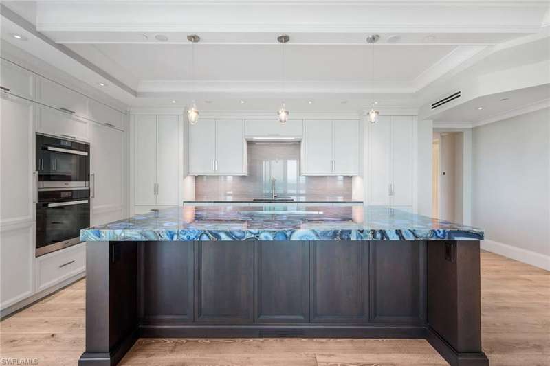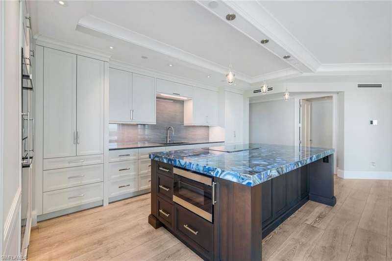 Experience the epitome of luxury living in this totally reimagined, one of a kind, 3 bedroom + den residence. With incredible water views. This Grande Preserve residence features Legno Bastone flooring and extensive coffered ceilings throughout. The chef s dream kitchen boasts a separate full-size freezer and refrigerator, wine cooler, induction cooktop, and an under-lit Antolini Blue Agate island countertop that serves as a striking centerpiece. The spa-like primary bathroom offers ultimate relaxation with a jetted tub and steam shower, while all en-suite bathrooms have been fully remodeled with new cabinets, sleek showers, and under-lit vanities, showcasing impeccable attention to detail. A large wrap-around lanai with sliding glass doors offers an incredible entertainment space featuring an electric grill, perfect for hosting friends or enjoying a quiet retreat. This serene outdoor area provides breathtaking views of Turkey Bay & the Gulf of Mexico, making it an ideal spot to rela