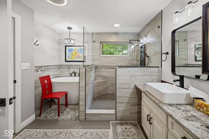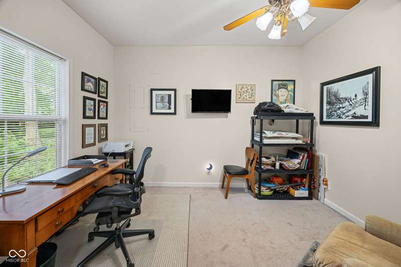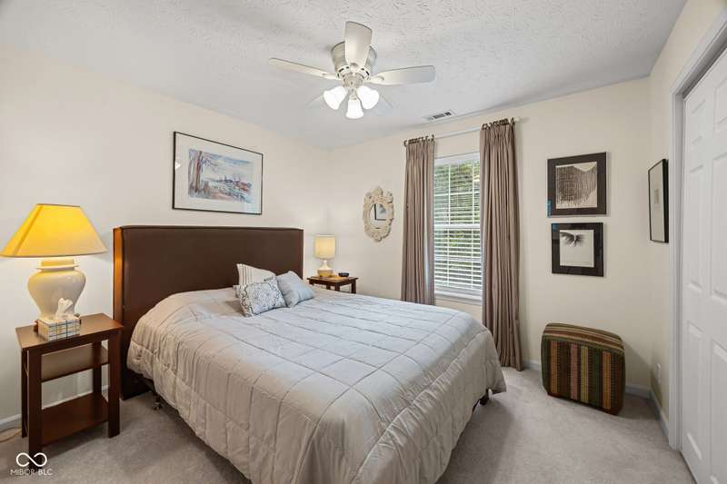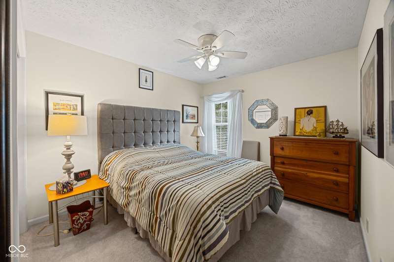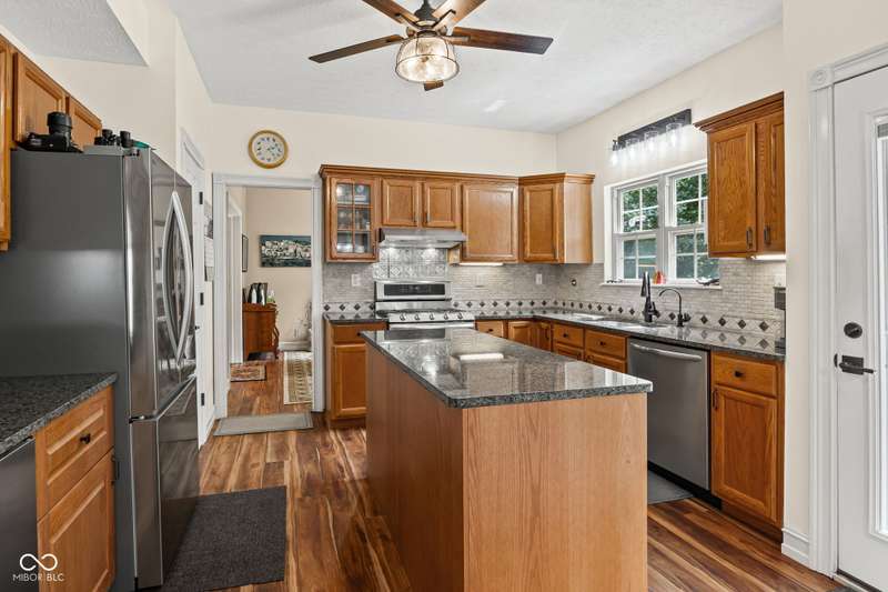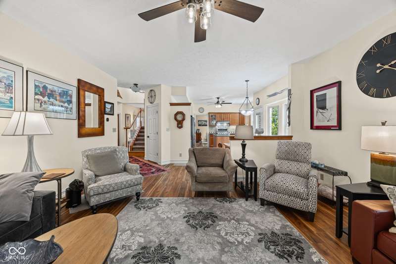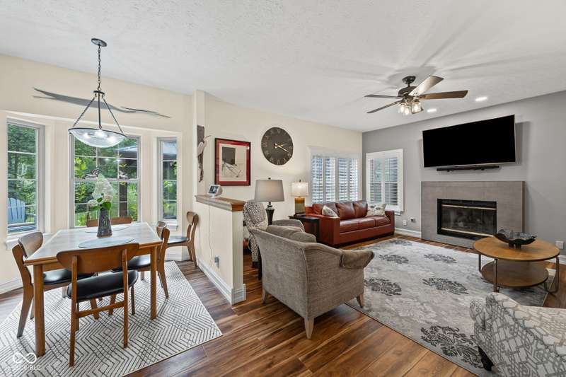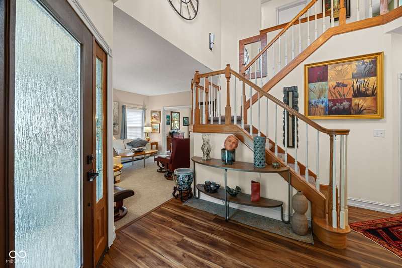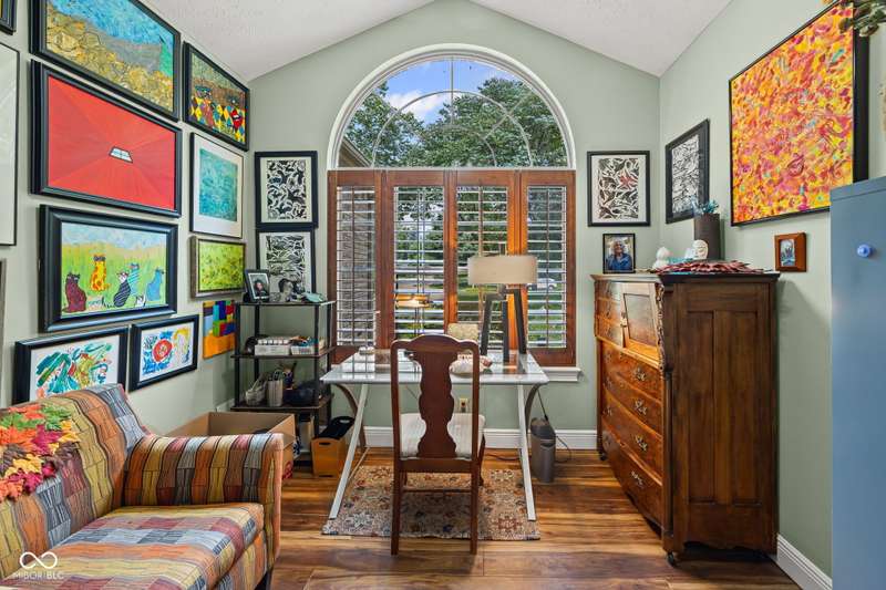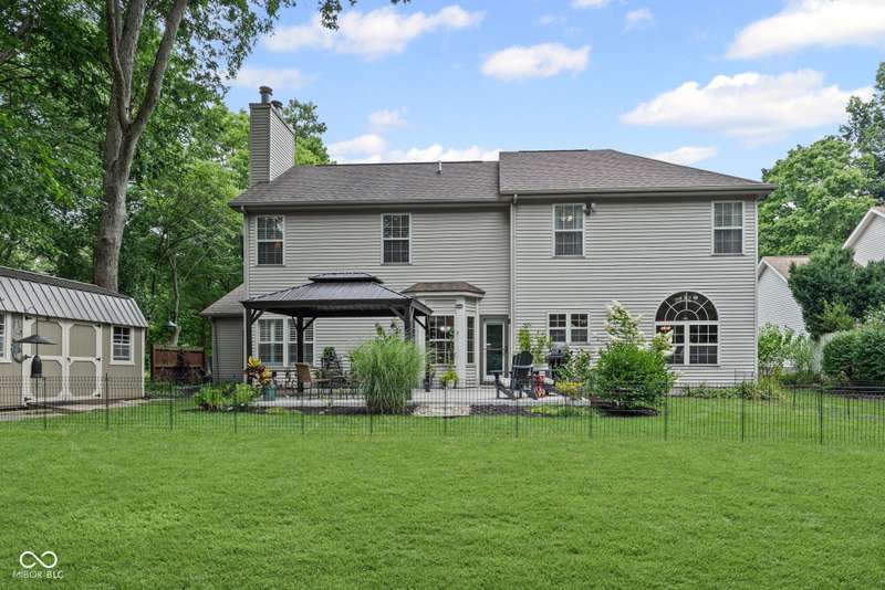 Beautiful South side home! Foyer entry with open staircase and main level den with built ins. Formal living room & dining room. Family room with gas fireplace, vinyl plank flooring and plantation shutters. Main level bedroom and full bath. Spacious kitchen with center island, beverage fridge, double ovens, gas stove & ample storage. King-size primary suite with gas fireplace, soaking tub, dual sinks & private stool. Walk in closet leads to massive room over garage with laundry area. Fabulous, wooded lot with patio & pergola with fan and shed. 3rd bay of garage utilized as workshop.