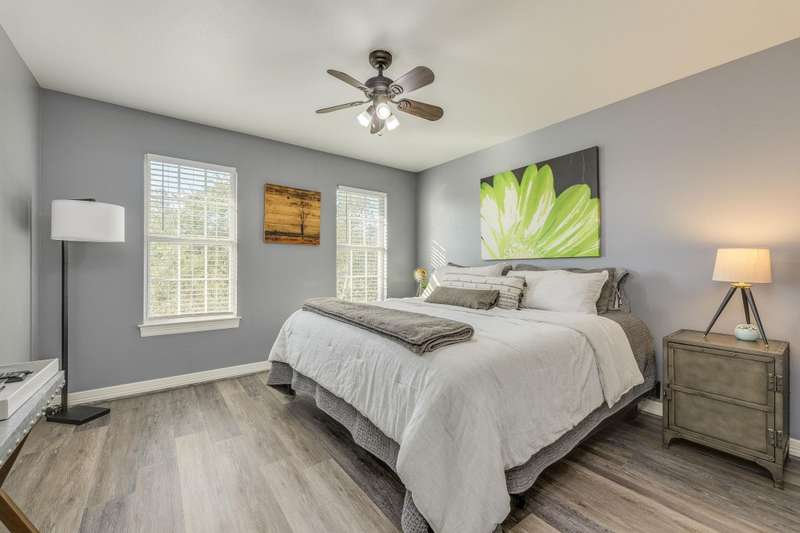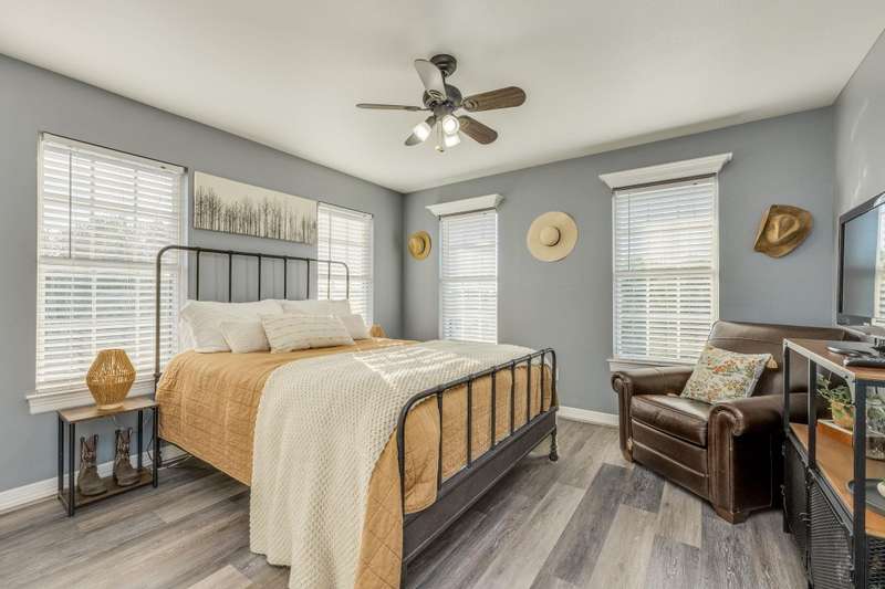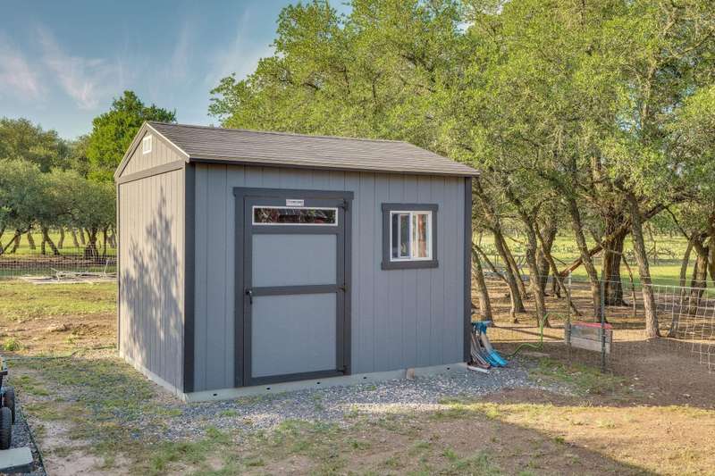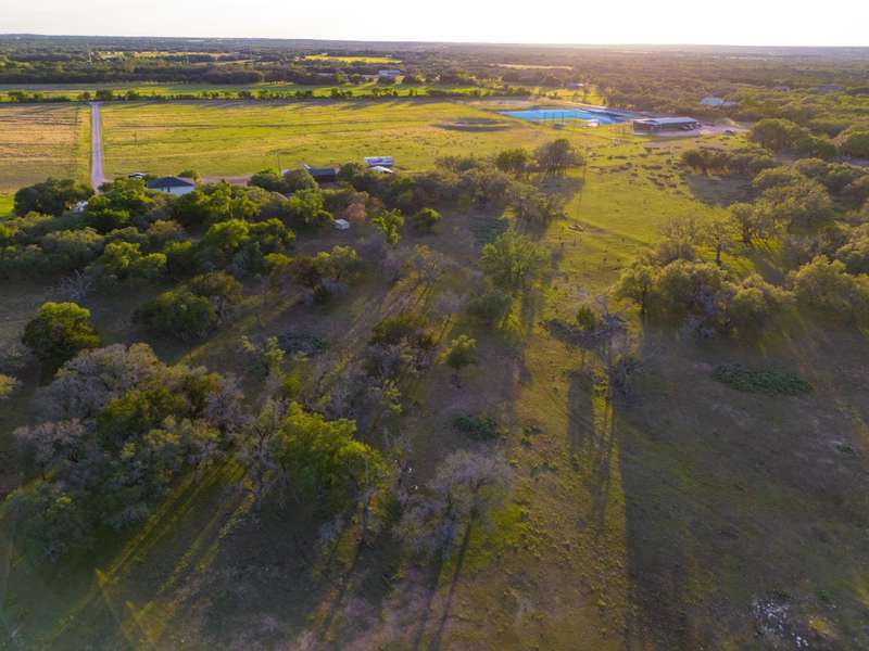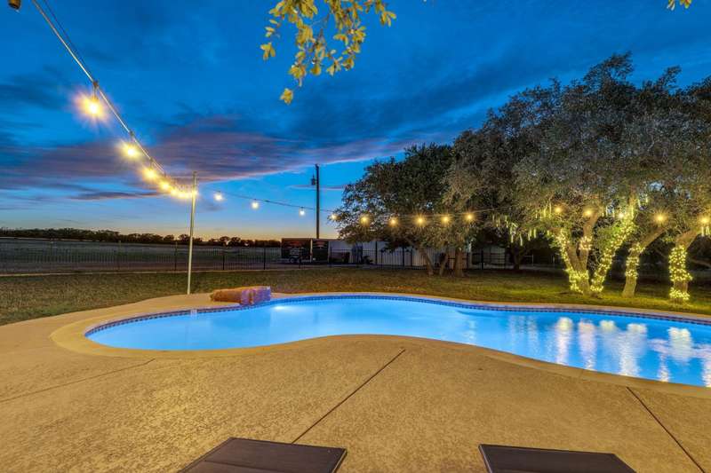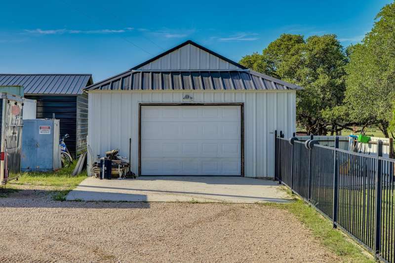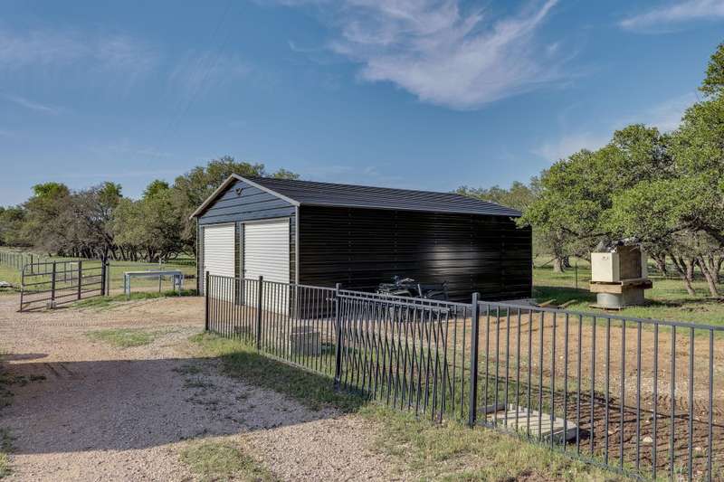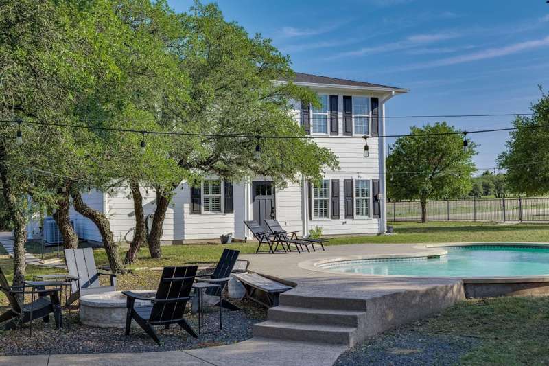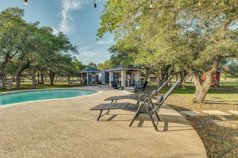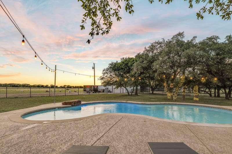 Enjoy an exceptional Hill Country lifestyle on this Unrestricted Ag-exempt 32.45-acre property, complete with a sparkling in-ground POOL and a beautifully designed 3 Bed/3.5 Bath colonial-style home offering 2,575 sq ft of thoughtfully crafted living space over 2 floors. From the moment you step inside, soaring ceilings and warm wood-look tile floors welcome you into an oversized family room, perfect for hosting gatherings or simply relaxing in comfort. The open-concept design flows seamlessly into the kitchen & dining area, where entertaining comes easy. The kitchen features painted white cabinetry, granite countertops, a beamed ceiling, and a large center island with pendant lighting—ideal for both cooking and conversation. The spacious primary suite is located on the main level and offers enough room for a sitting area or a dedicated workspace. Step outside to enjoy a morning swim or unwind with a midnight dip in your private POOL. The ensuite bathroom includes a soaking tub, separate walk-in shower, dual vanities, & a large walk-in closet with convenient washer & dryer hookups. Both W/D sets will convey. Upstairs, 2 additional bedrooms each feature private bathrooms, along with a versatile bonus/flex room, ample storage space, and a second laundry area. Outside you will find: Pool with stylish bar area, full pool bath with shower, separate large outbuildings/garages (one is currently in use as a workshop with a window air conditioning unit installed), a double carport, storage shed, animal barn, 2 corrals, 3 animal shelters, 3 self-watering troughs, a 40-50 gpm well, 2 septic systems (add a guesthouse!), perimeter fencing, whole house water filtration. Goats and donkeys can convey. This is your chance to own a slice of hill country heaven...don't let this opportunity pass you by!