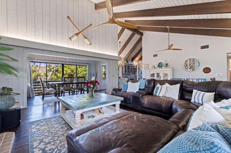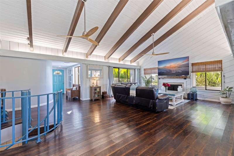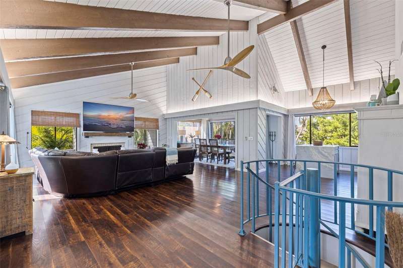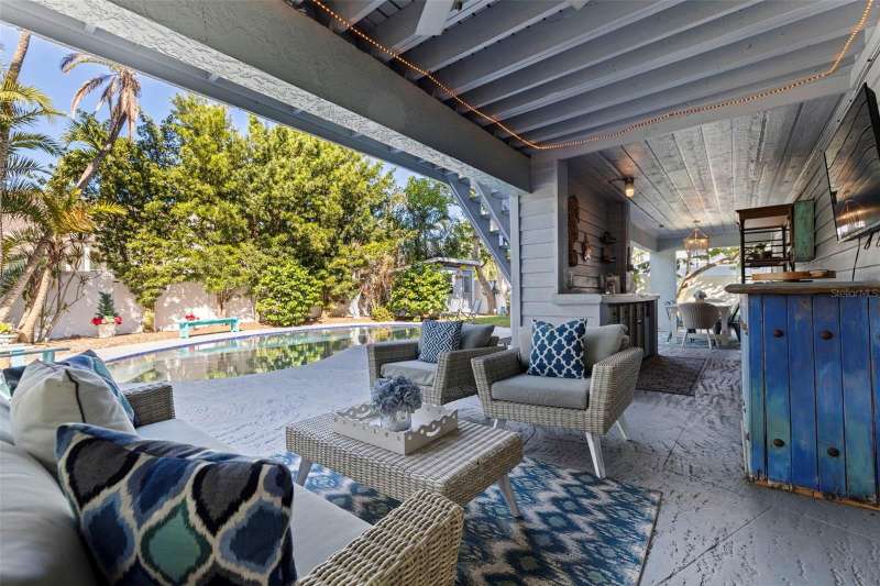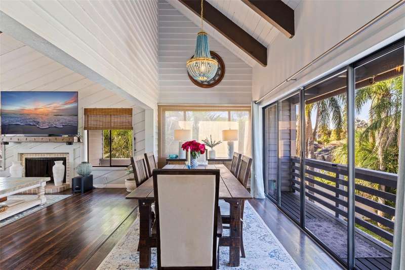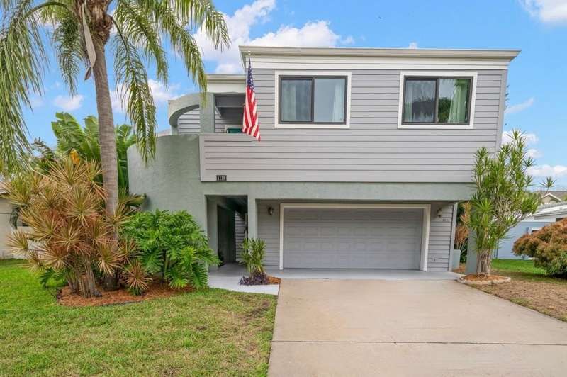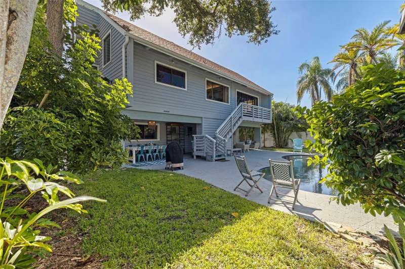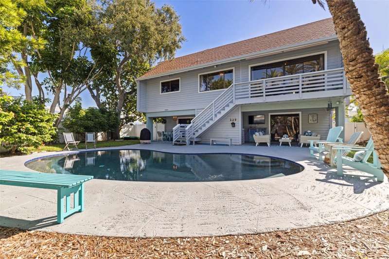 Experience true Florida living in this coastal, move-in ready, high & dry, two-story home located in Tierra Verde’s highly sought-after Sands Point neighborhood. Set in a quiet yet very vibrant and active waterfront community, this residence offers comfort, privacy, and peace of mind, having remained completely dry through the recent hurricanes. The welcoming, light blue front door opens to soaring ceilings with exposed beams, wood-look luxury vinyl floors, and abundant windows that fill the home with natural light. A sliding door connects seamlessly to the pool area, creating an easy indoor-outdoor flow. The main upper level offers a spacious living room featuring a wood-burning fireplace and a cozy formal dining corner, blending into the stunning updated kitchen. The kitchen showcases elegant countertops, ample cabinet space, and a sleek island that connects the dining and kitchen areas while offering convenient casual counter seating. Around the corner a spacious guest bedroom with dramatic ceilings, a full closet, and a beautifully updated bath. The expansive primary suite on the east side features an office nook or space to expand the already generous walk-in closet, plus a stunning ensuite bath with an oversized walk-in shower. The lower level is accessible via staircase and offers another private bedroom with ensuite bath. There is a bonus family/playroom with walkout access to the pool, and a two-car garage with laundry area, an additional refrigerator, water softener, and plenty of storage. In addition to the garage parking, the large driveway provides convenient space for multiple cars, perfect for extended family and guests. Out back, enjoy a fully fenced oasis with in-ground pool, ample space for entertaining, a setup ideal for an outdoor entertaining kitchen, plus a shed tucked in the corner for tools and water toys. The landscaping is low-maintenance, lush, and private, perfectly embracing the Florida lifestyle. This property is also ideally located—just a five-minute bike ride on the local trail to the sandy white beach of Fort DeSoto, and the dog park. Located less than 15 minutes to downtown St. Petersburg, with easy access to I-275 and only 40 minutes to Tampa International Airport. You’re also within walking distance to Island restaurants and local shops and many local fishing spots. Schedule your private showing today! Stylish, comfortable, and thoughtfully updated—this is a home that truly feels like home.