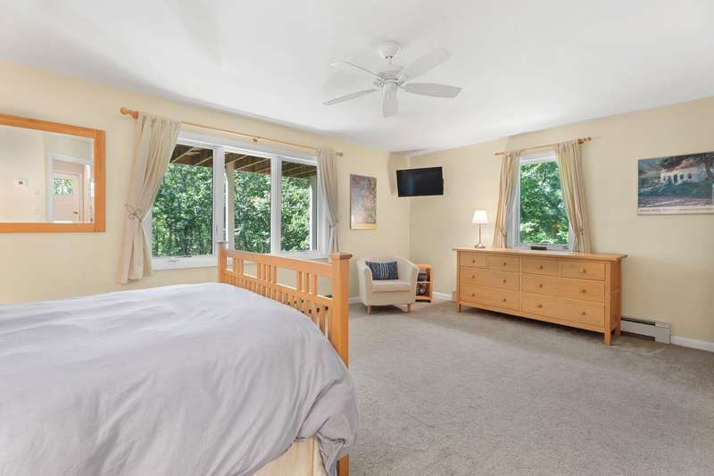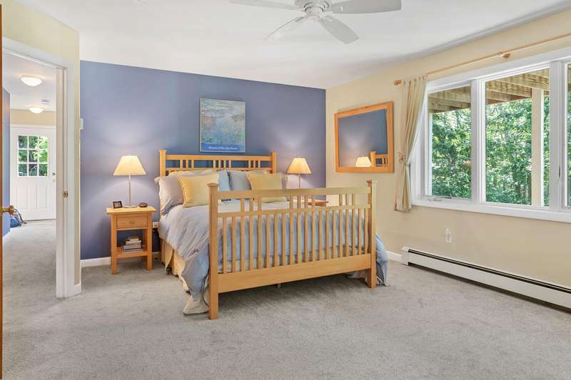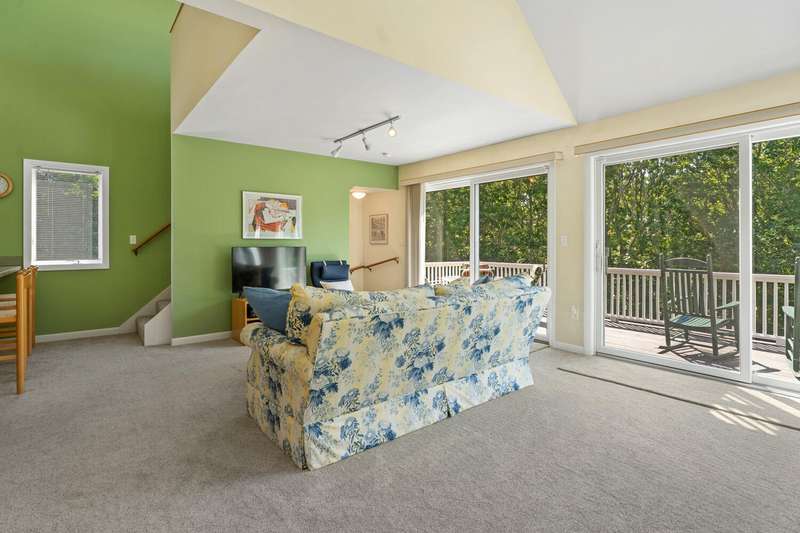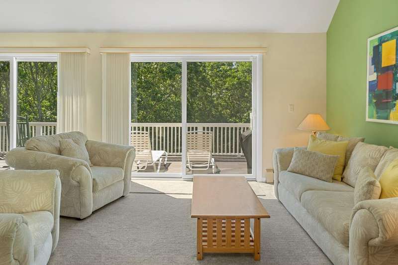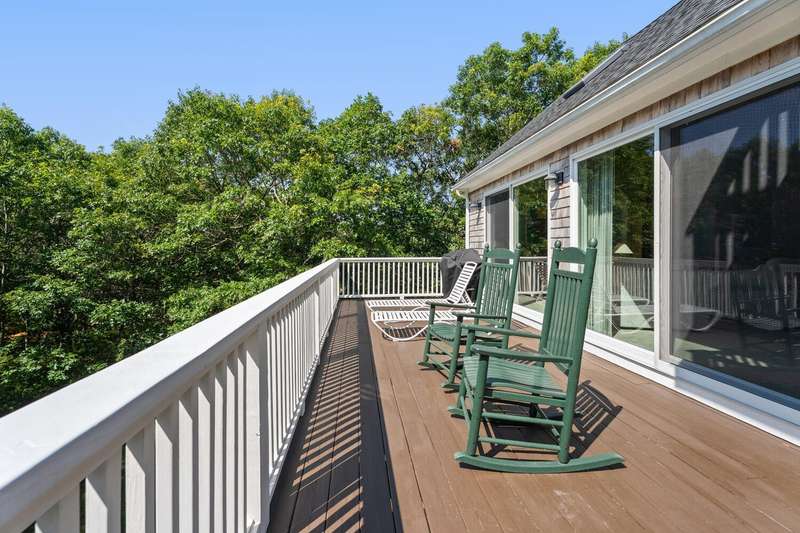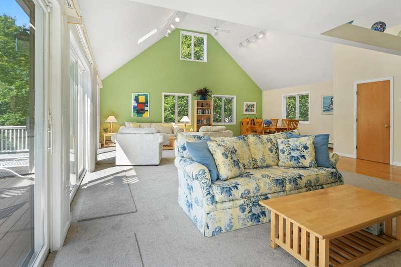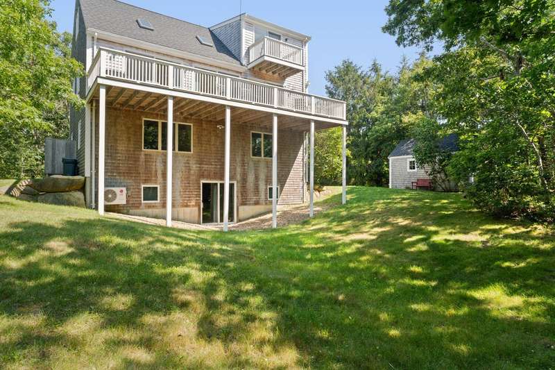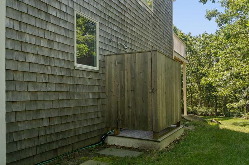 Nestled in a tranquil residential neighborhood, at the top of a curved drive through beautiful trees, this well-maintained home in move-in condition offers an idyllic Martha's Vineyard lifestyle. Custom-built for quality and convenience by a prestigious Island builder, every detail was thoughtfully planned for exclusive use by the family as a cherished year-round vacation home. The open floor plan centers around the bright second-floor great room illuminated by skylights in the cathedral ceiling, and a wall of sliding doors leading to a large deck overlooking lush green treetops with grill and dining areas for al fresco entertaining. A third-floor loft provides overflow for guests or a lounge area with its own balcony for sunbathing or stargazing. The entry level includes a large primary bedroom with an en-suite bath, a convenient laundry alcove, and two additional bedrooms with a shared bath and soundproof insulation. New mahogany outdoor shower and shingles, recent carpet, roof and skylights are just a few of the improvements. A generous .92-acre lot offers peace and privacy, and the walk-out basement allows for future expansion within the existing footprint to take full advantage of the 7-bedroom capacity with permitting and a tie-in to the available sewer connection. Cycle easily to Edgartown Village or up-island on the nearby bike paths including the Meetinghouse Way bike path leading to South Beach. A detached Salt Spray car barn and a beautiful landscape with lawns, giant blue Hydrangea and a trellis with flowering Clematis vine complete the property.