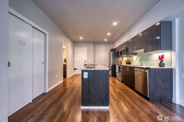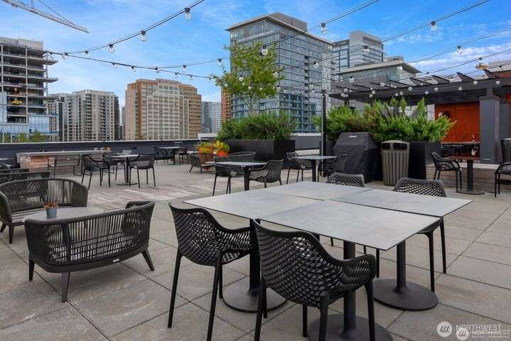 Luxury and convenience converge in the heart of downtown Bellevue. This modern light-filled condo built in 2008, features quartz countertops, stainless steel appliances, a center island, and sleek cabinetry with under-cabinet lighting with A/C port for year-round comfort. Entertain or relax on the rooftop deck with panoramic views, BBQs, fire pit, lounge seating, and pet area. Community amenities include concierge, club room, dog wash, bike storage, and secured garage parking. Step outside your door to Bellevue Square, world-class dining, cafés, and parks. With no rental cap and a reliable tenant in place, this is a turnkey home or investment.