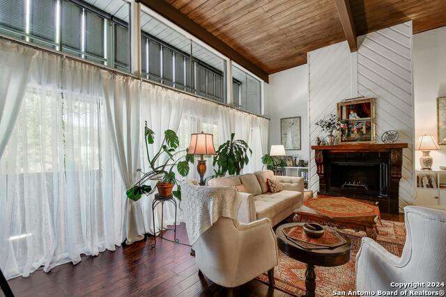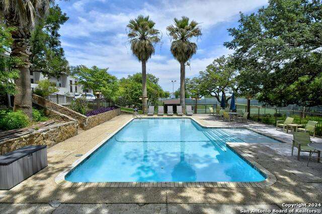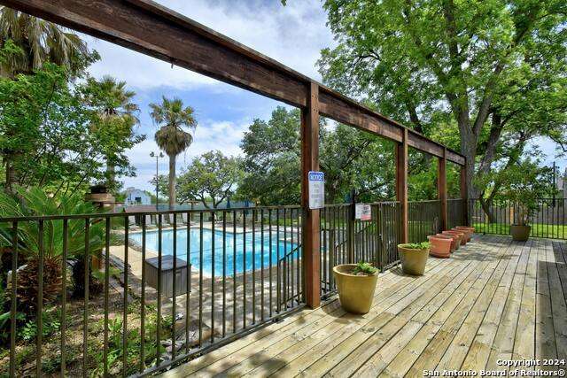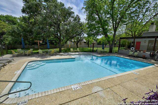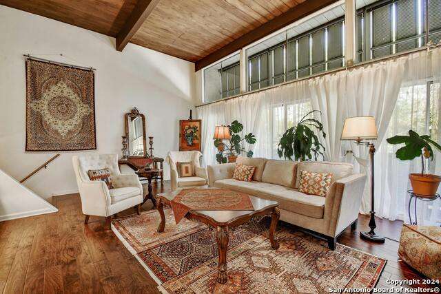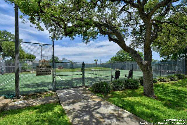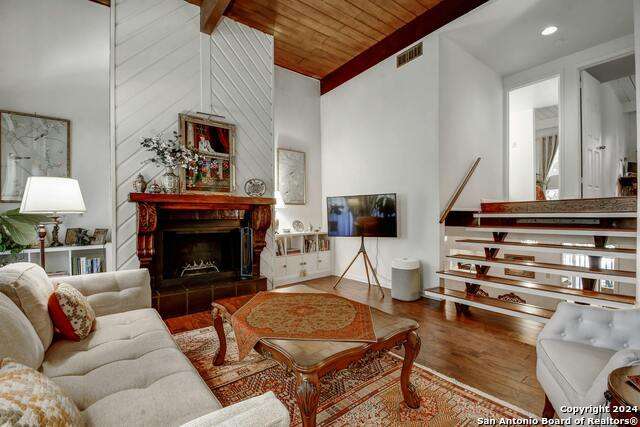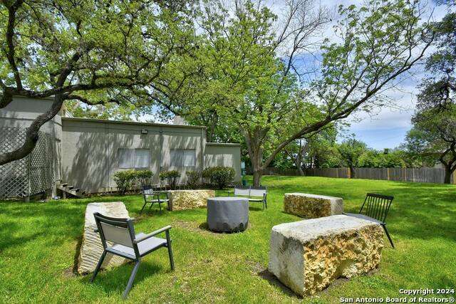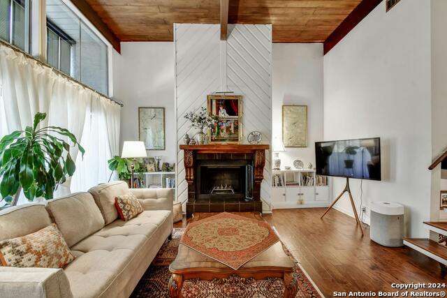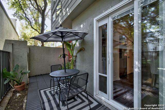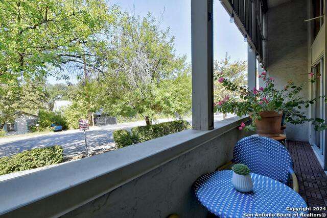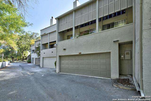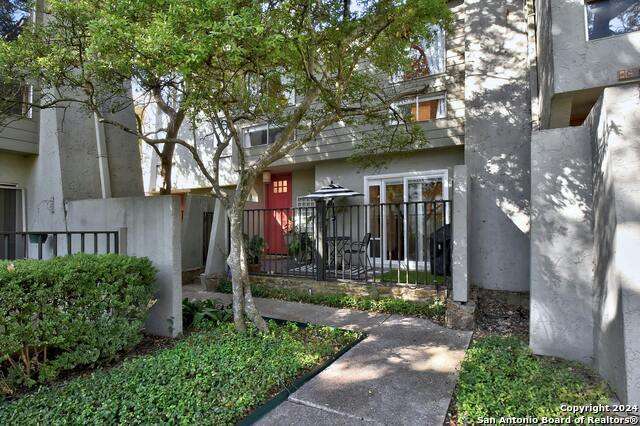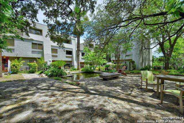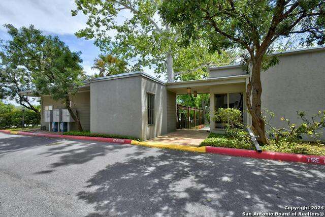 Open House 10/13 3-5 pm. Discover this stunning mid-century modern home, brimming with space and amenities. Enter through a private gated patio or the attached two-car garage. Inside, you'll find soaring 13' ceilings in the main living area, complete with an oversized wood-burning fireplace, ample wall space for art & hanging decor, and abundant natural light. The private kitchen features updated appliances, stylish light fixtures, freshly painted cabinets with new hardware, backsplash, along with access to the first-floor patio. The home boasts beautiful wood paneling accents on the walls & ceilings, two full baths, and a half bath for guests on the first floor. The second floor offers an extended balcony overlooking Pike Road, and the entire residence is carpet-free. Nestled in a tranquil corner of Terrell Heights, it provides quick access to Harry Wurzbach and Austin Hwy. The Woodbridge Condominiums include amenities such as pools, a clubhouse, an enclosed dog park, a koi pond, mature trees, and courts for basketball, pickleball, and tennis, along with exterior maintenance services. Recent upgrades include remodeled modern bathrooms, patio doors, HVAC system updated in May 2024, Roof 7 years old (60 mil GAF Everguard TPO). Enjoy evenings and down time in the multiple outdoor spaces of the home or community, or strolls throughout the neighborhood and nearby shopping & dining. From the red door entrance to the floating steps and wood carved mantle, this home comes to life with unique characters at every turn.
